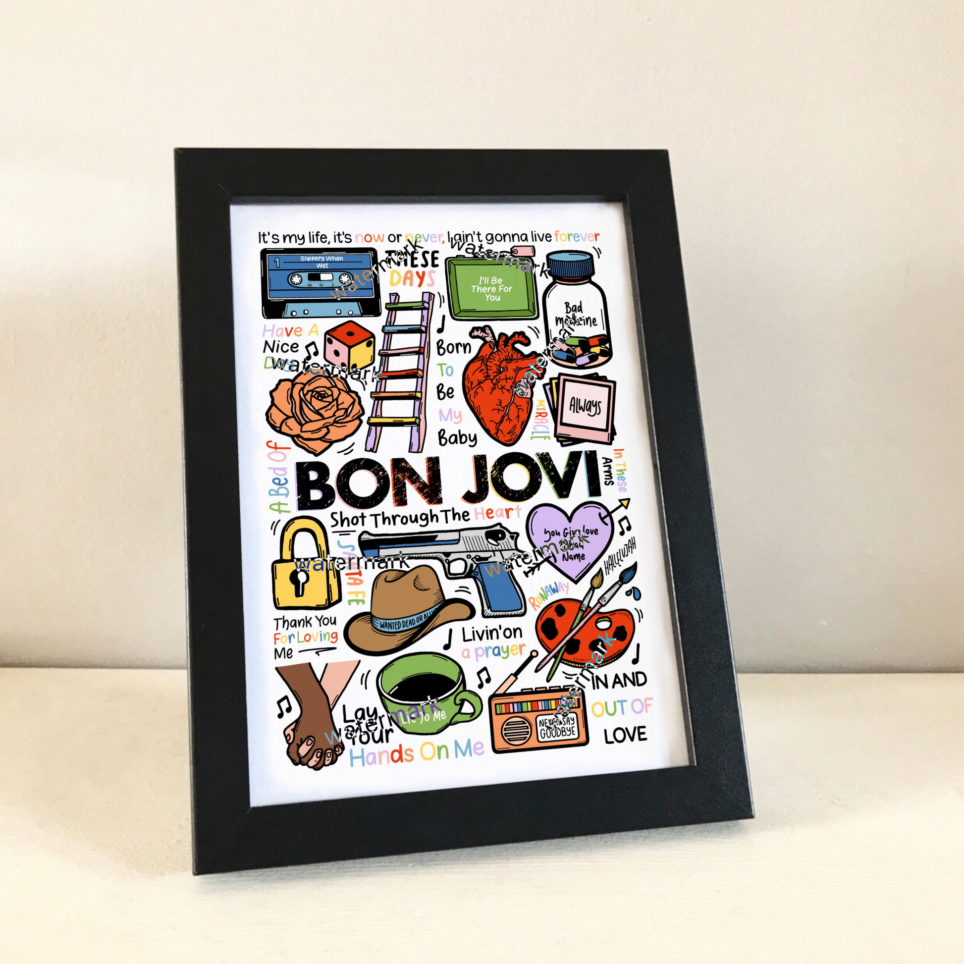 🎶Impresión del póster de Bon Jovi creada con un iPad y un Apple Pencil. Incluye imágenes y letras de canciones de sus álbumes como New Jersey, Keep The Faith, Slippery When Wet y Crush.