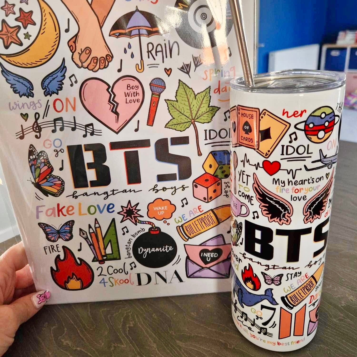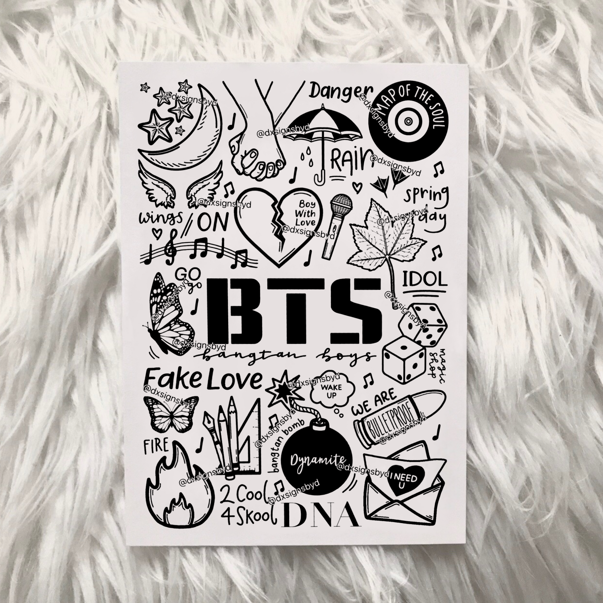 🎶 Afiche de Bangtan Boys con imágenes y letras de canciones de sus álbumes como Map Of The Soul: 7, BE, Wings, Love Yourself: Tear, Skool Luv Affair, Dark & Wild, Face Yourself, Wake Up y You Never Walk Alone . Además de canciones como Dynamite, Butter, Boys With Luv, Life Goes On, Fire, IDOL y Euphoria.