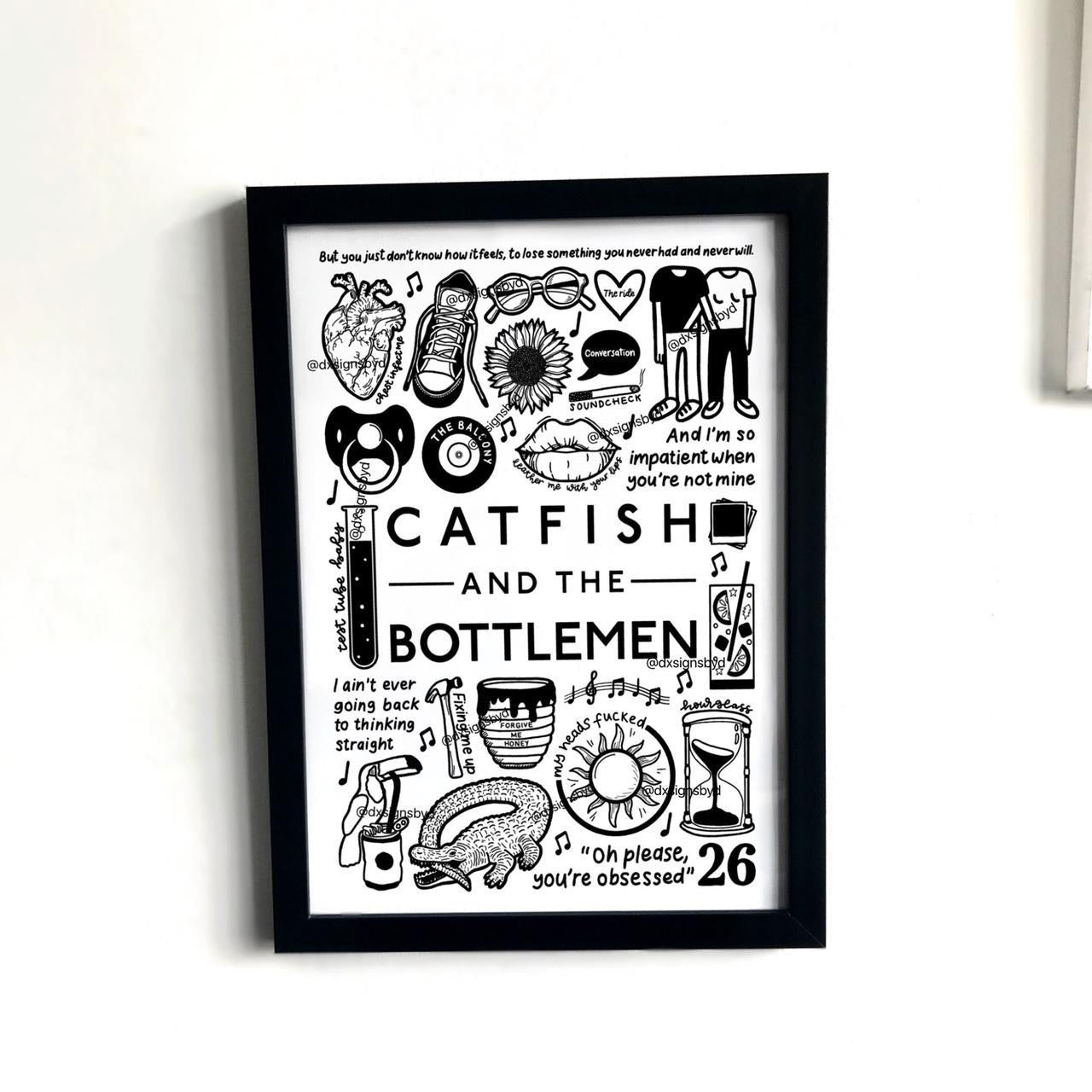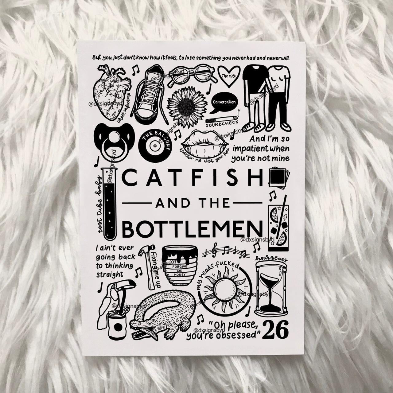 🎶Póster de Catfish que incluye imágenes y letras de canciones de sus álbumes The Balcony, The Ride y The Balance.