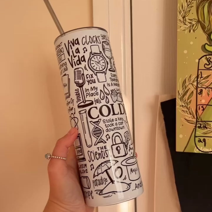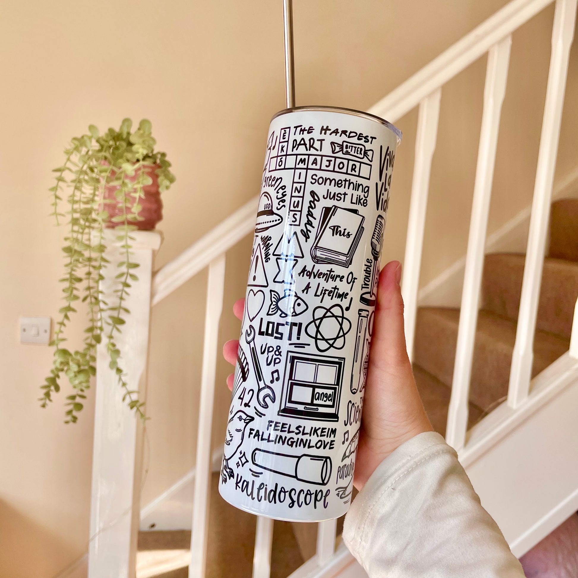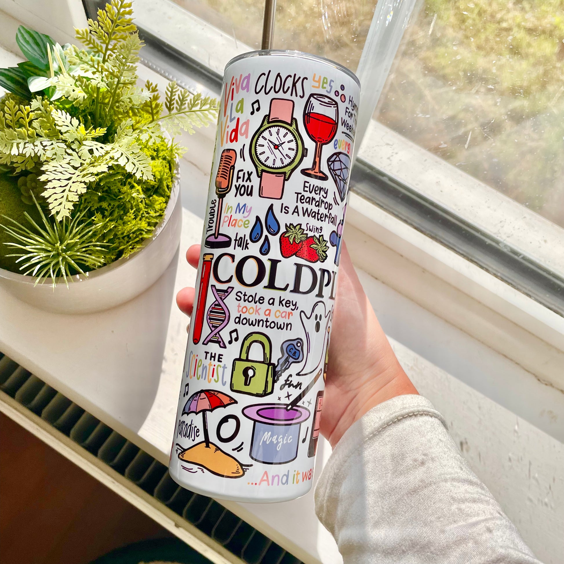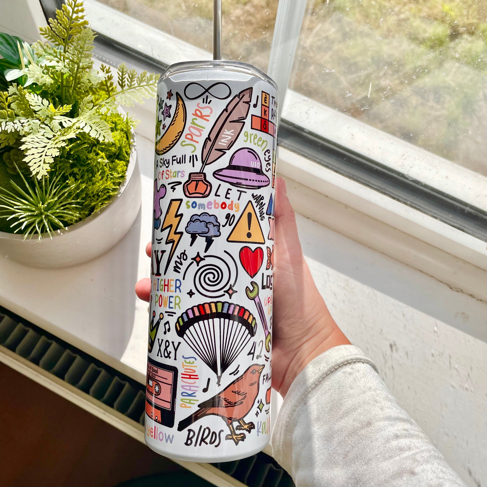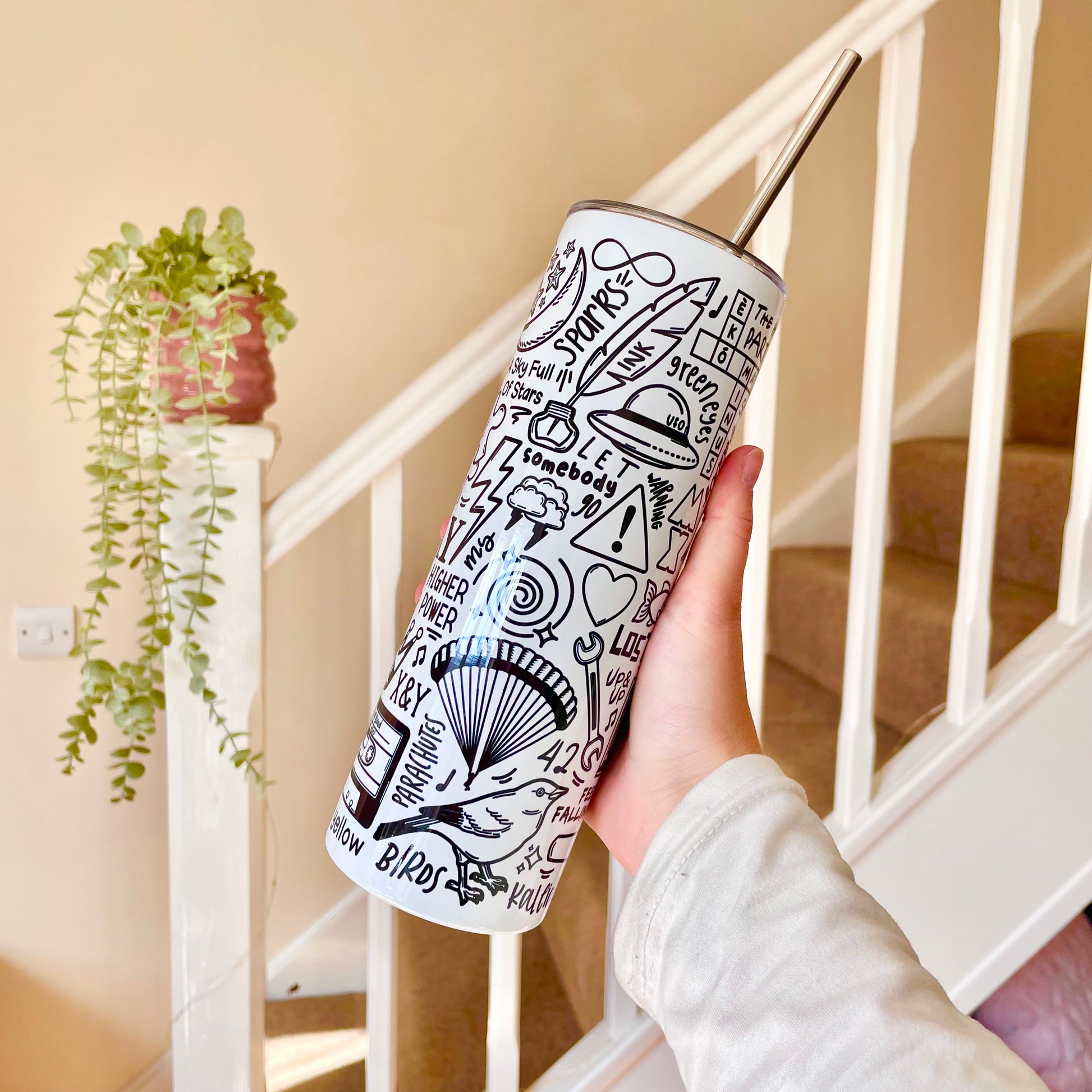 🥤Get lyrical with your beverages with our travel drinks cup! This versatile Coldplay cup keeps your drinks hot OR cold and your spirits high with fun lyrics and drawings printed all around the cup. Stay hydrated (and entertained) on the go with our tumblers🥰