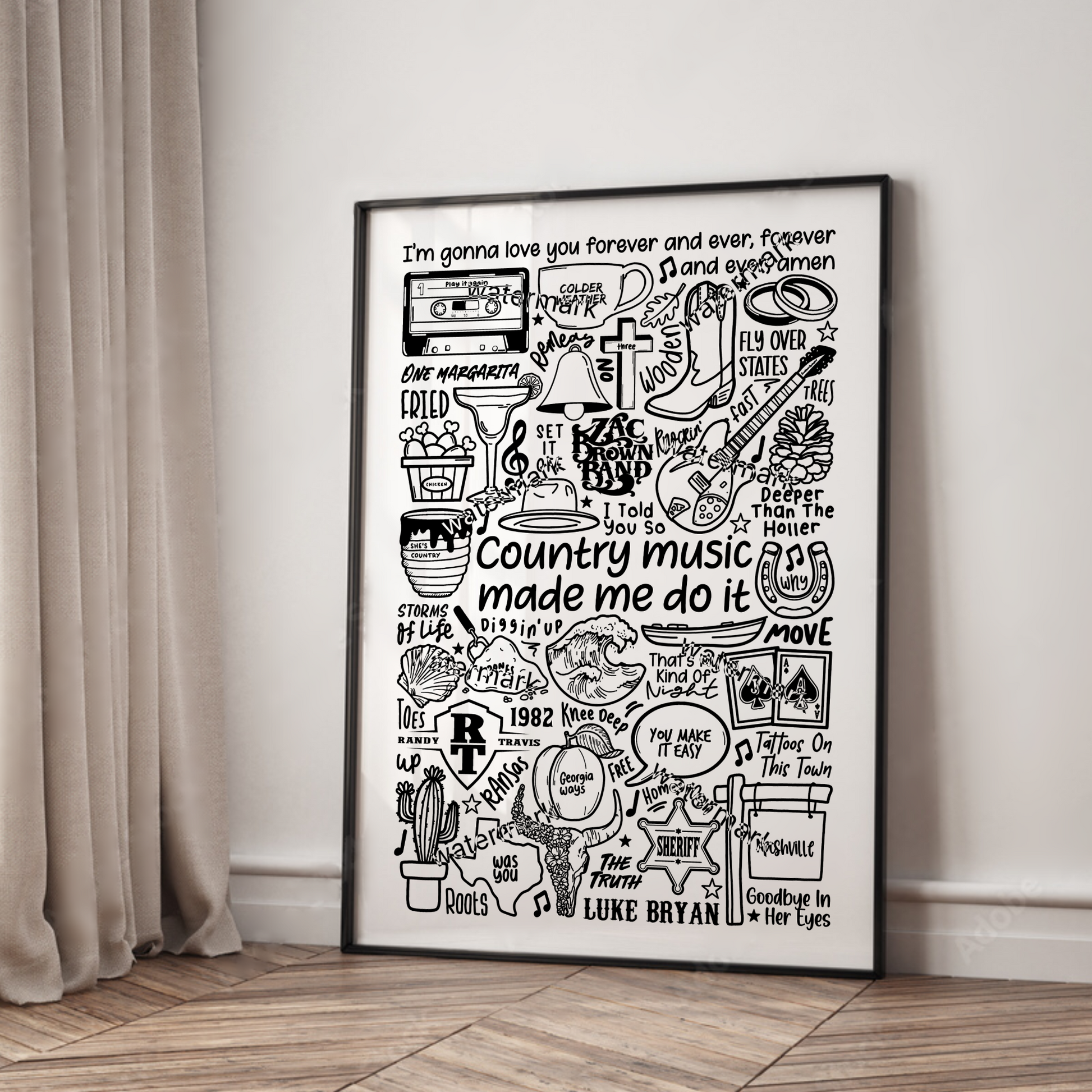 🎶Country music wall art including images, lyrics, and song titles from various country artists.