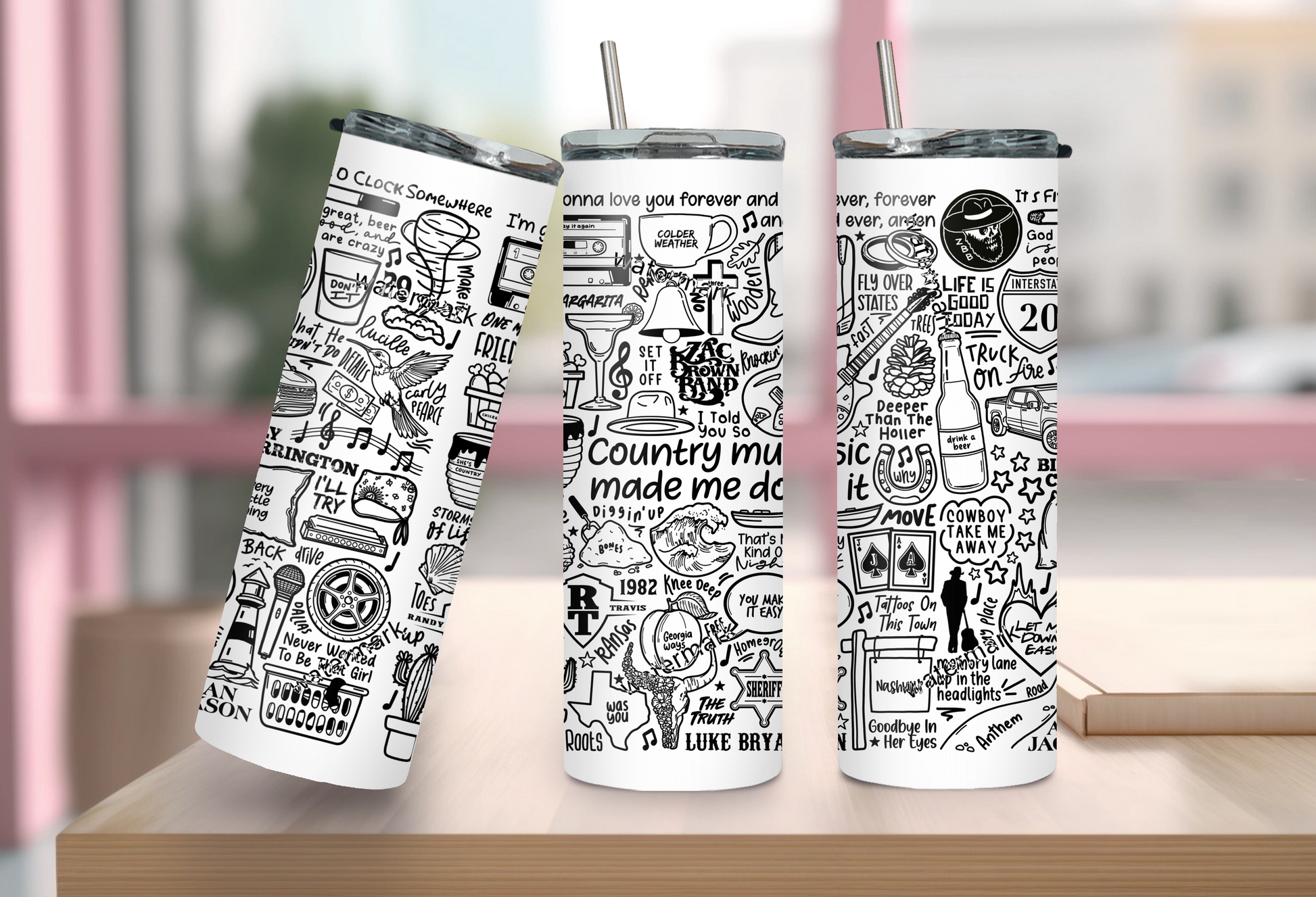 🥤Get lyrical with your beverages with our Country music travel drinks cup! This versatile cup keeps your drinks hot OR cold and your spirits high with fun lyrics and drawings printed all around the cup. Stay hydrated (and entertained) on the go with our tumblers🥰