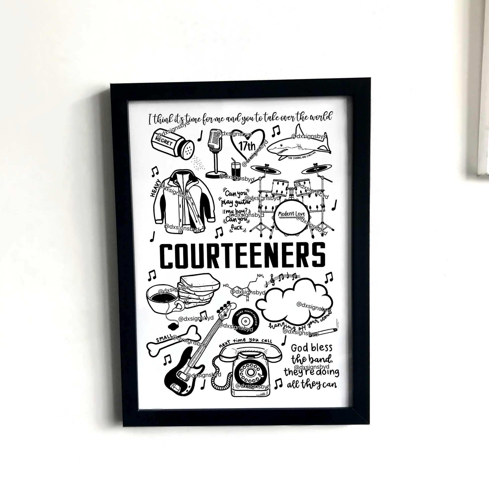 🎶Póster de Courteeners con imágenes y letras de canciones de sus álbumes como St. Jude, Falcon, Anna y Concrete Love.