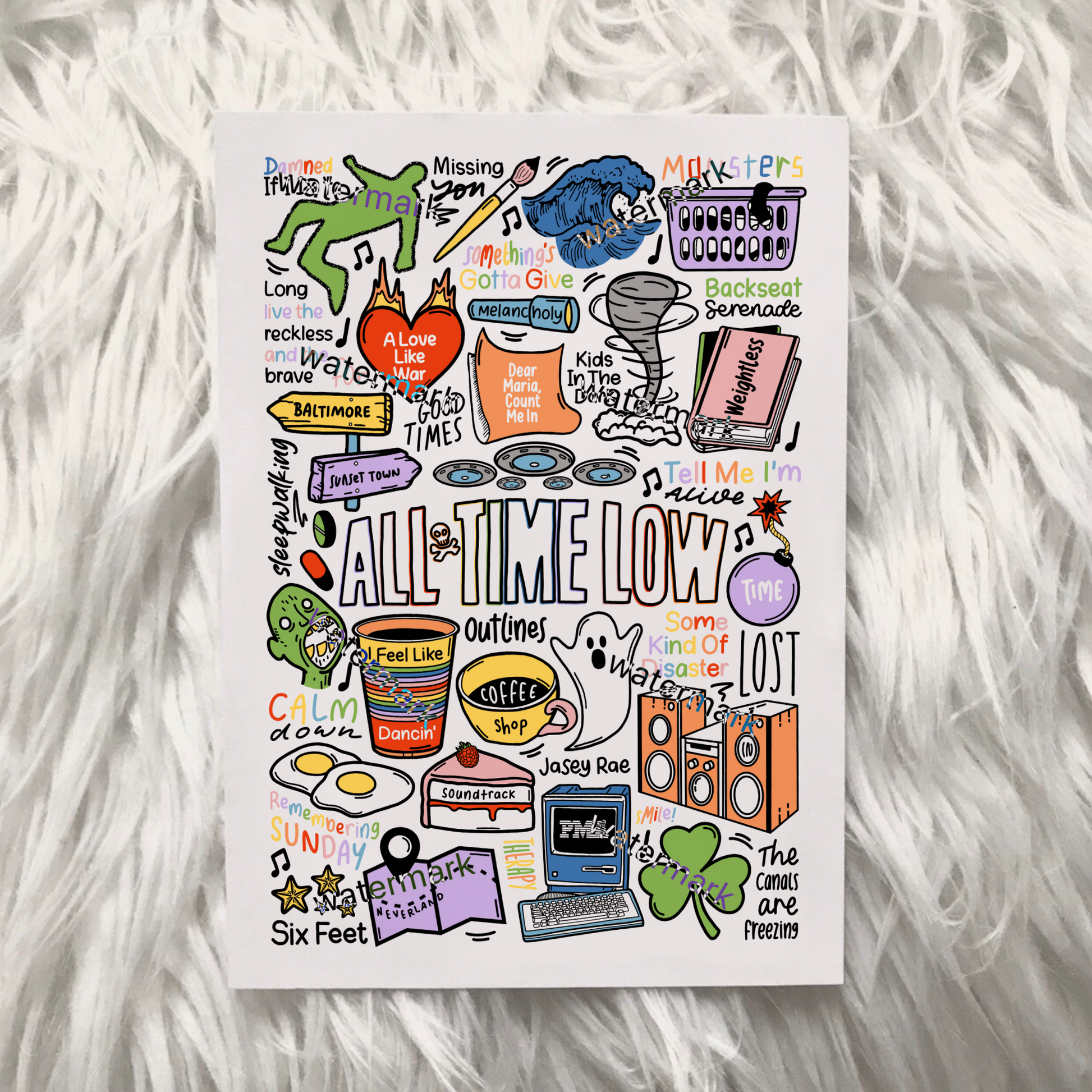 🎶 Póster de All Time Low que incluye imágenes y letras de canciones de sus álbumes.