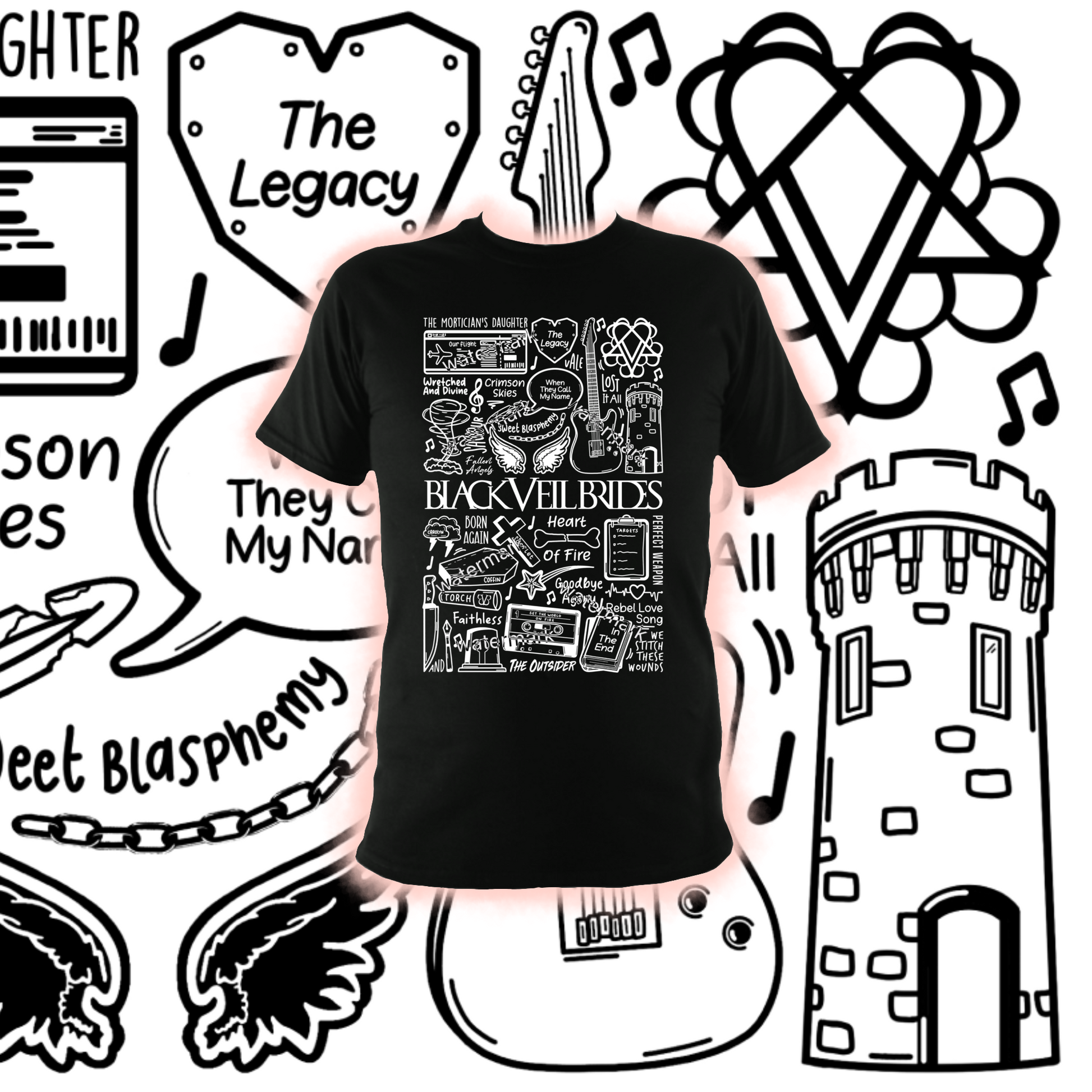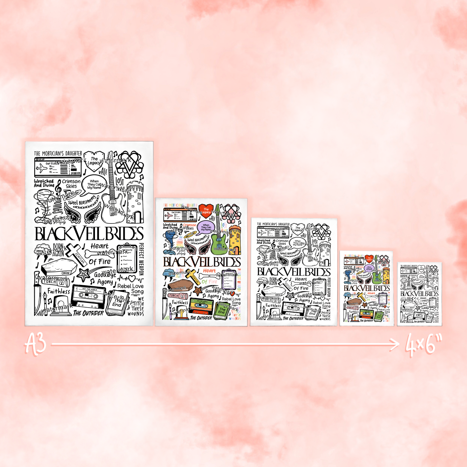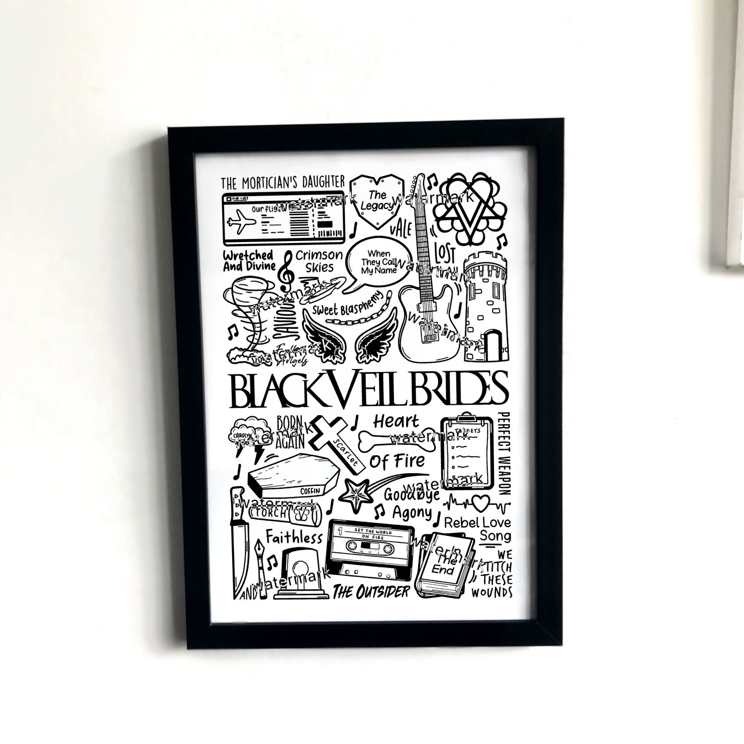 🎶 Impresión del póster de Black Veil Brides que incluye imágenes y letras de canciones de sus álbumes.