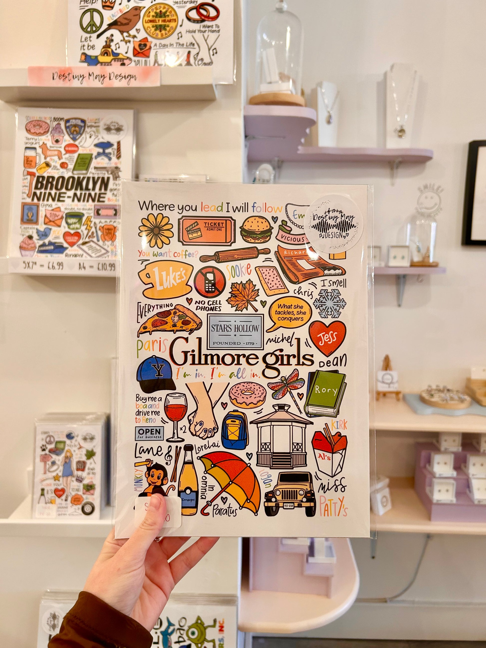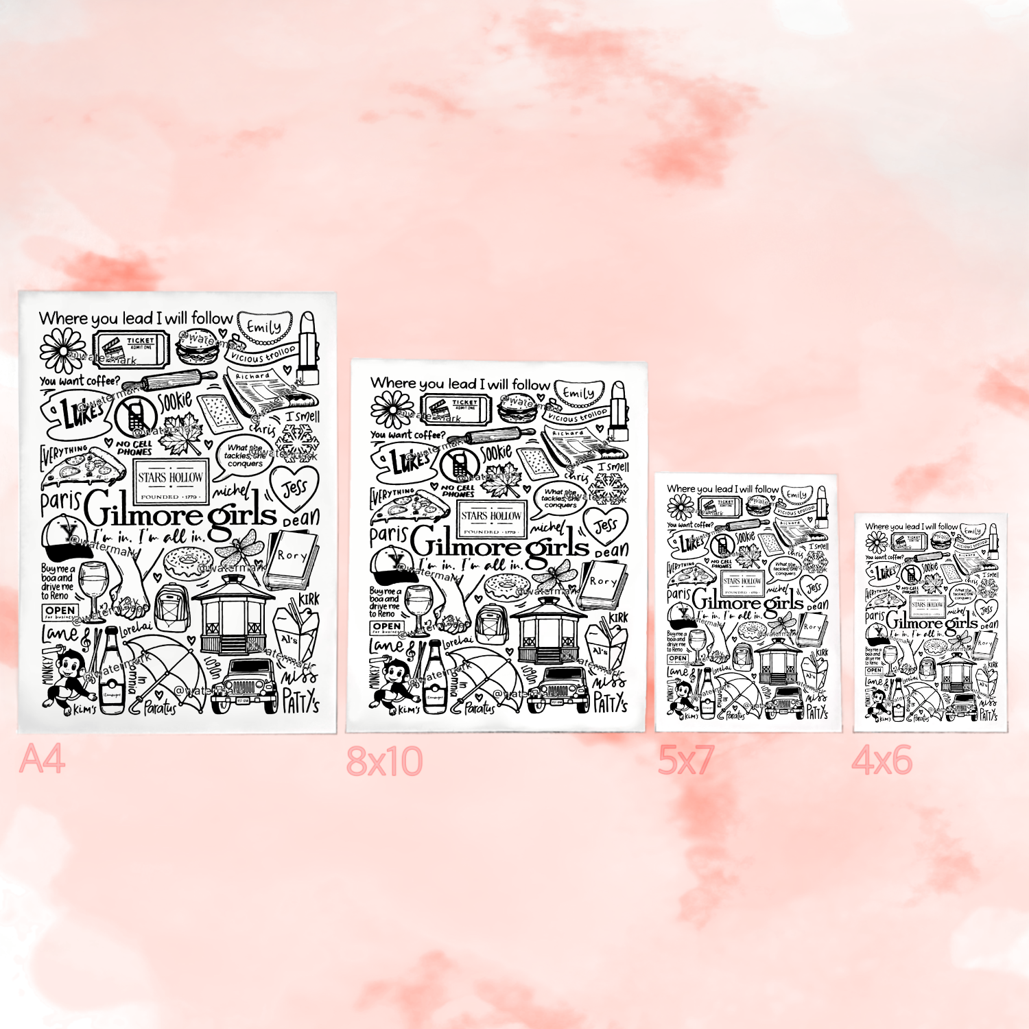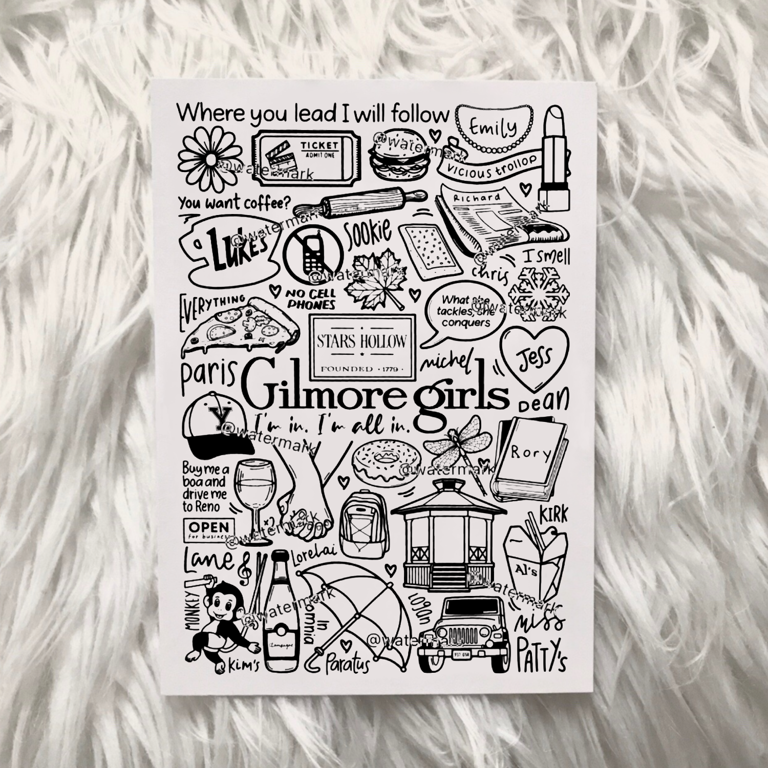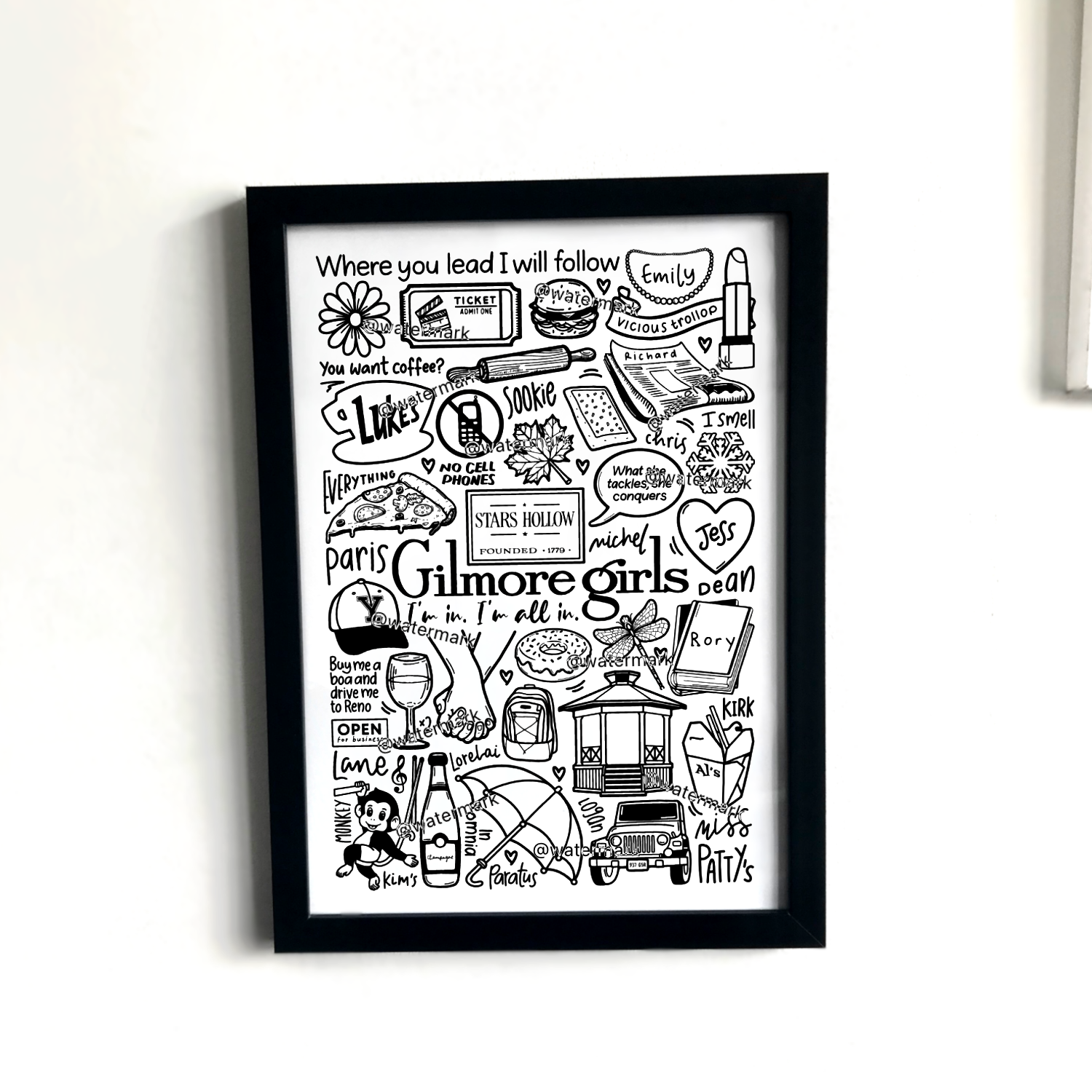 🎥Póster de Gilmore Girls que incluye citas, nombres de personajes e imágenes del programa.