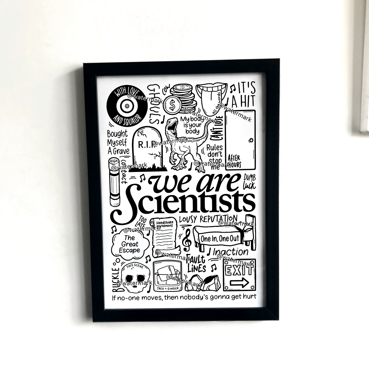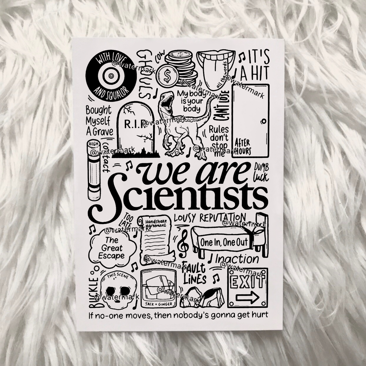 🎶 Impresión de póster de We Are Scientists creada con un iPad y un Apple Pencil. Incluye imágenes y letras de canciones de sus álbumes.
