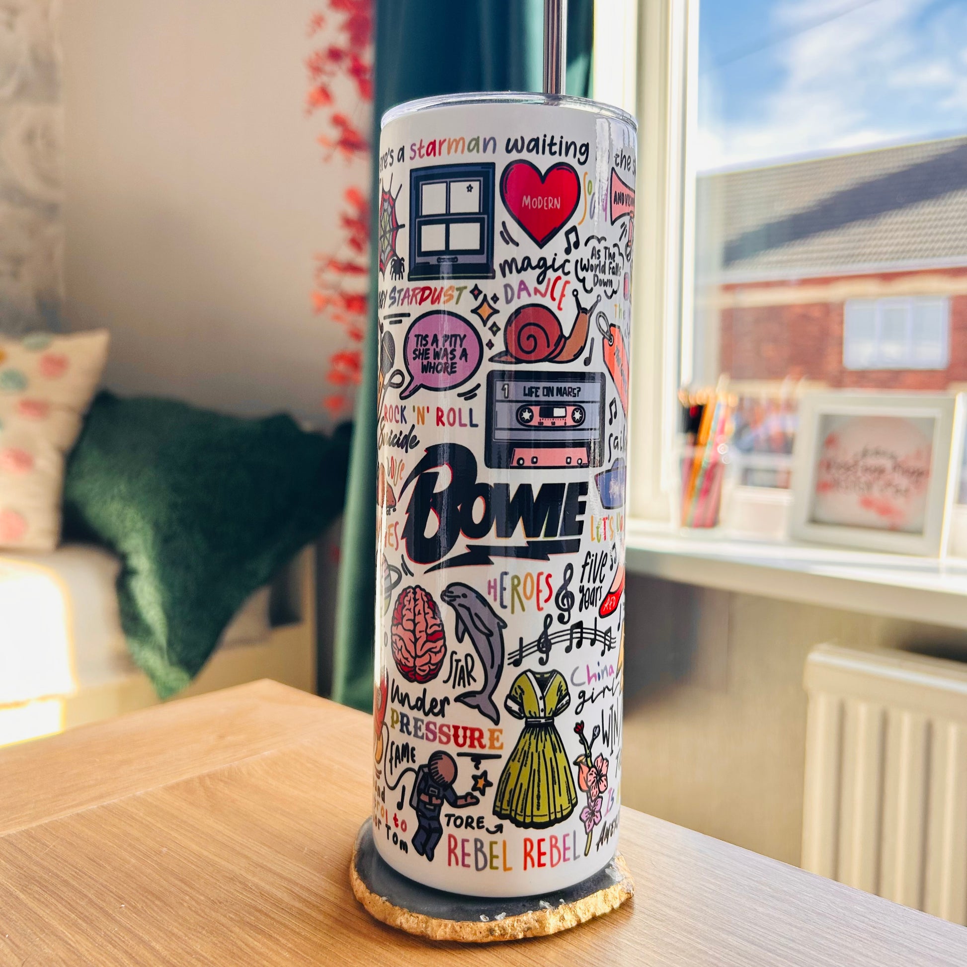🥤Get lyrical with your beverages with our David Bowie travel drinks cup! This versatile cup keeps your drinks hot OR cold and your spirits high with fun lyrics and drawings printed all around the cup. Stay hydrated (and entertained) on the go with our tumblers🥰