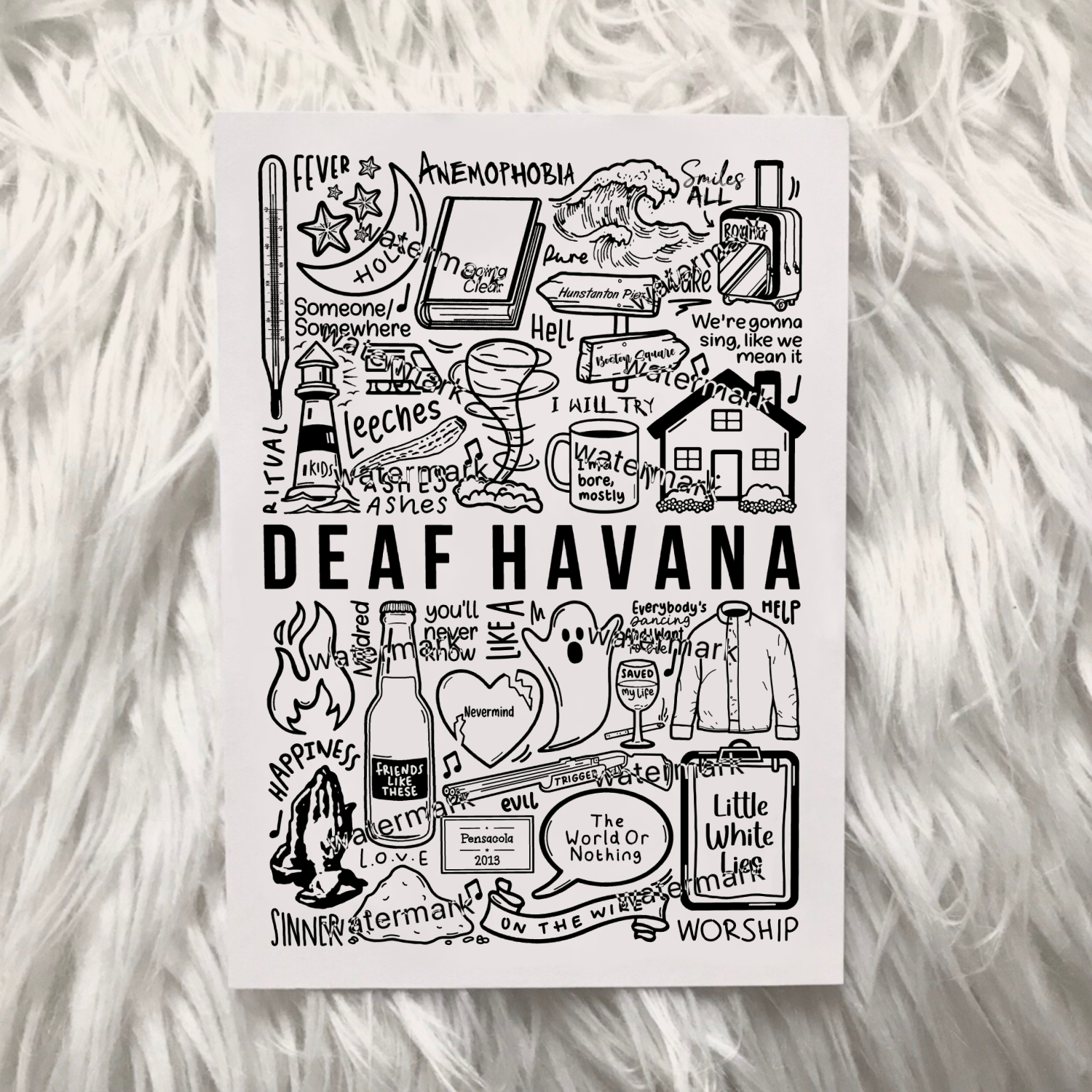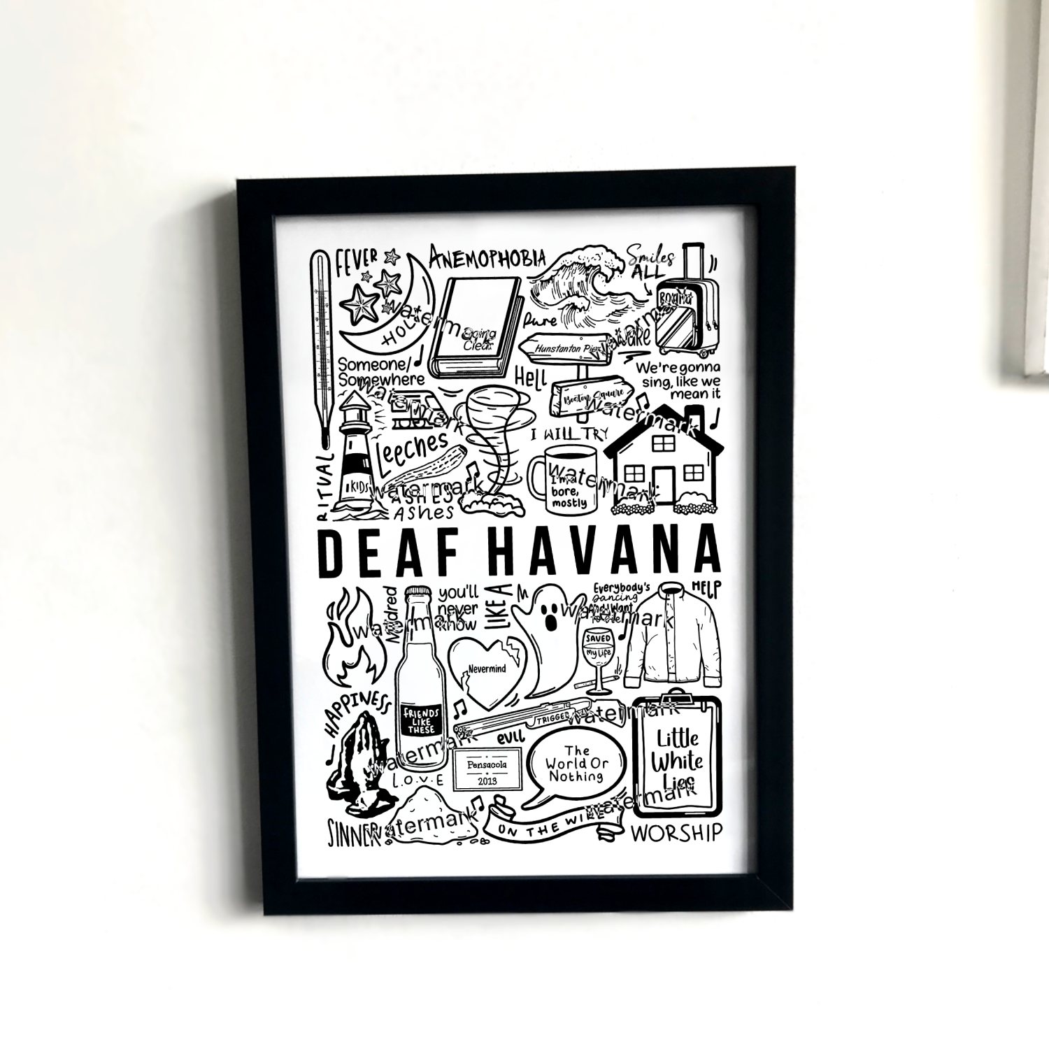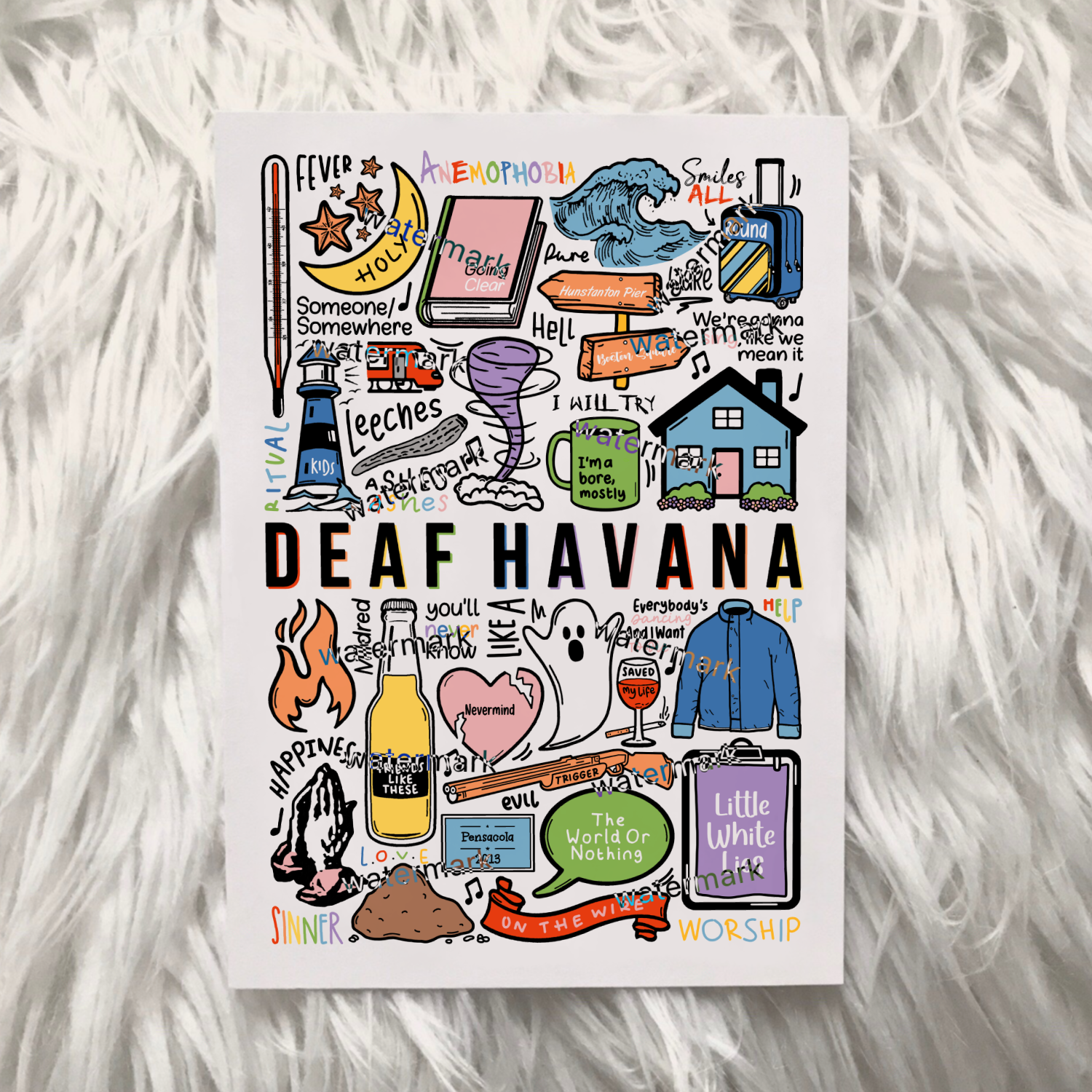 🎶 Impresión de póster de La Habana para sordos creada con un iPad y un Apple Pencil. Incluye imágenes y letras de canciones de sus álbumes.
