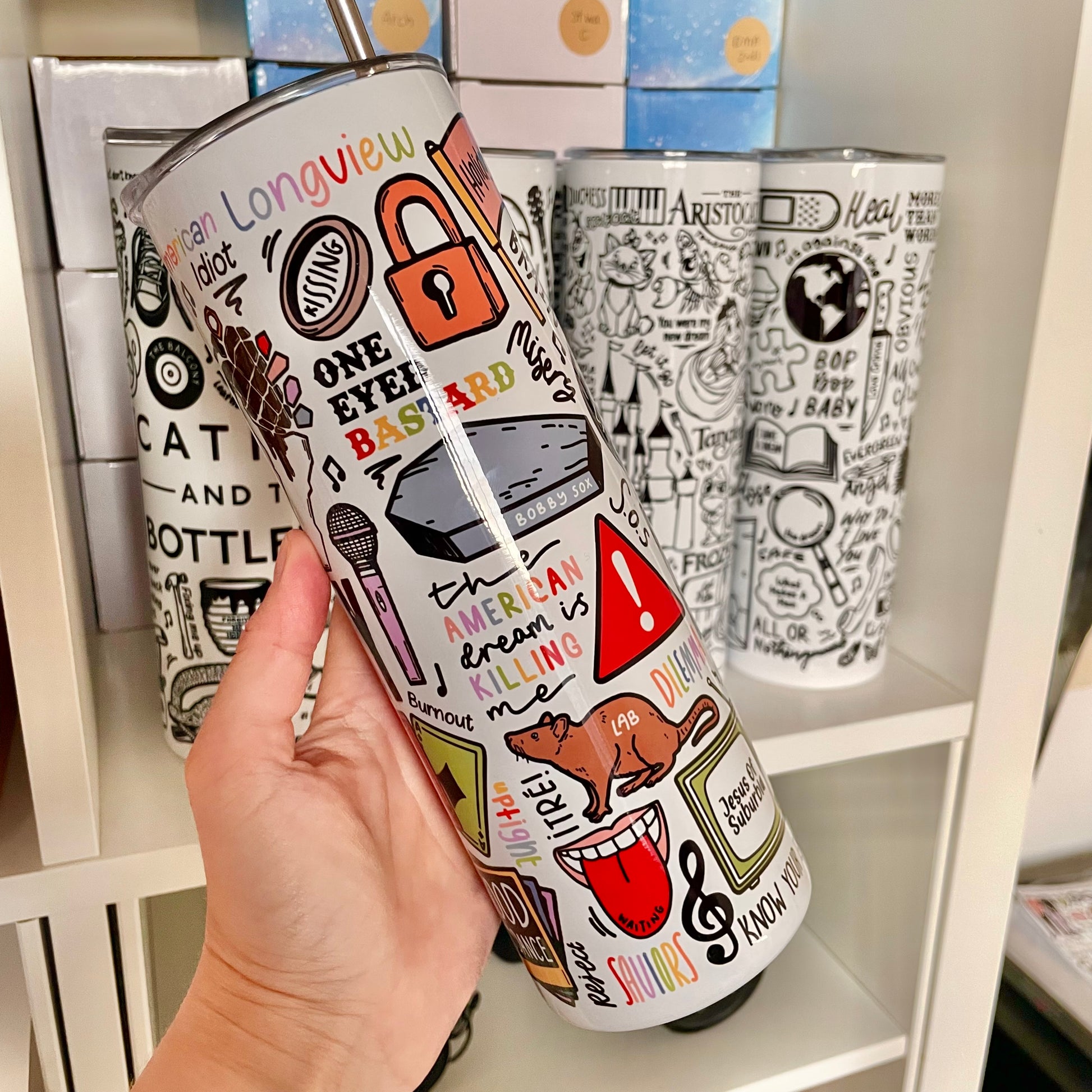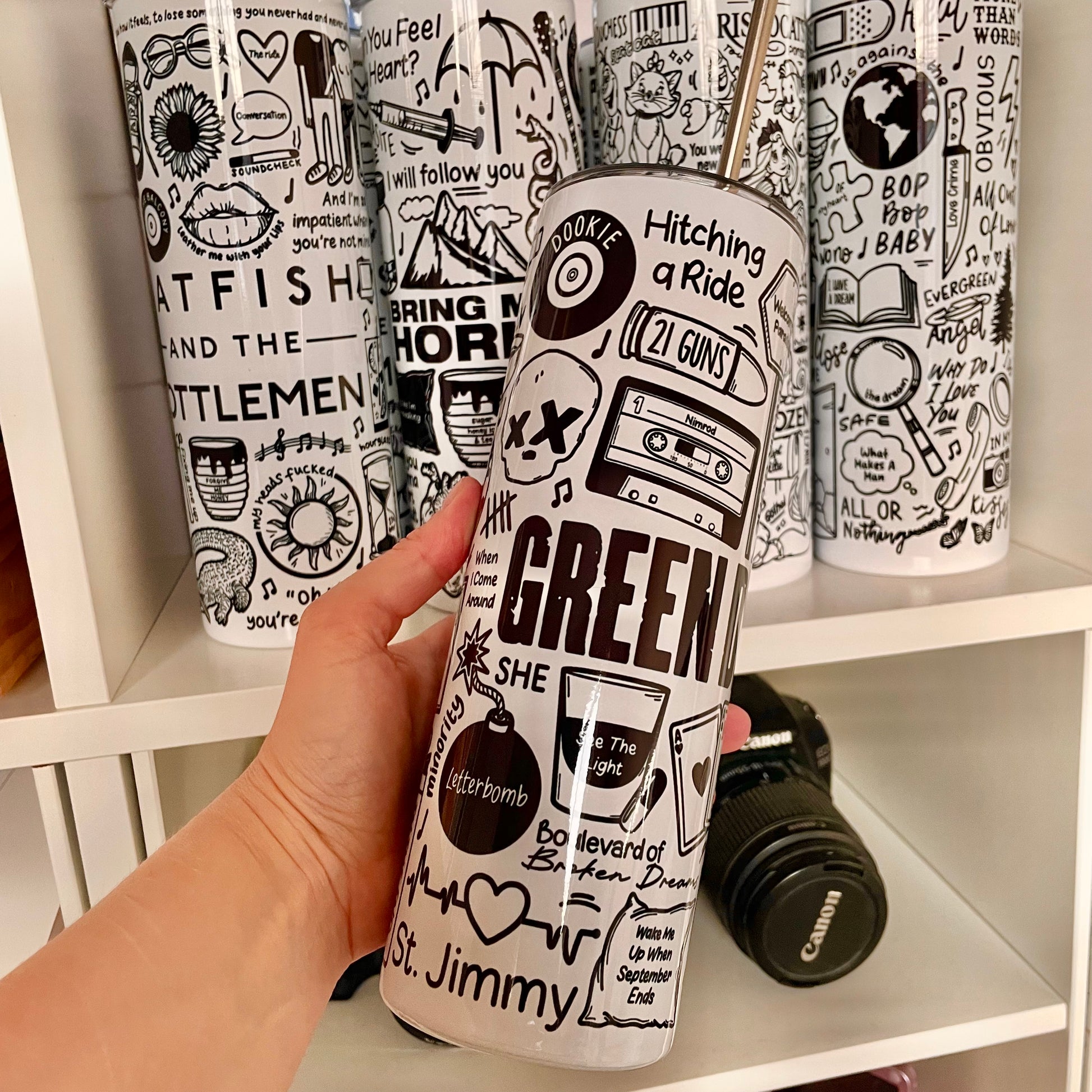 🥤Get lyrical with your beverages with our Green Day travel drinks cup! This versatile cup keeps your drinks hot OR cold and your spirits high with fun lyrics and drawings printed all around the cup. Stay hydrated (and entertained) on the go with our tumblers🥰