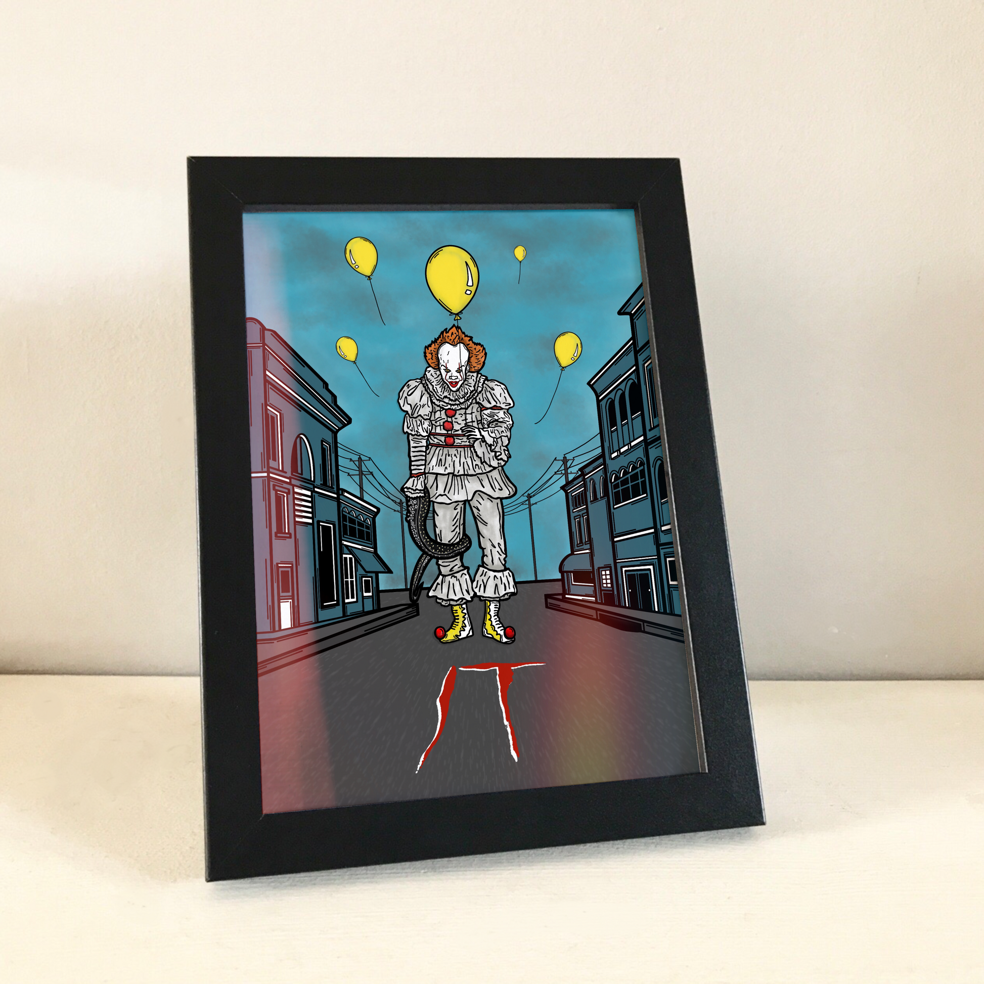 🤡Póster del payaso IT con una imagen de Pennywise de las películas en medio de una calle, con globos amarillos volando a su alrededor.