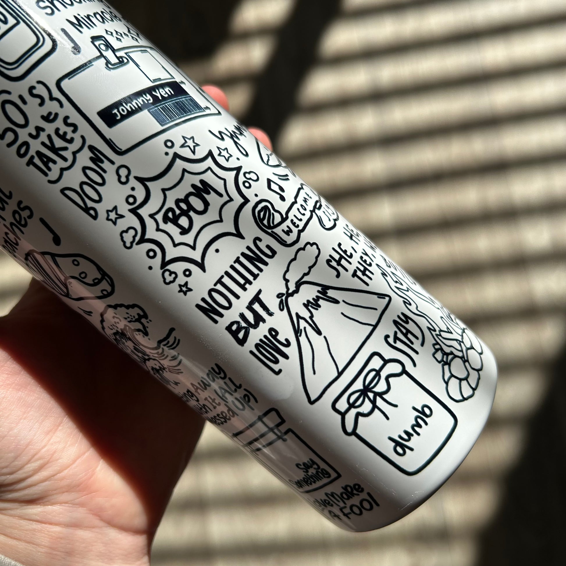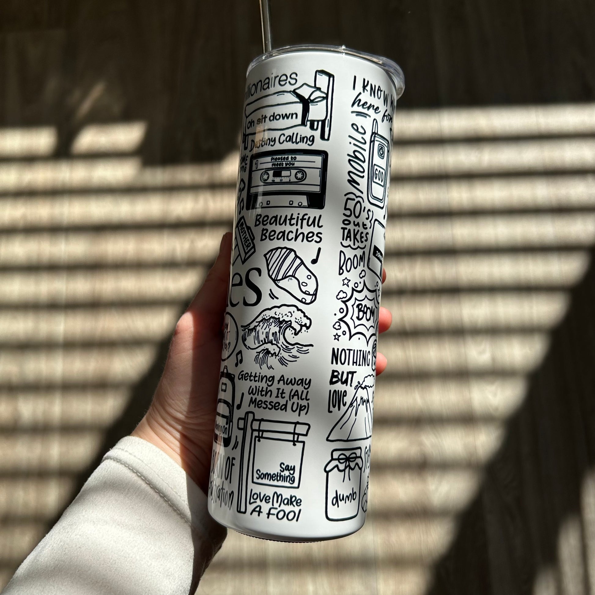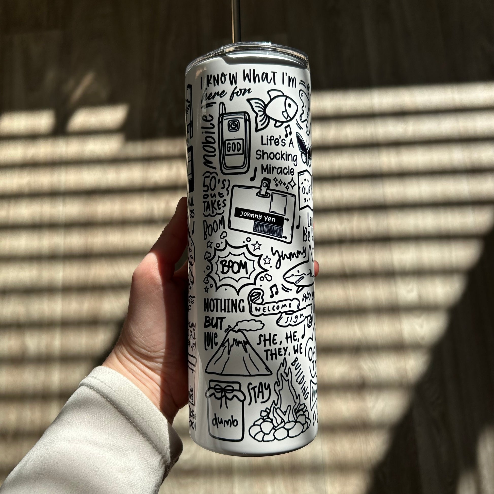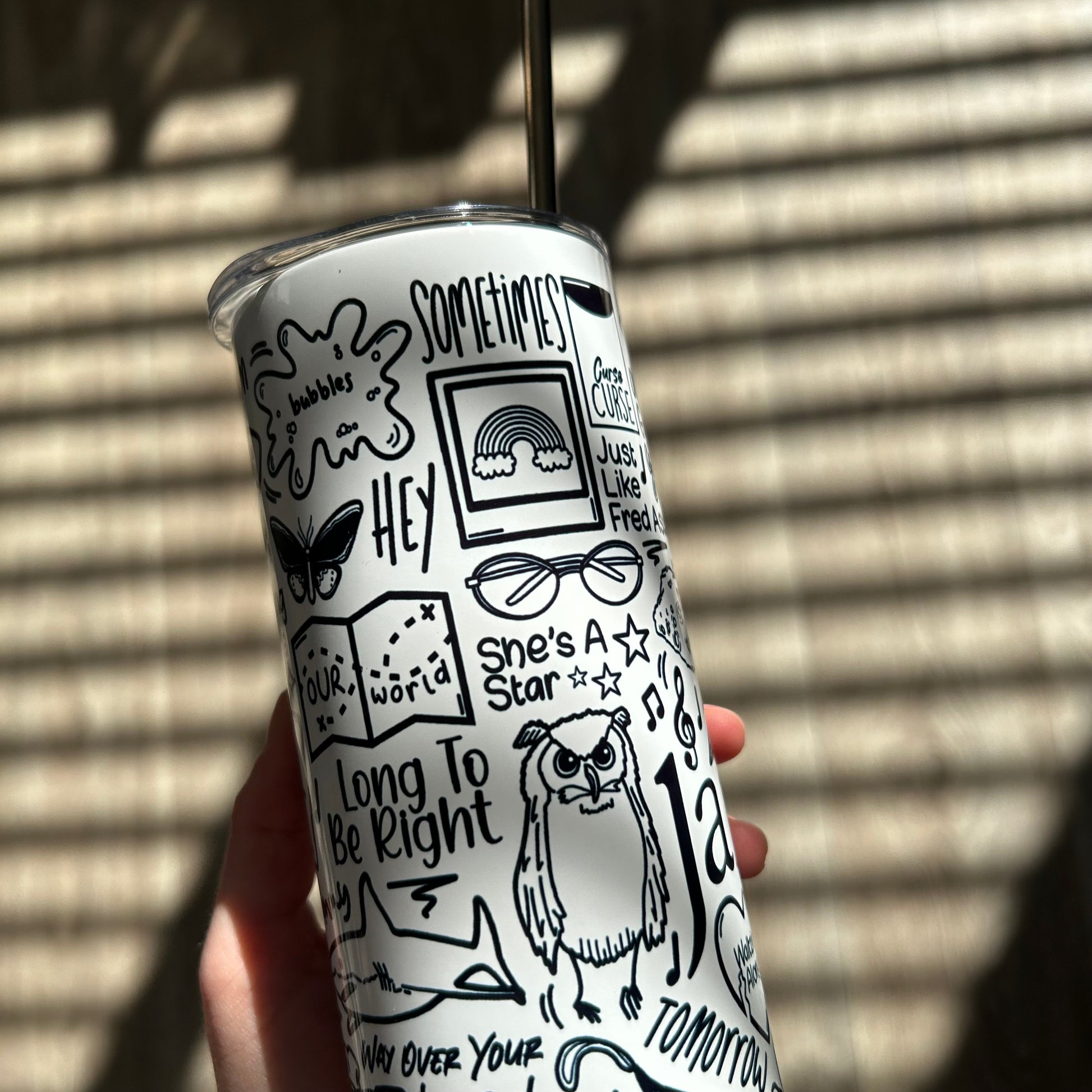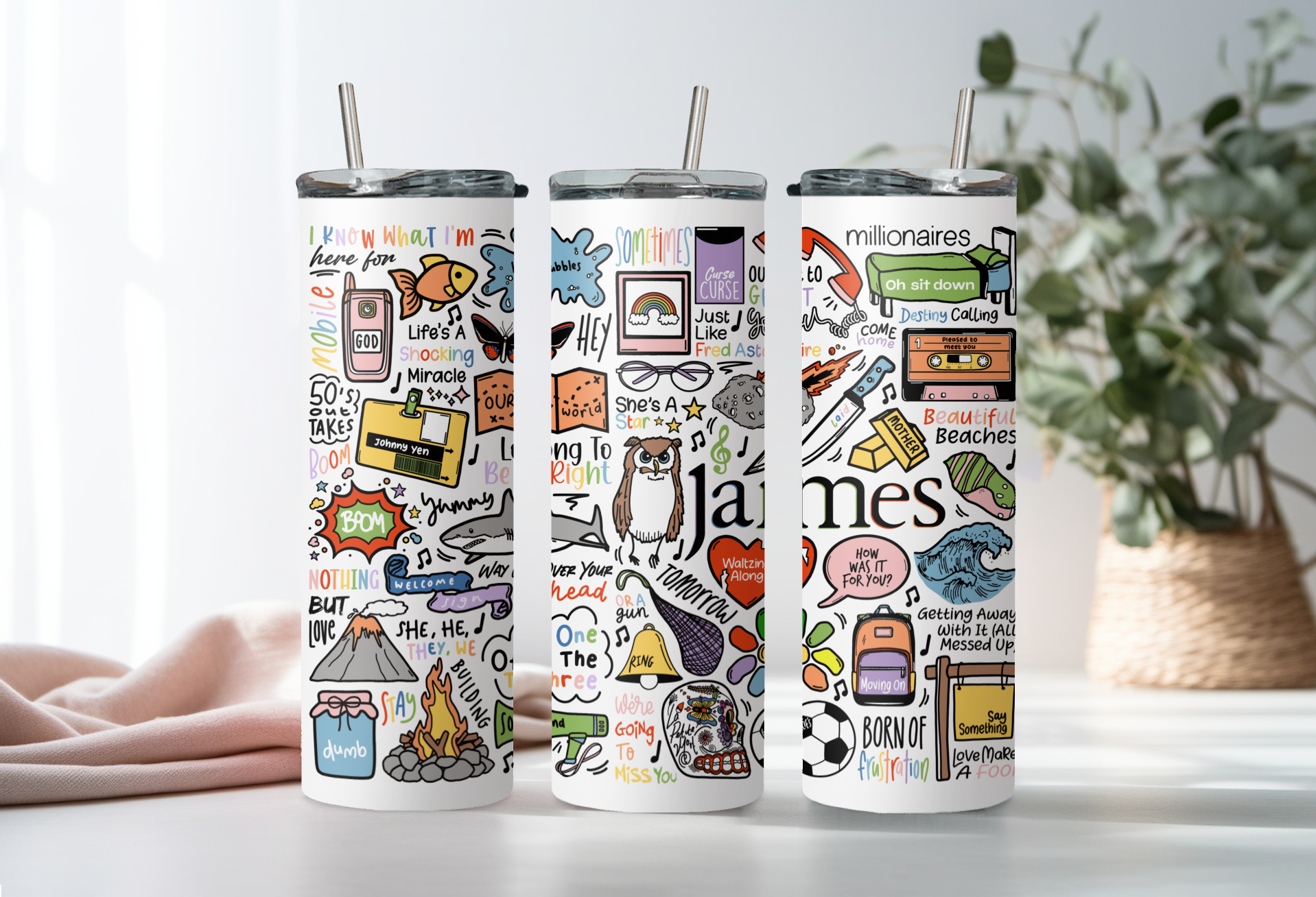 🥤Get lyrical with your beverages with our James travel drinks cup! This versatile cup keeps your drinks hot OR cold and your spirits high with fun lyrics and drawings printed all around the cup. Stay hydrated (and entertained) on the go with our tumblers🥰