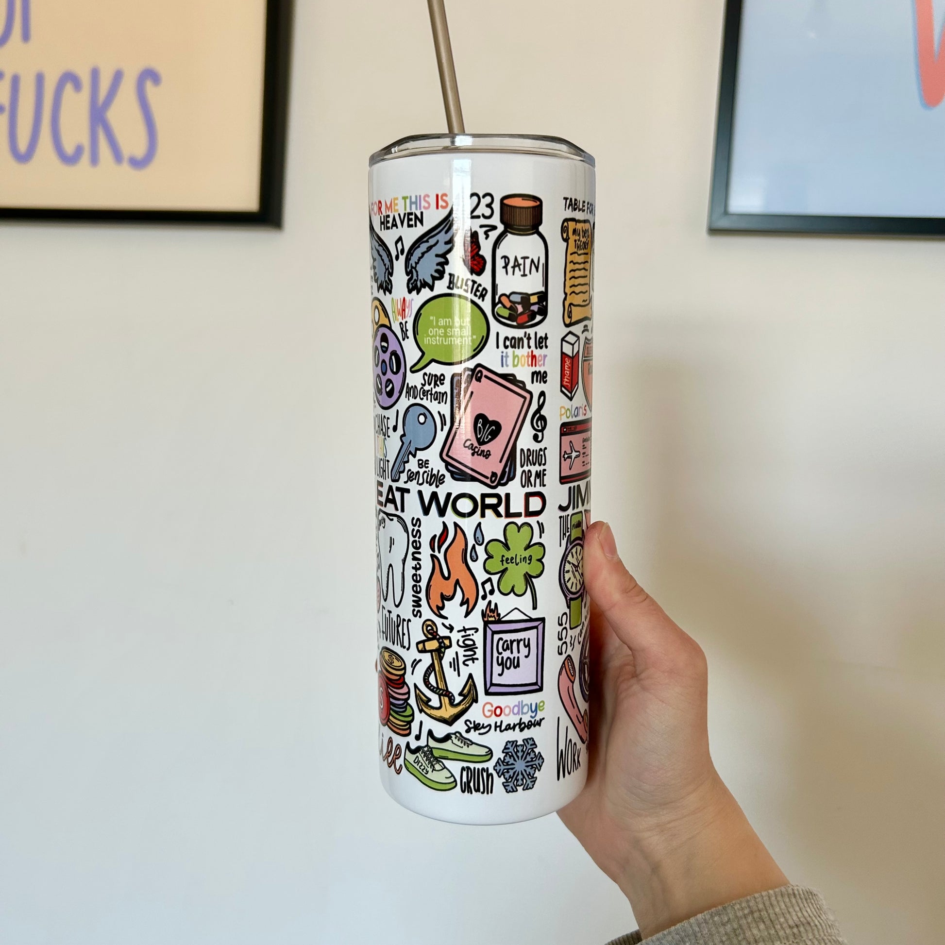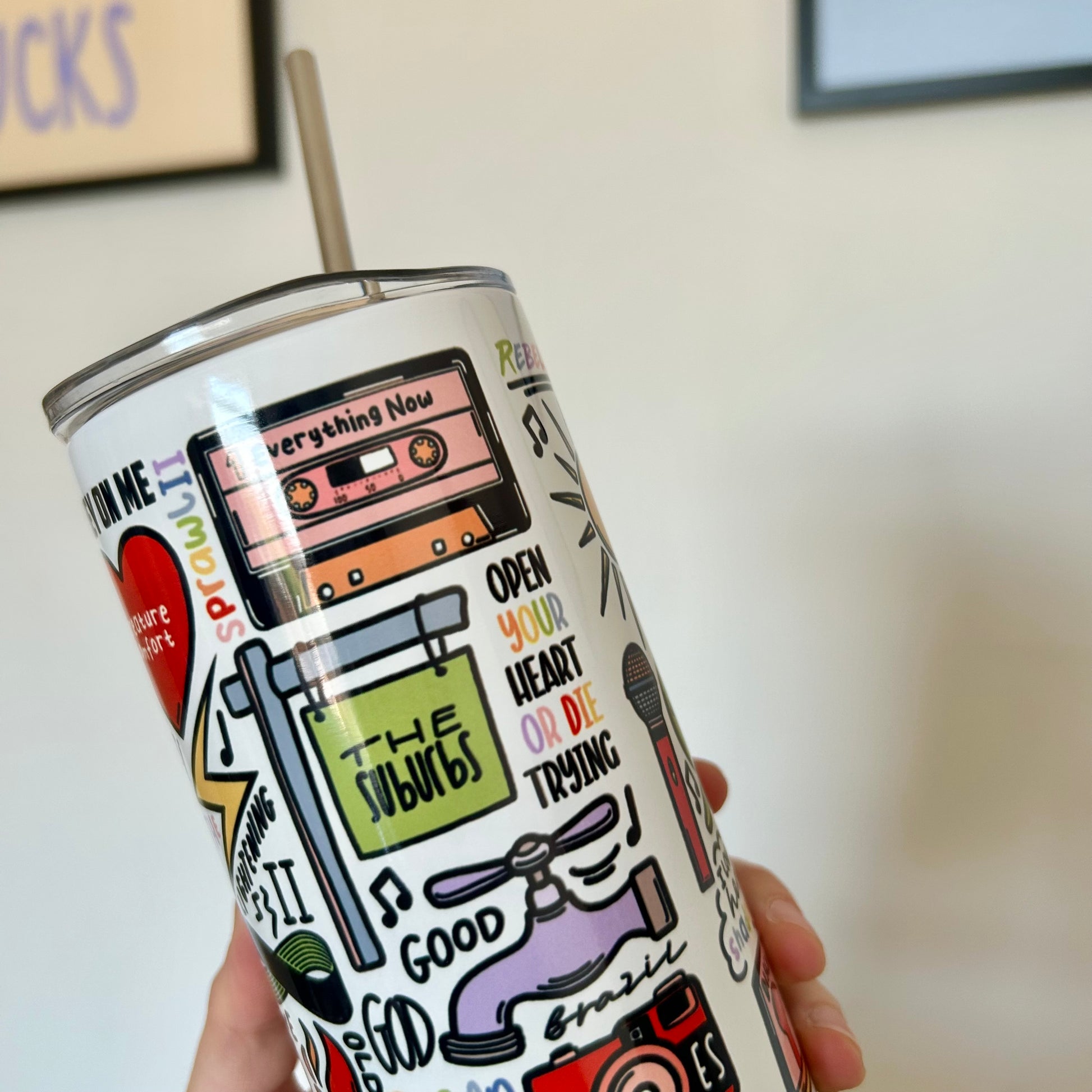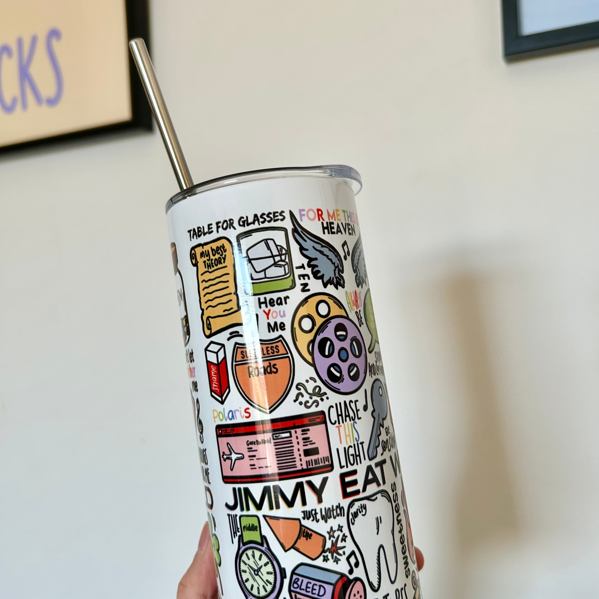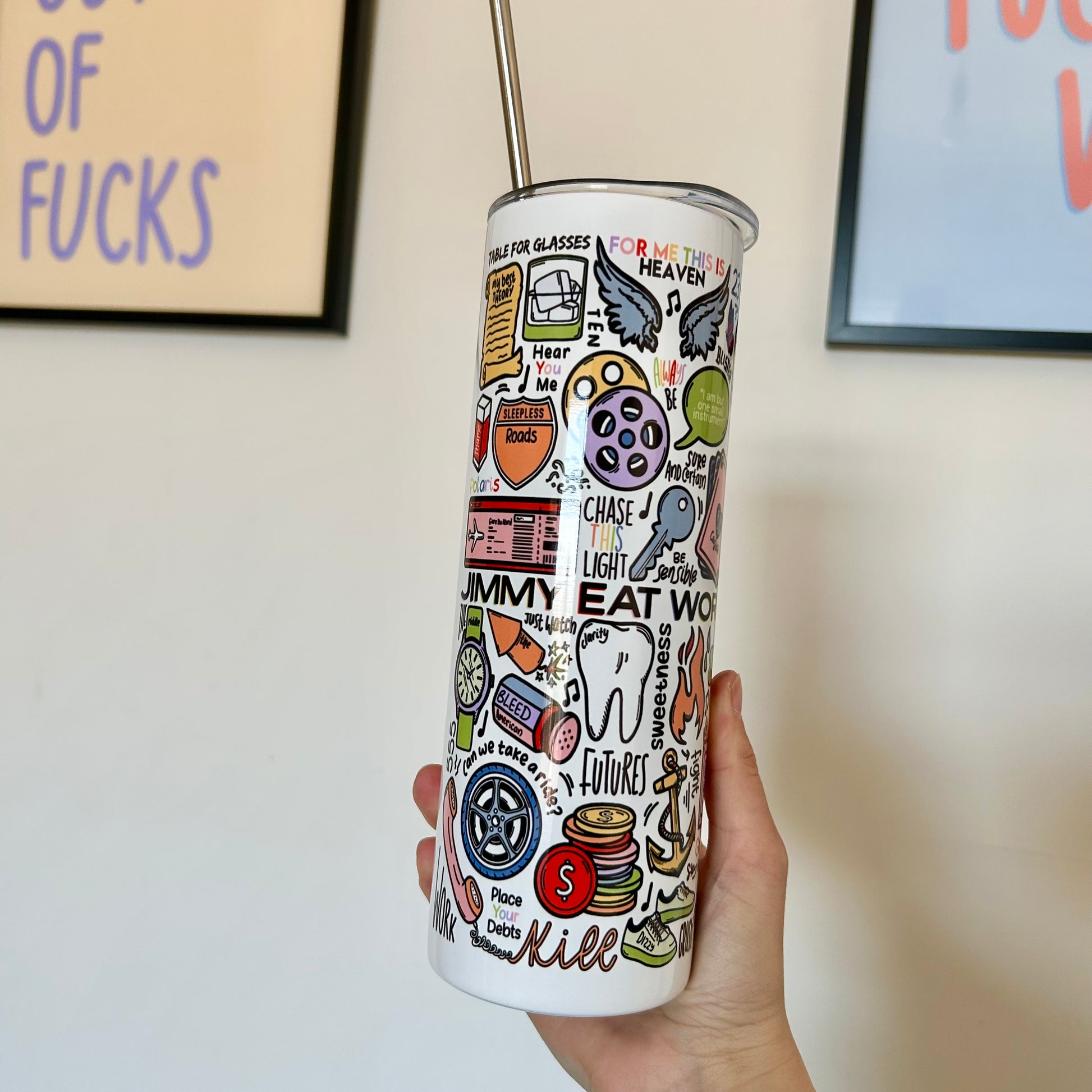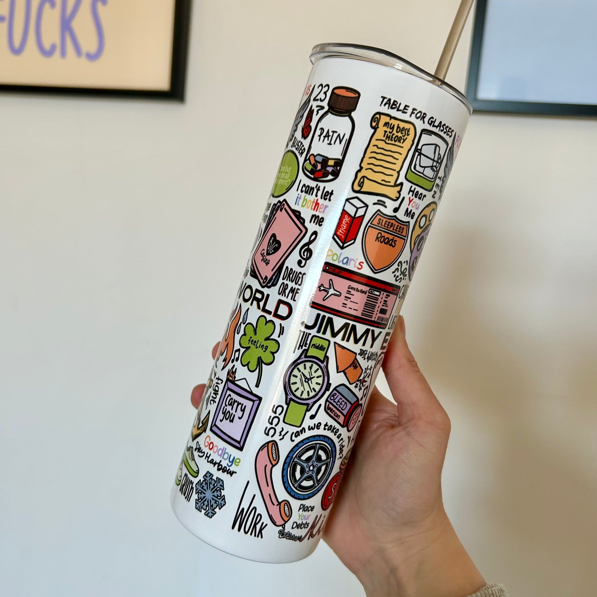 🥤Get lyrical with your beverages with our travel drinks cup! This versatile cup keeps your drinks hot OR cold and your spirits high with fun lyrics and drawings printed all around the cup. Stay hydrated (and entertained) on the go with our tumblers🥰