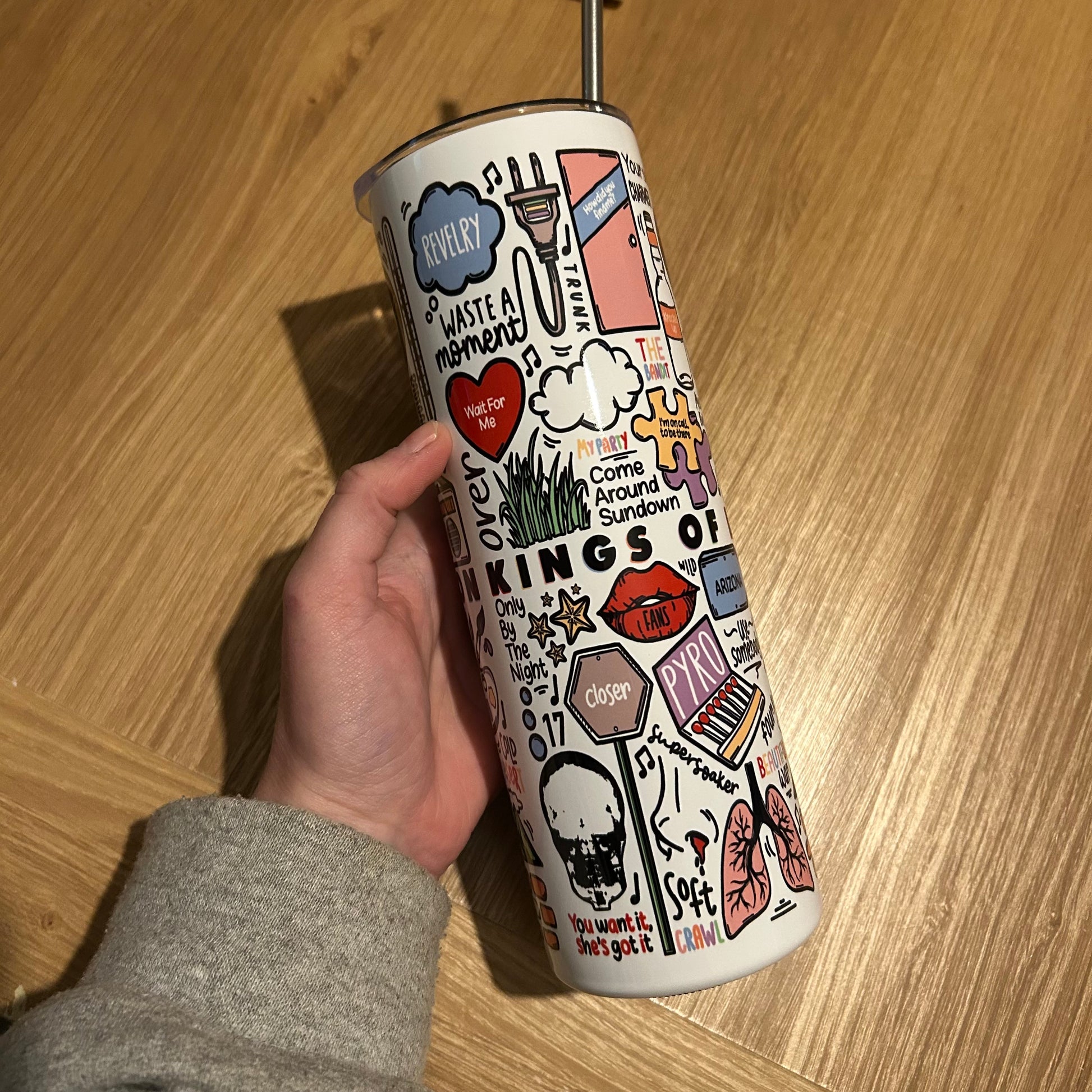 🥤Get lyrical with your beverages with our Kings Of Leon travel drinks cup! This versatile cup keeps your drinks hot OR cold and your spirits high with fun lyrics and drawings printed all around the cup. Stay hydrated (and entertained) on the go with our tumblers🥰
