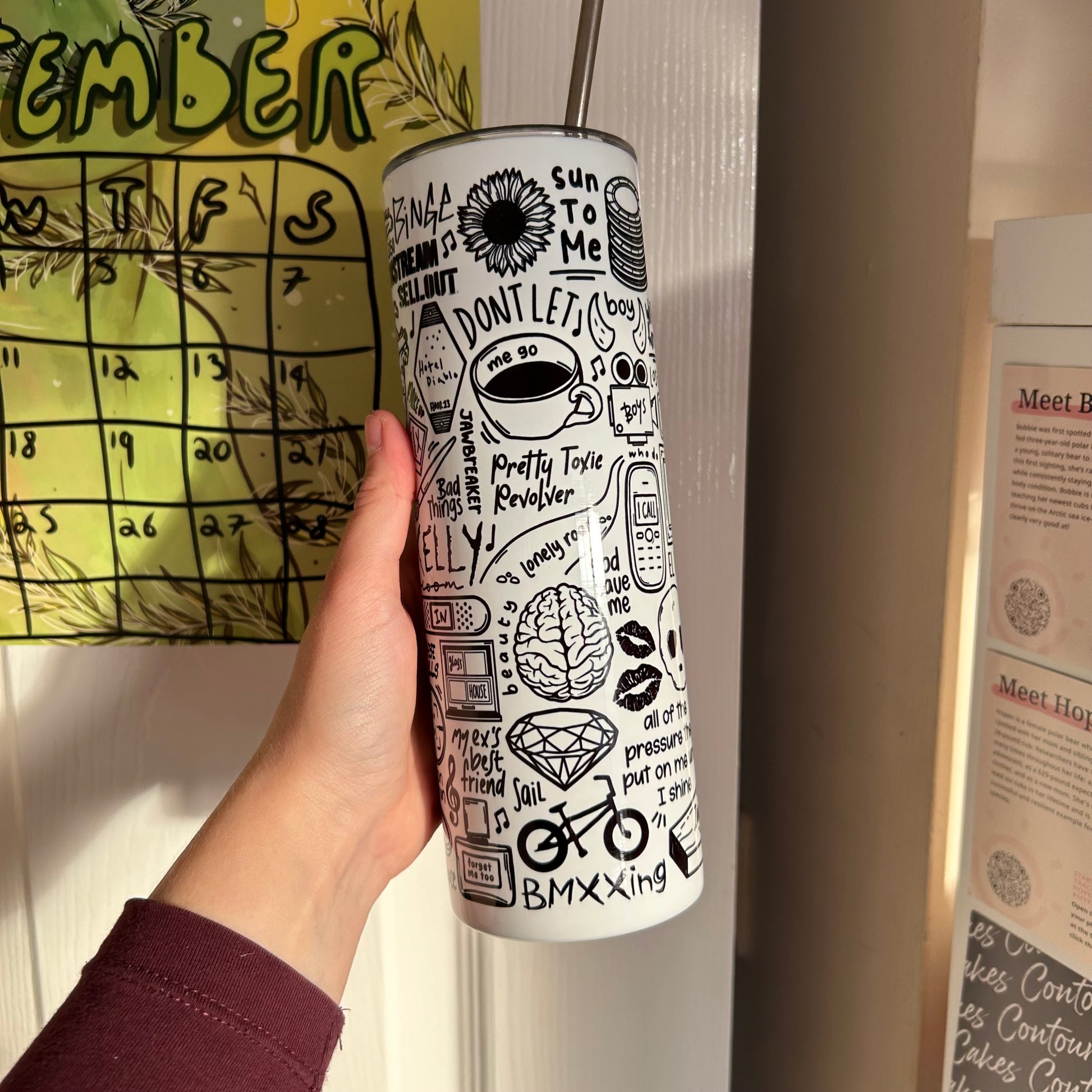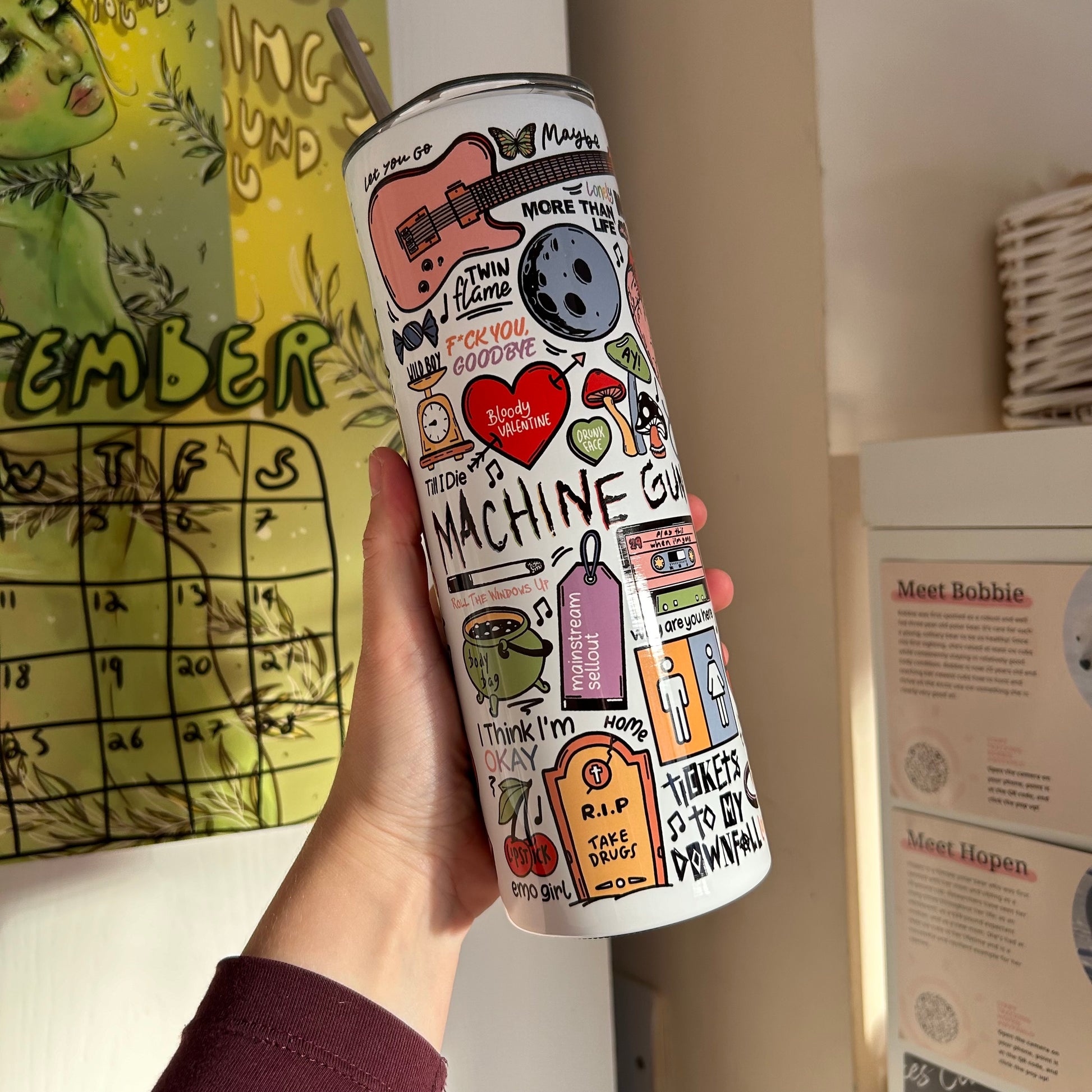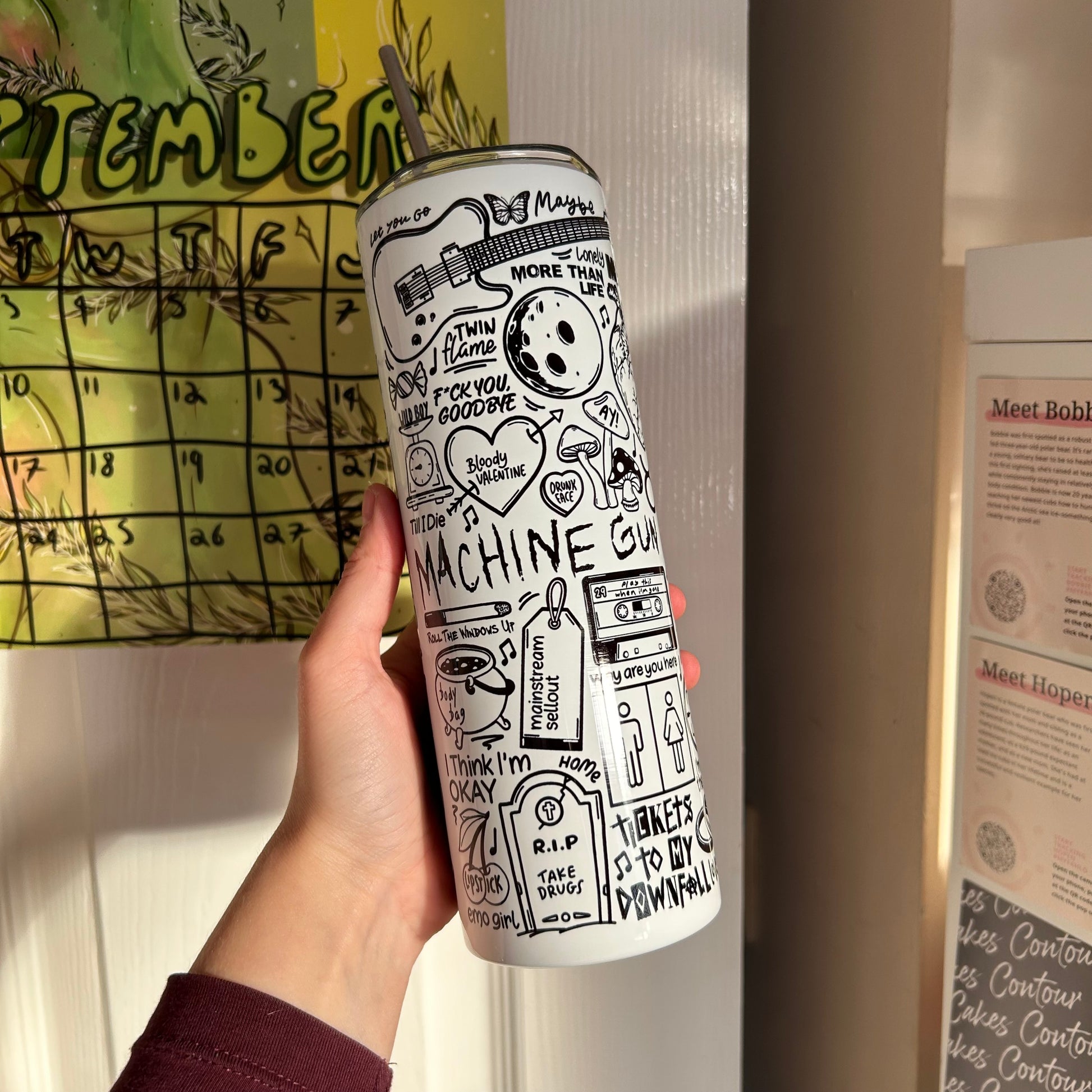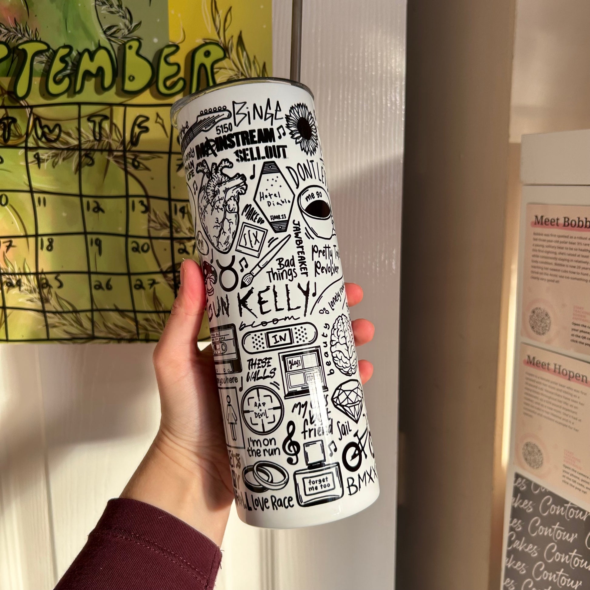🥤Get lyrical with your beverages with our MGK travel drinks cup! This versatile cup keeps your drinks hot OR cold and your spirits high with fun lyrics and drawings printed all around the cup. Stay hydrated (and entertained) on the go with our tumblers🥰