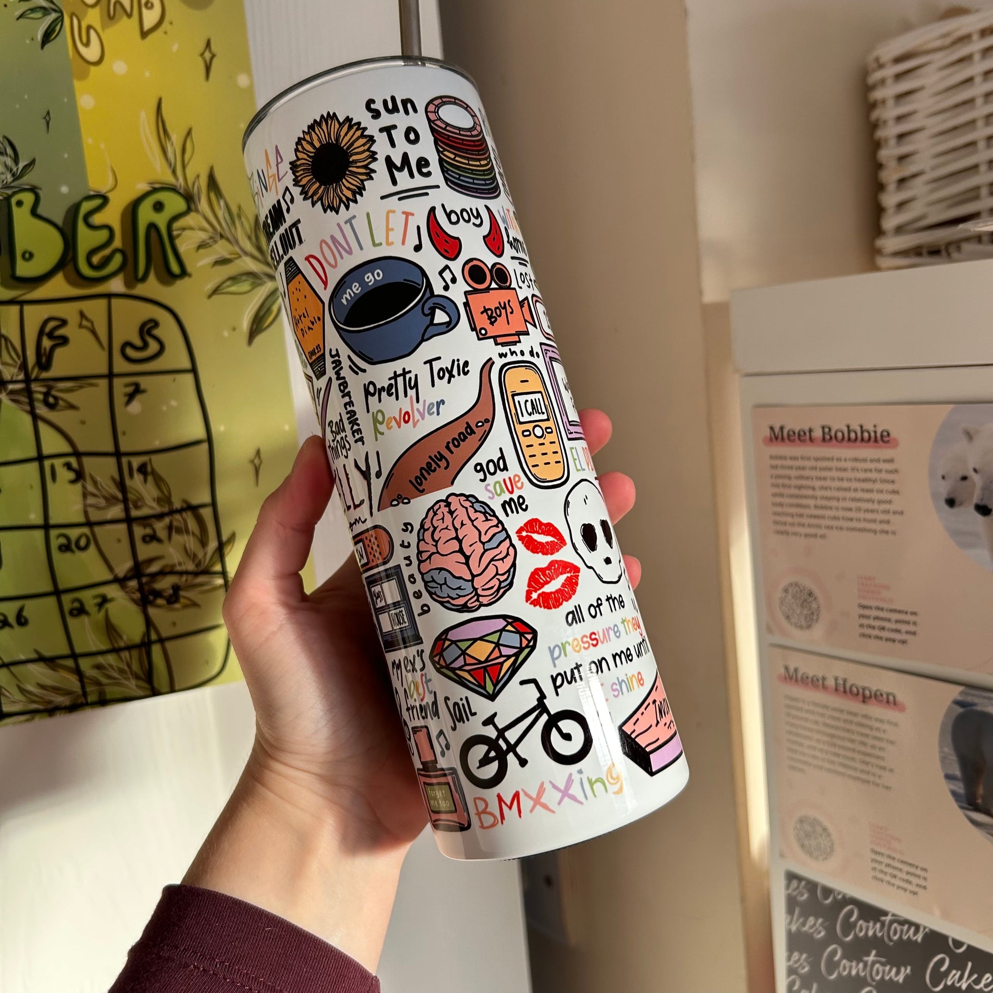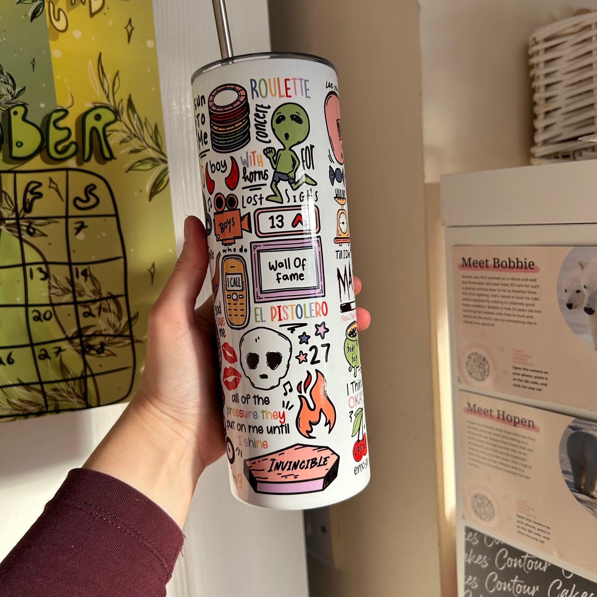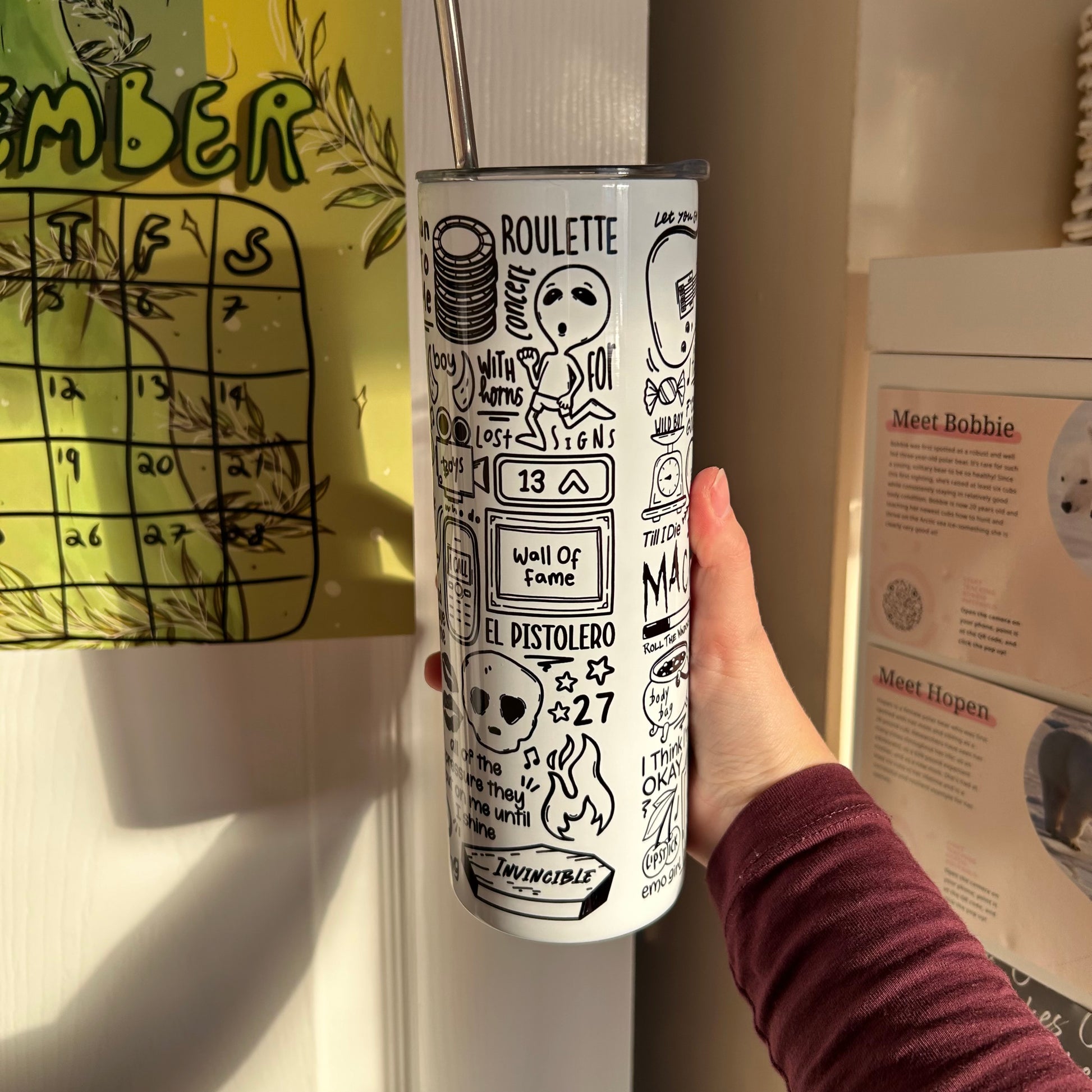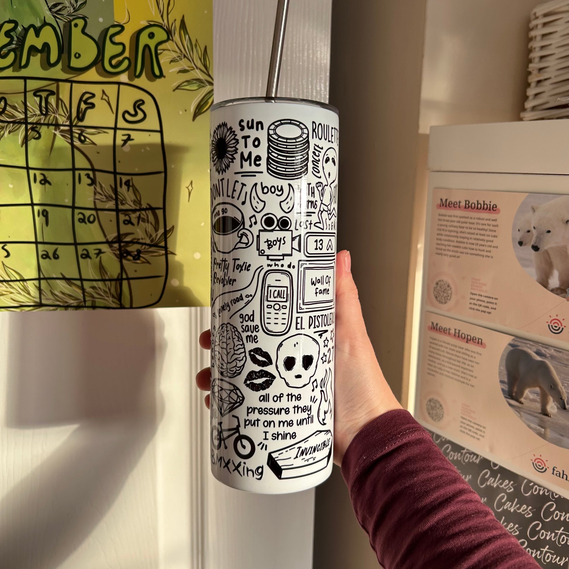 🥤Get lyrical with your beverages with our MGK travel drinks cup! This versatile cup keeps your drinks hot OR cold and your spirits high with fun lyrics and drawings printed all around the cup. Stay hydrated (and entertained) on the go with our tumblers🥰