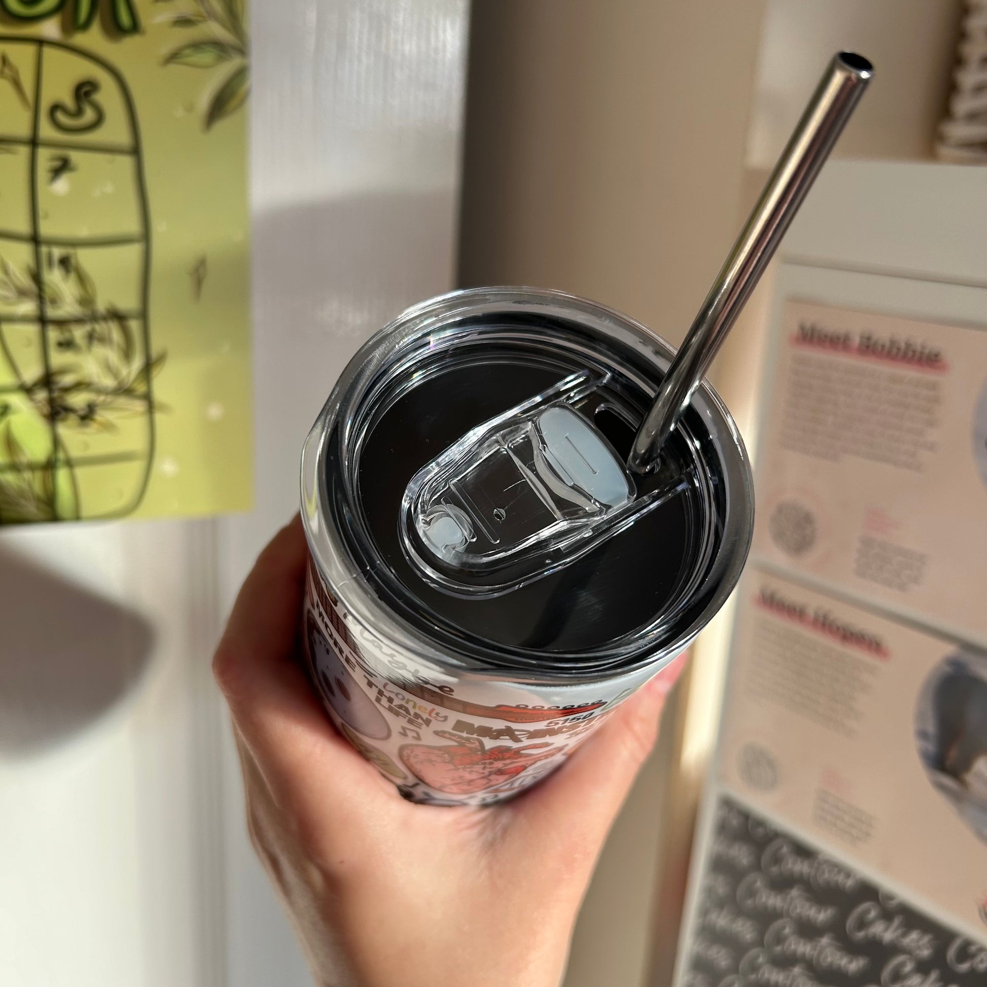 ☕️20oz double walled stainless steel cup with metal straw included. Ideal for upright use, we recommend our bottles instead if you require your cup to be leak-proof.