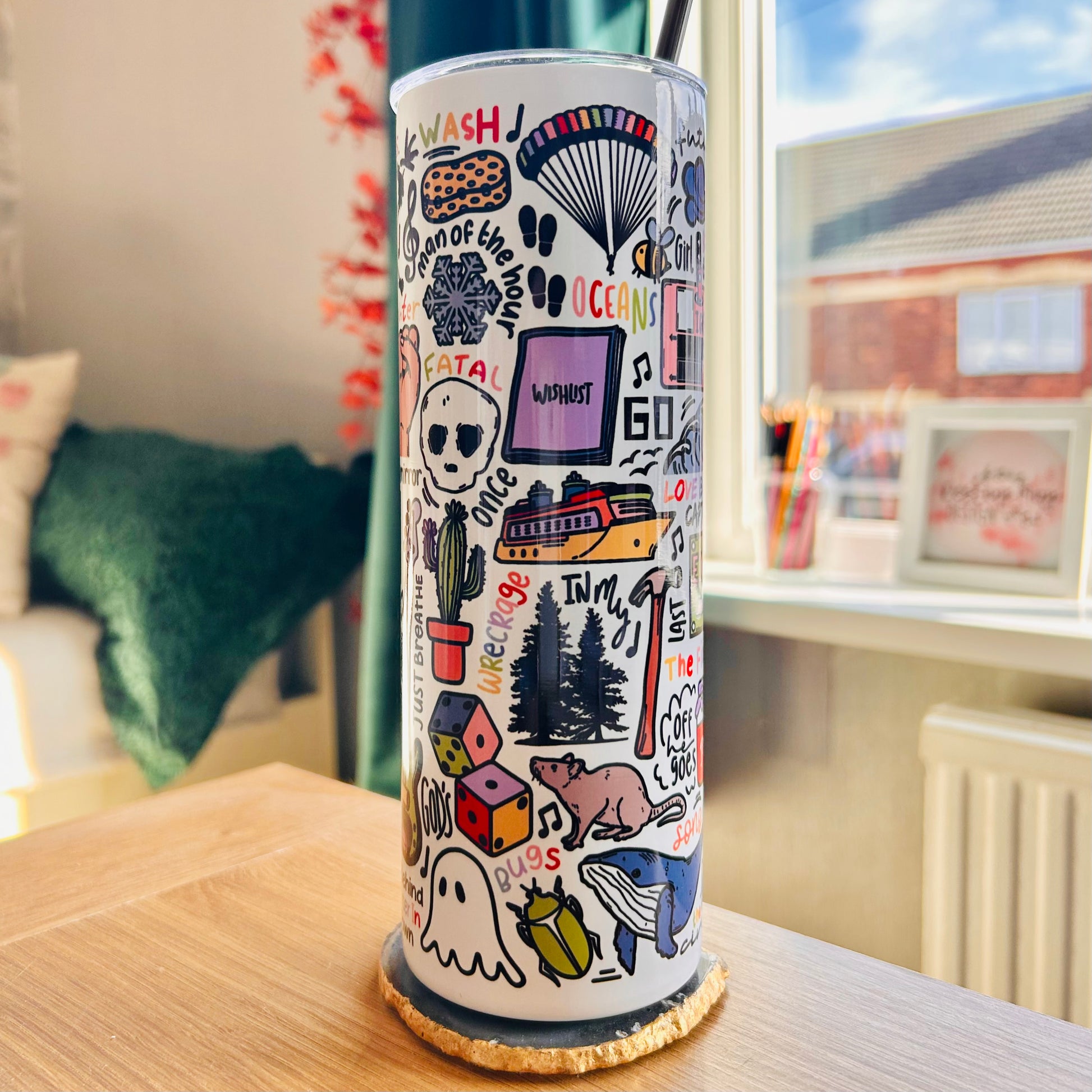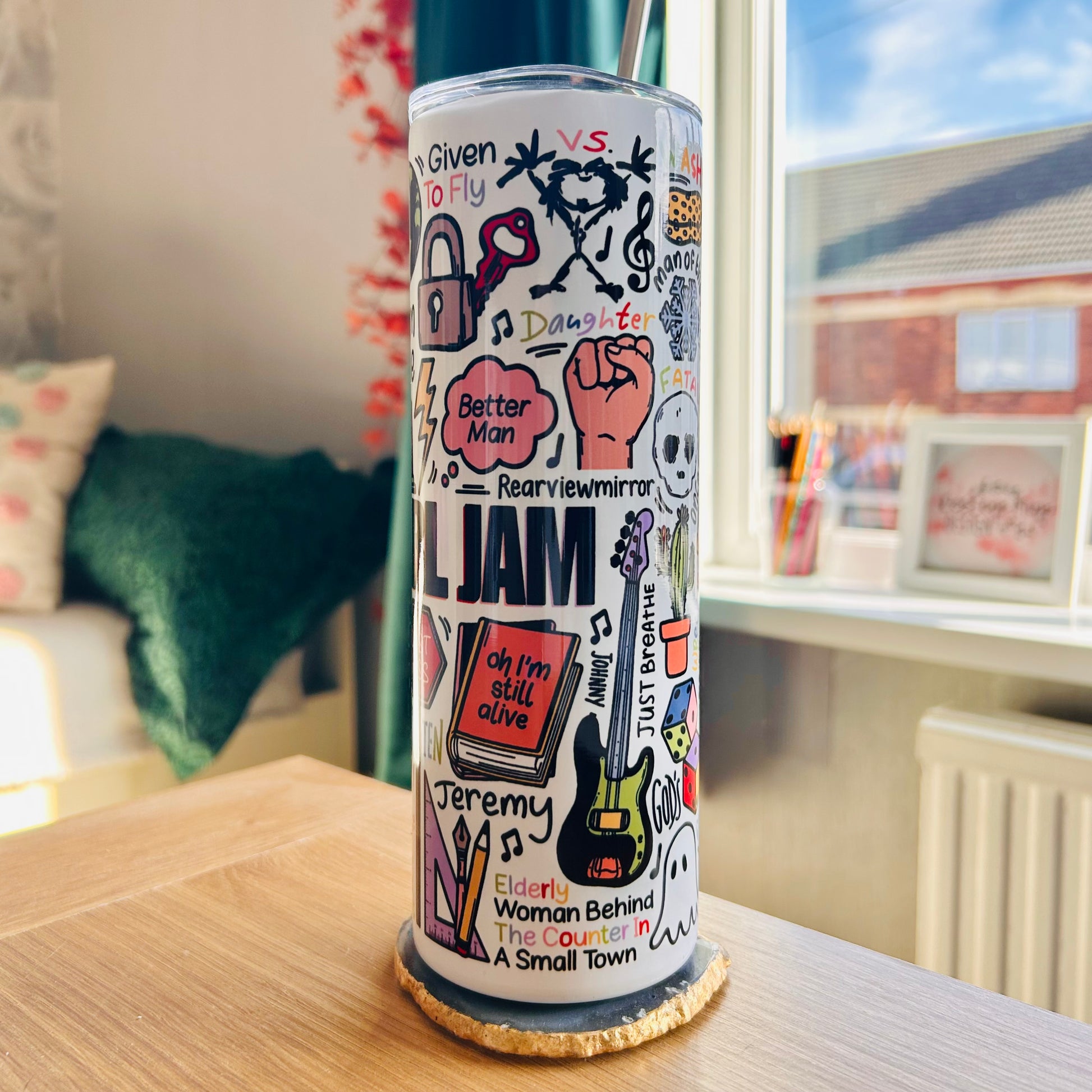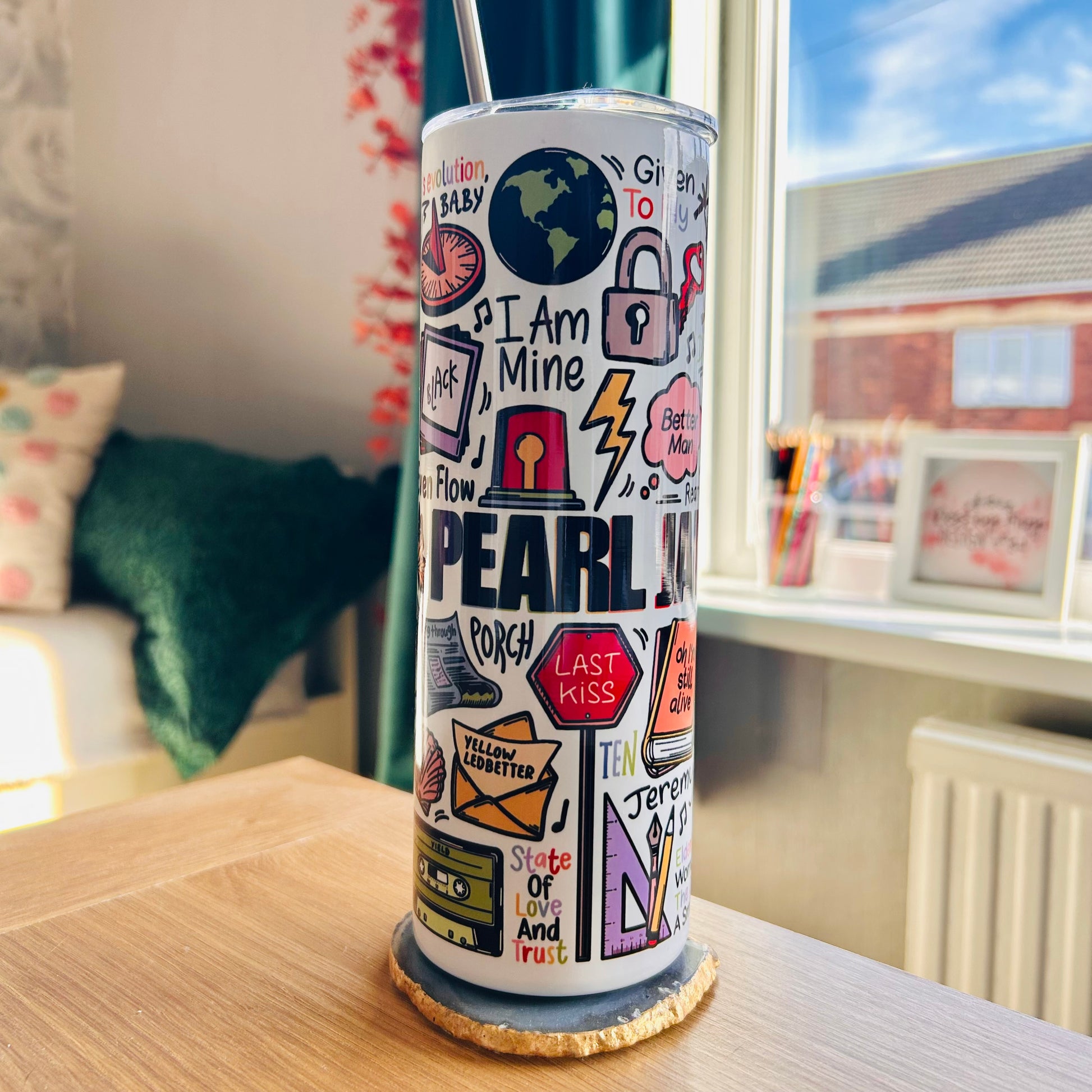 🥤Get lyrical with your beverages with our Pearl Jam travel drinks cup! This versatile cup keeps your drinks hot OR cold and your spirits high with fun lyrics and drawings printed all around the cup. Stay hydrated (and entertained) on the go with our tumblers🥰
