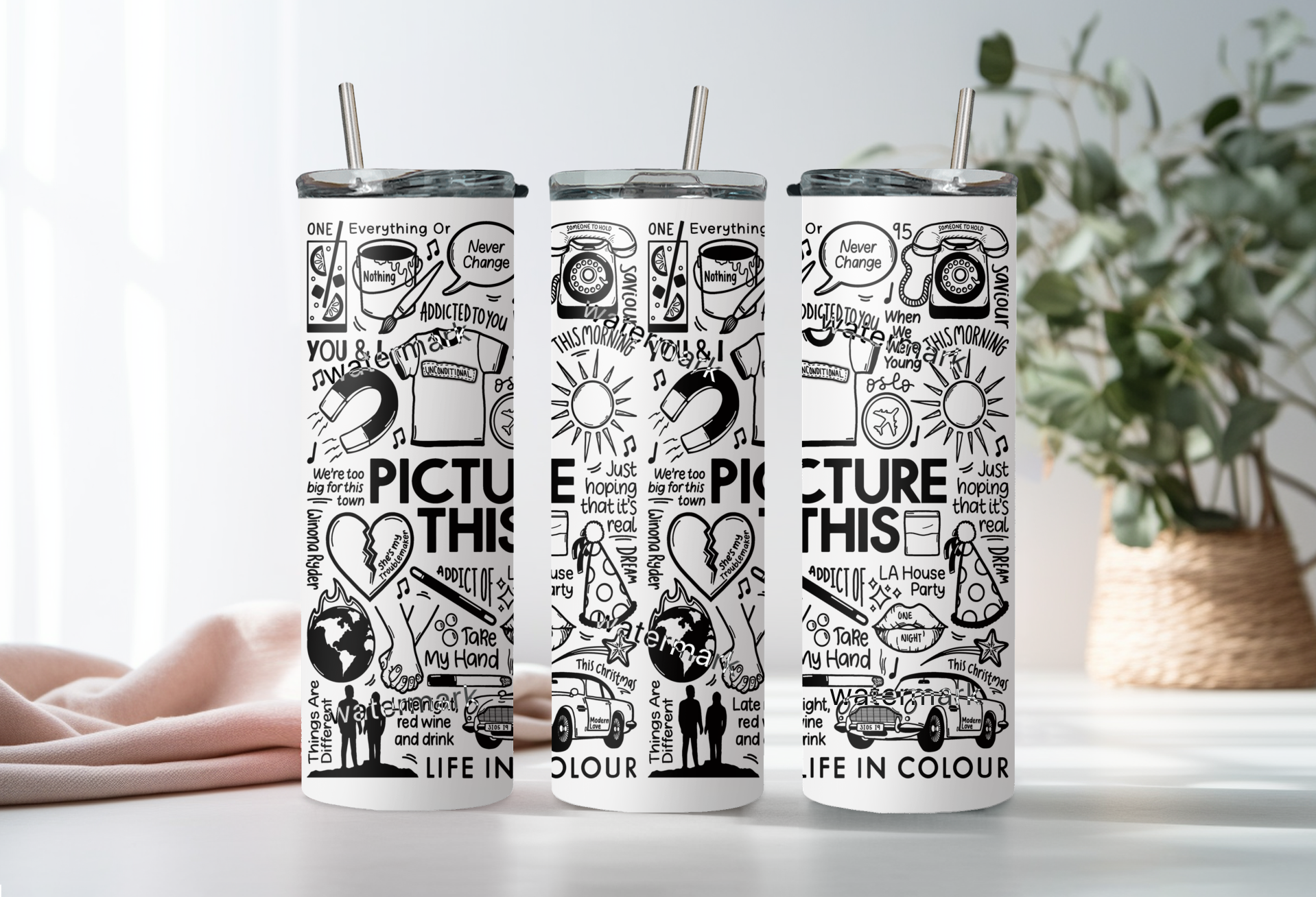 🥤Get lyrical with your beverages with our Picture This travel drinks cup! This versatile cup keeps your drinks hot OR cold and your spirits high with fun lyrics and drawings printed all around the cup. Stay hydrated (and entertained) on the go with our tumblers🥰