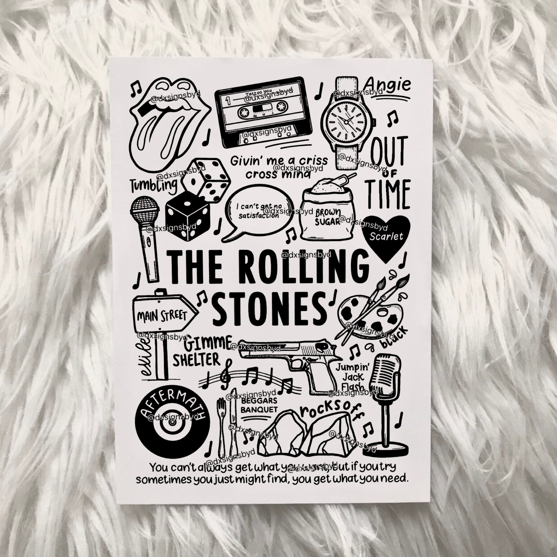 🎶La impresión del póster de los Rolling Stones creada con un iPad y un Apple Pencil. Incluye imágenes y letras de canciones de sus álbumes como Aftermath y Tattoo You.