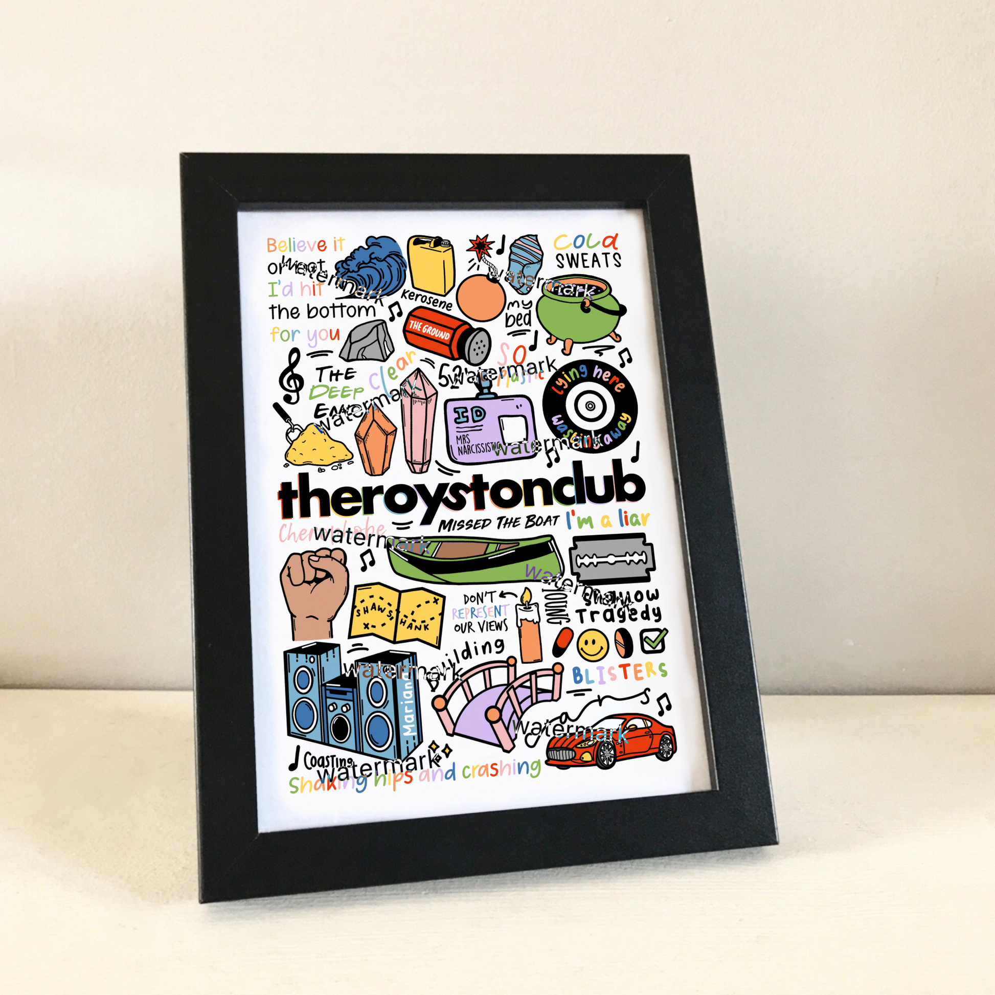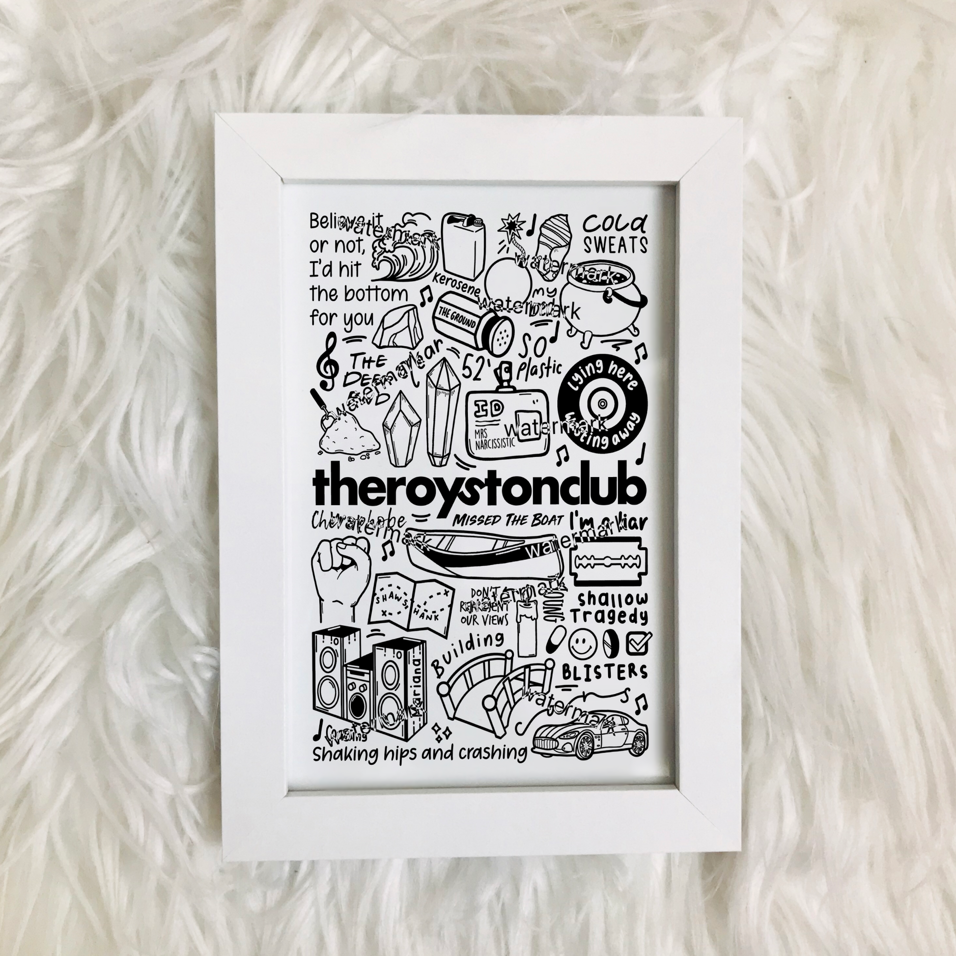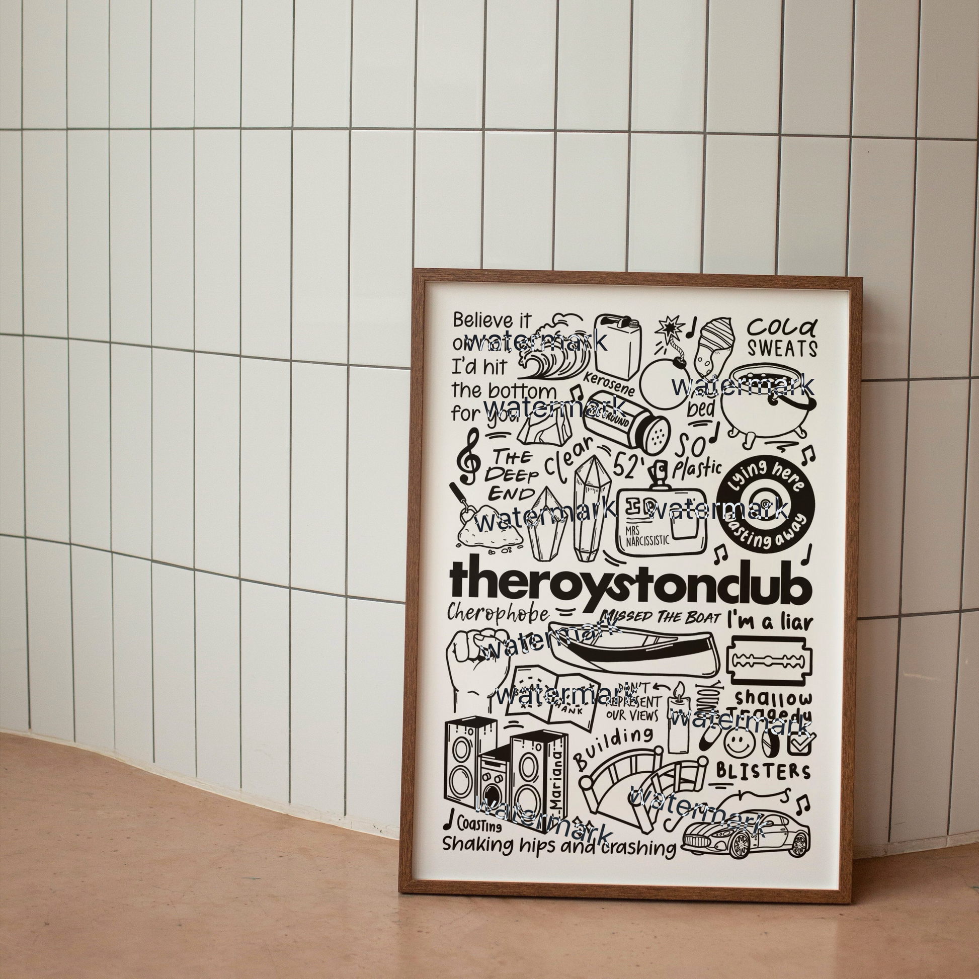 🎶 Arte mural del Royston Club que incluye imágenes, letras y títulos de canciones de sus álbumes.