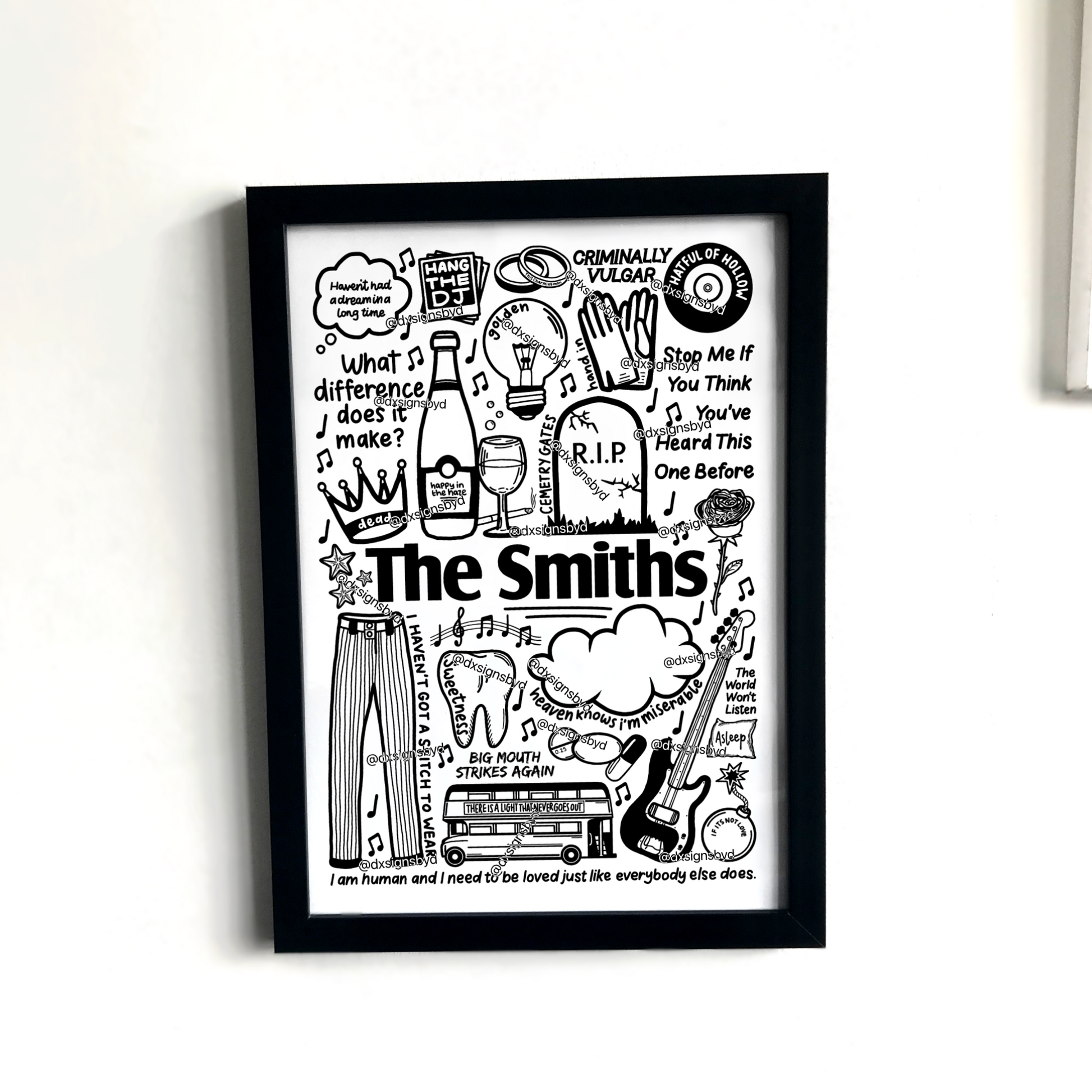 🎶Póster de The Smiths con imágenes y letras de canciones de sus álbumes como The Queen Is Dead, Strangeways Here We Come, The Smiths y Meat Is Murder.
