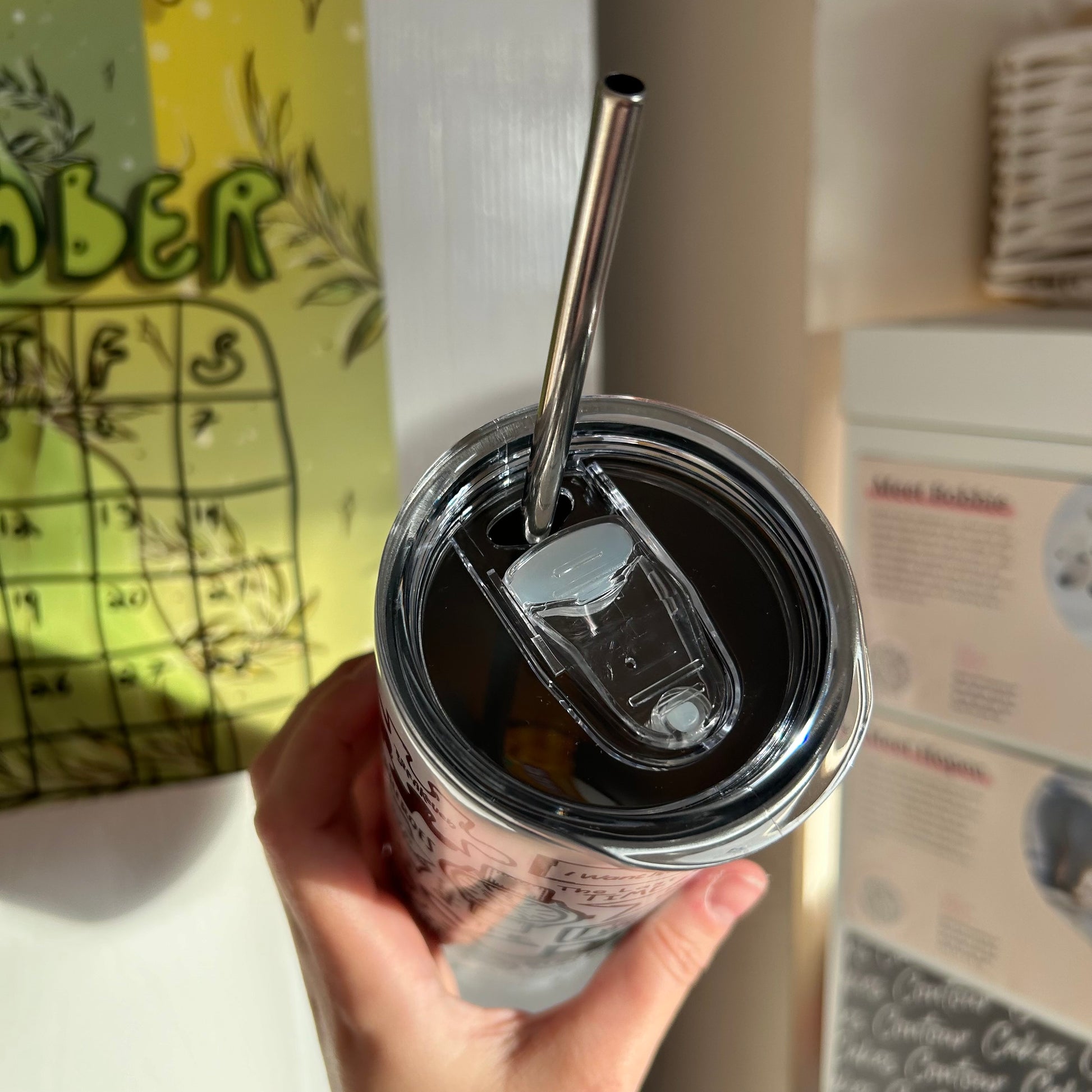 ☕️20oz double walled stainless steel cup with metal straw included. Ideal for upright use, we recommend our bottles instead if you require your cup to be leak-proof.