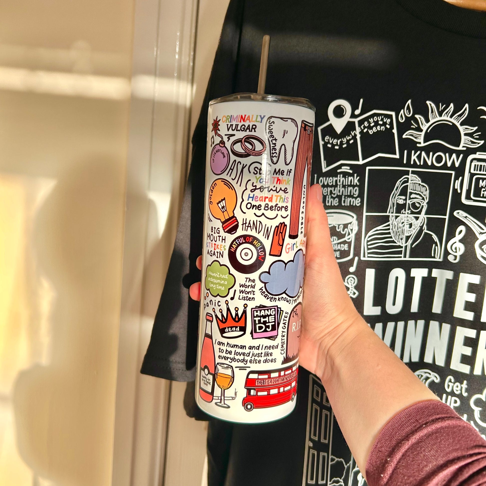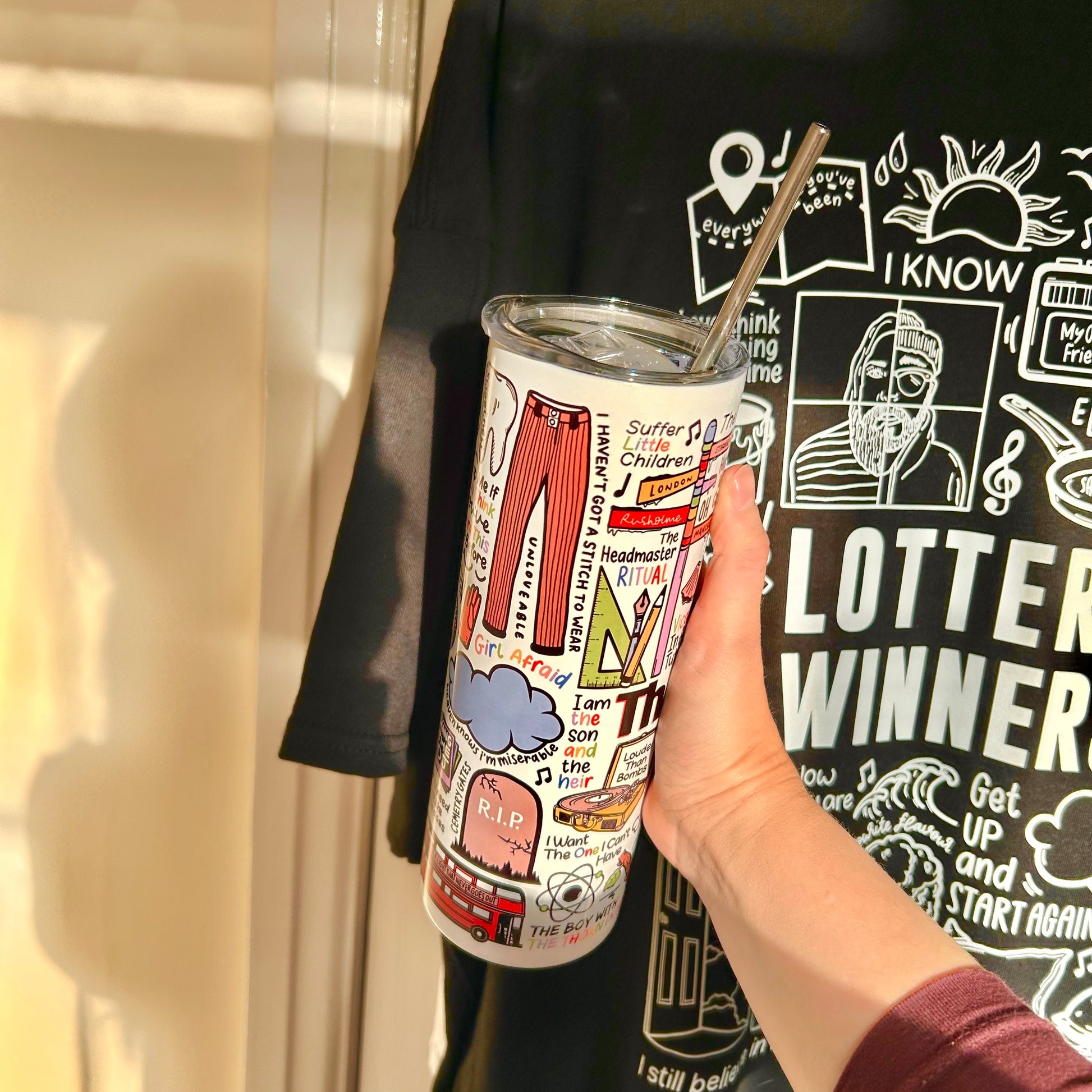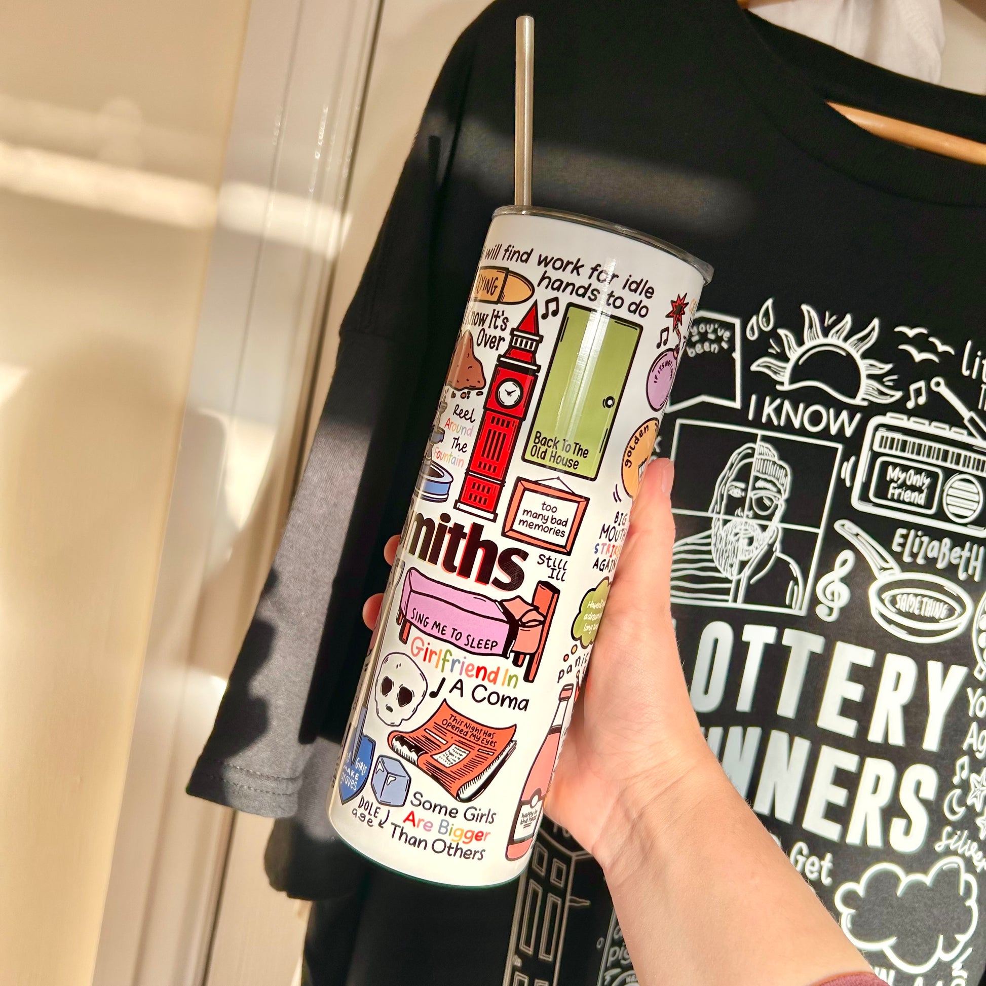 🥤Get lyrical with your beverages with our The Smiths travel drinks cup! This versatile cup keeps your drinks hot OR cold and your spirits high with fun lyrics and drawings printed all around the cup. Stay hydrated (and entertained) on the go with our tumblers🥰