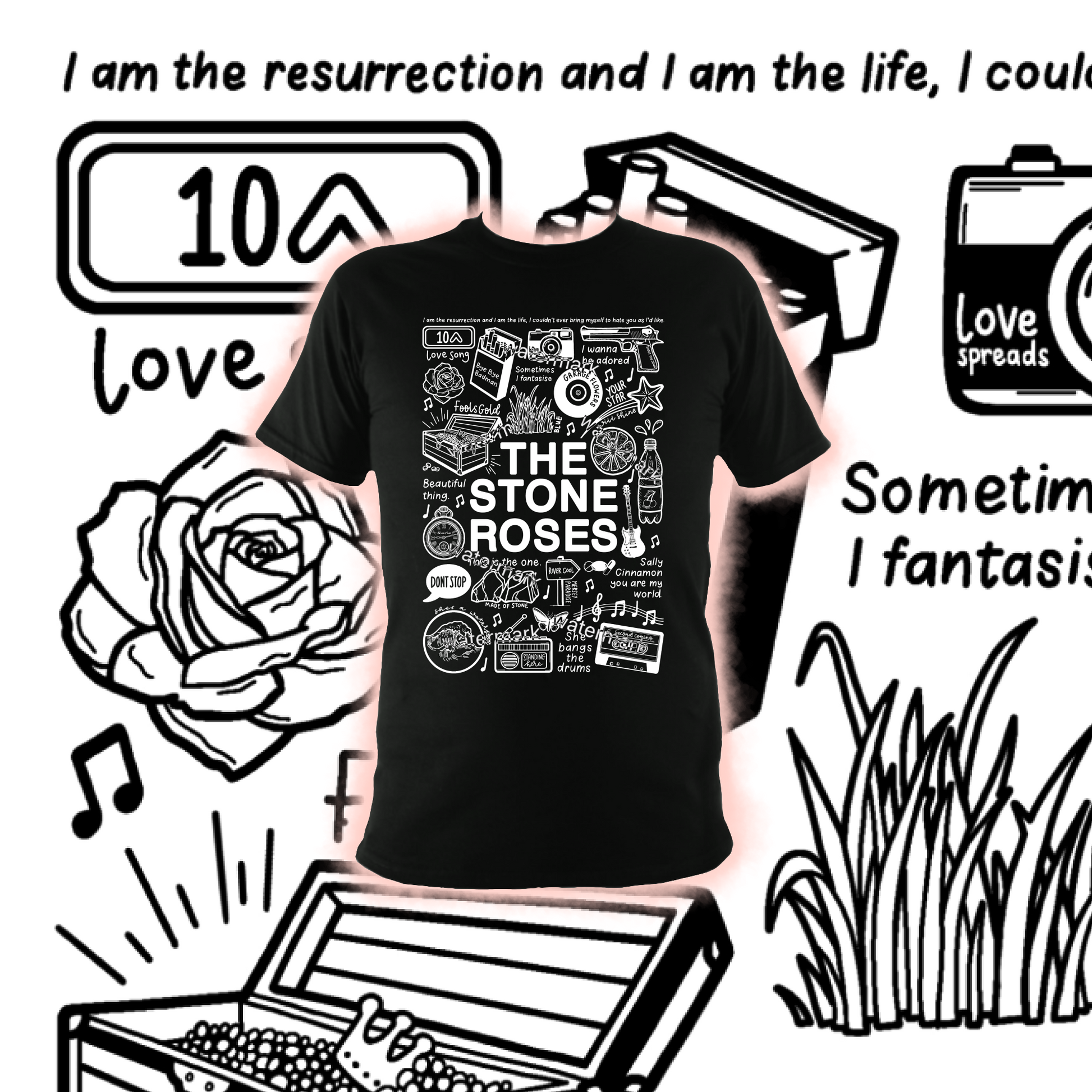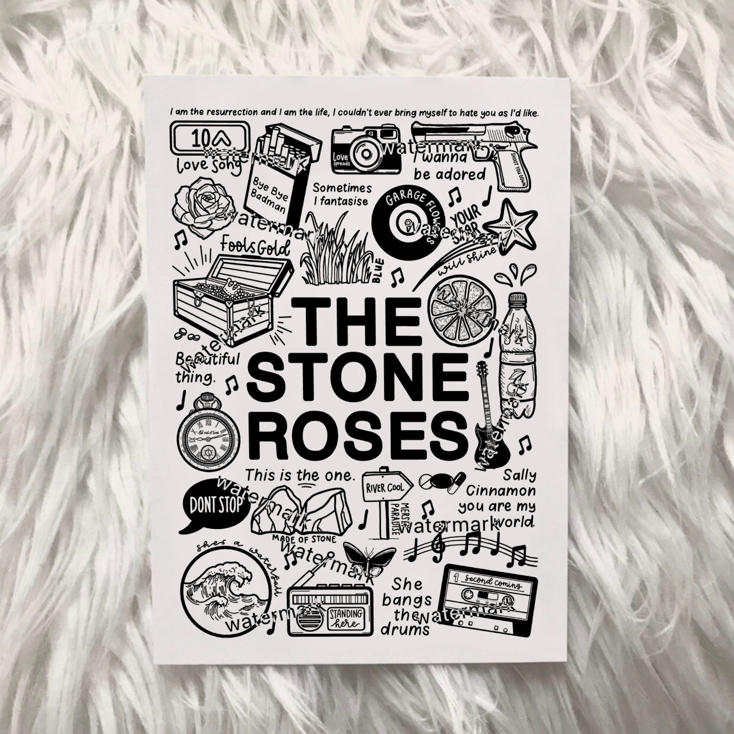 🎶Cartel de The Stone Roses con imágenes y letras de canciones de sus álbumes como The Stone Roses y Second Coming.