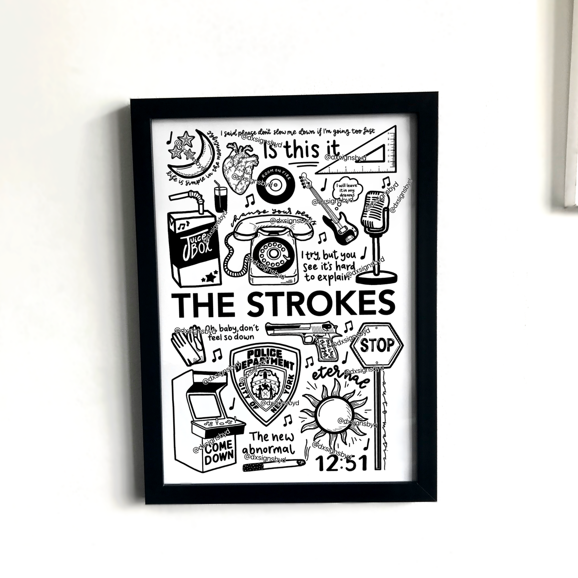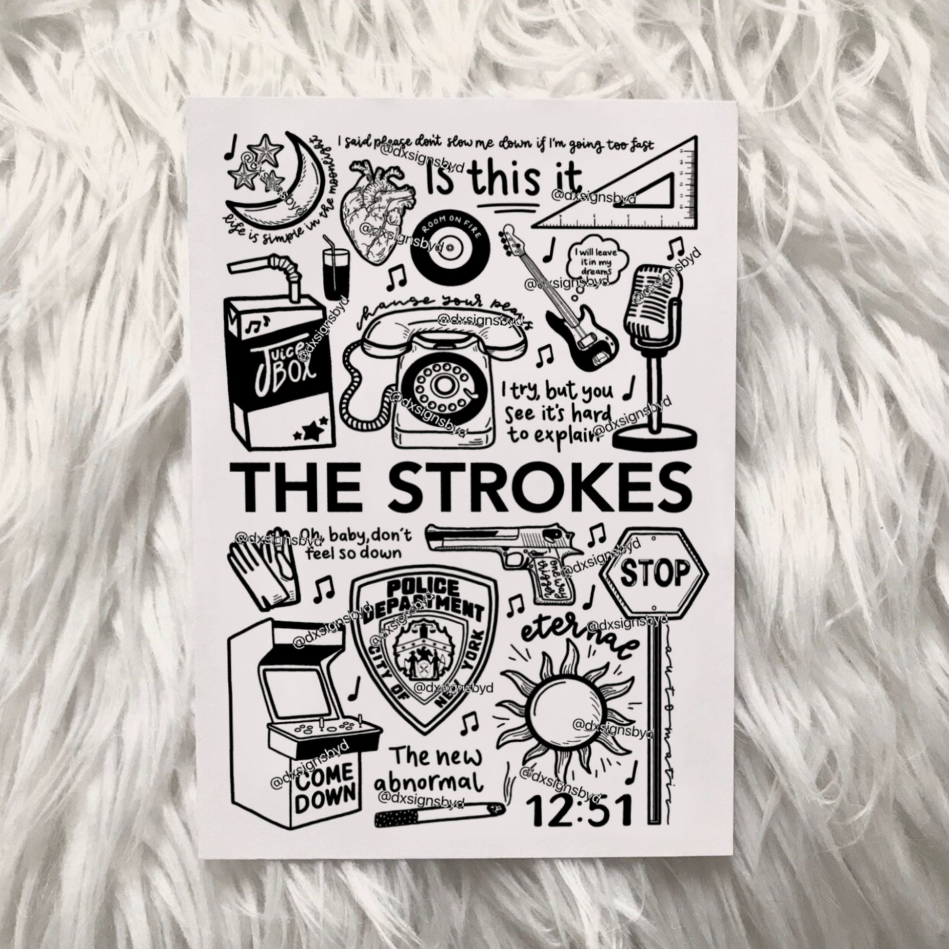 🎶 Póster de The Strokes con imágenes y letras de canciones de sus álbumes como Is This It, Room On Fire y The New Abnormal.