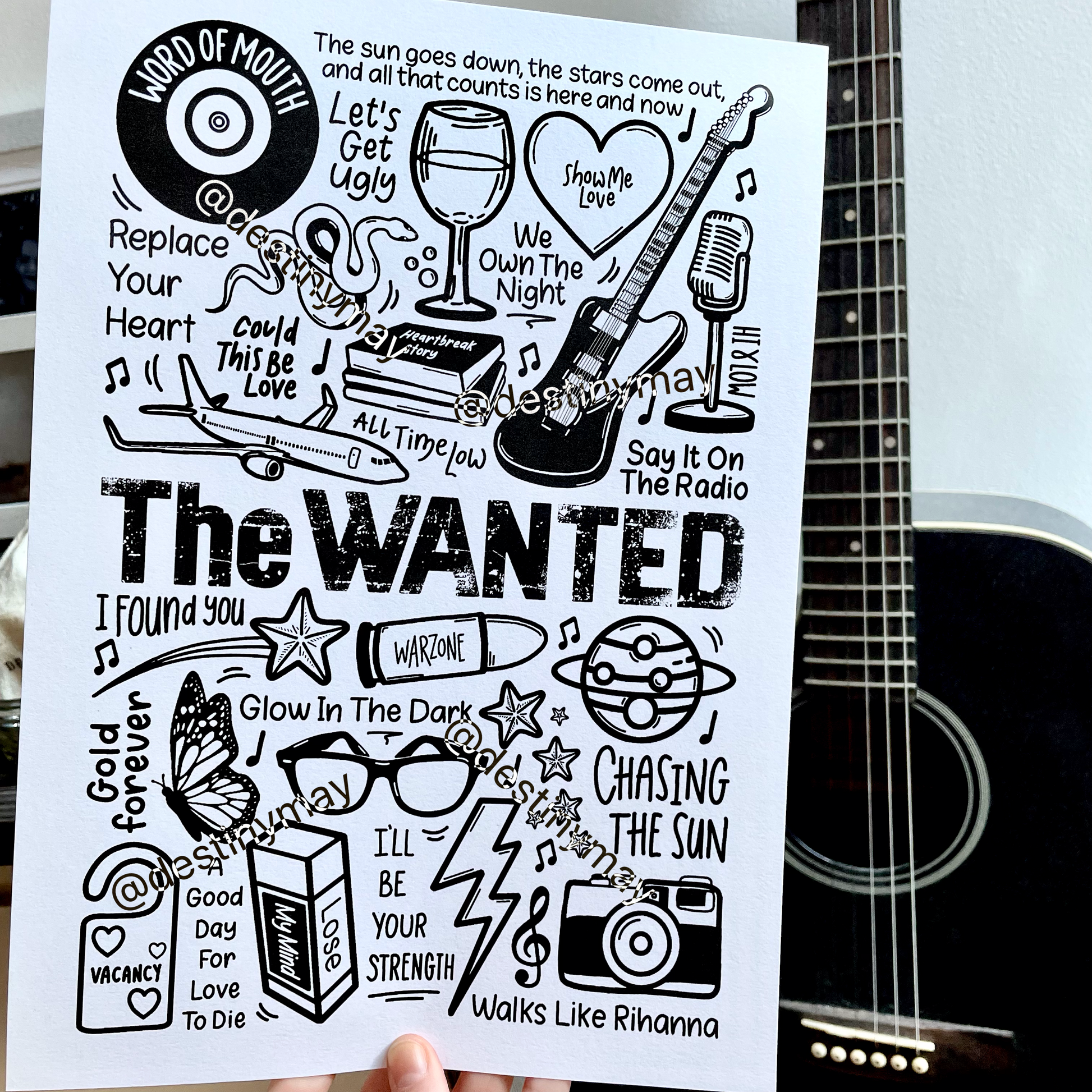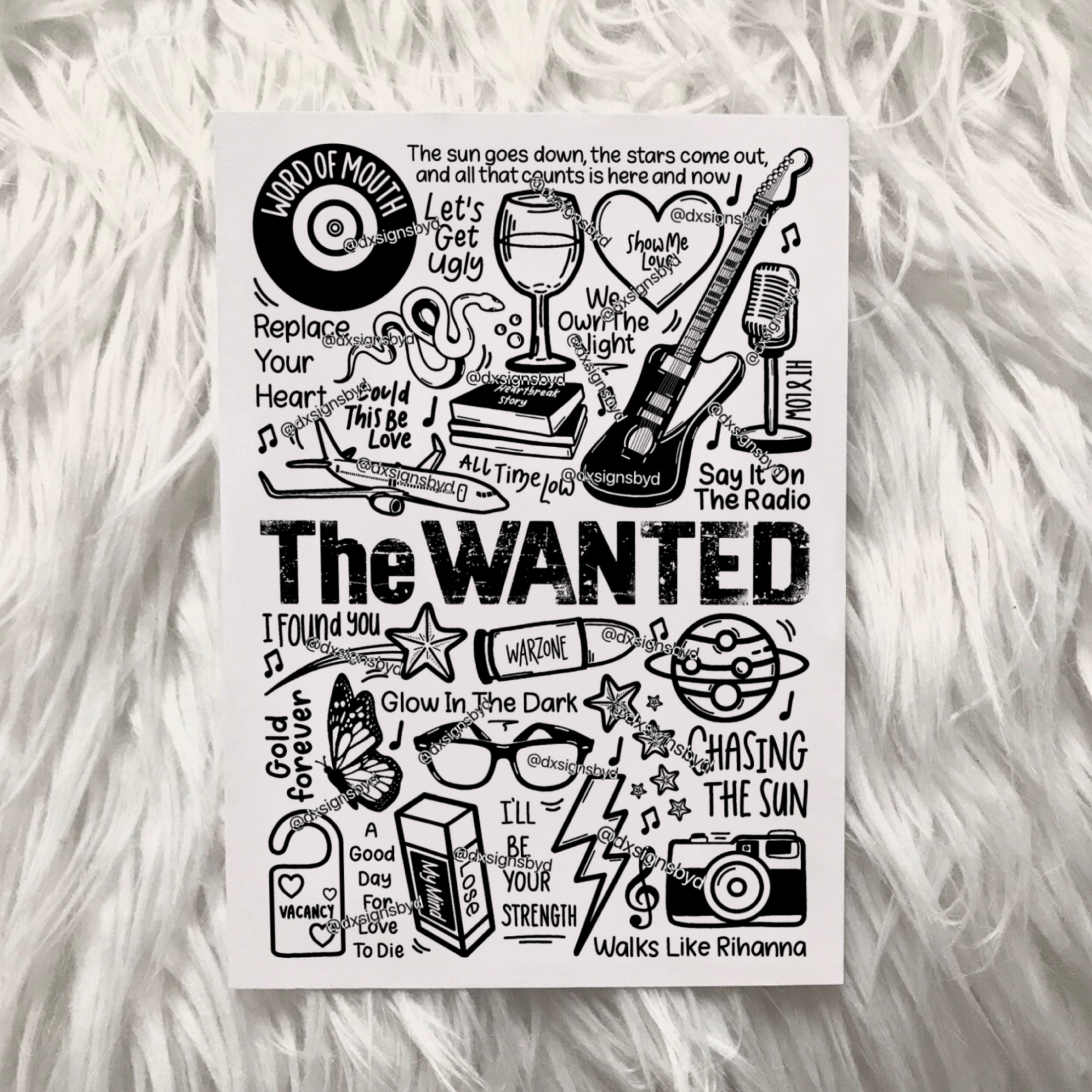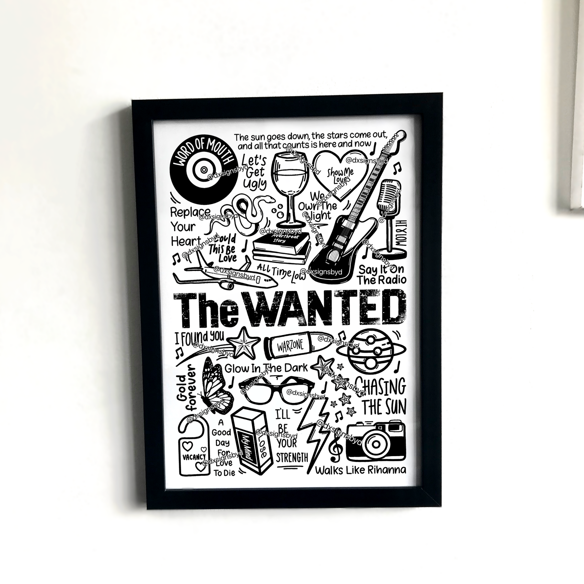 🎶El cartel de Wanted con imágenes y letras de canciones de sus álbumes como Battleground y Word of Mouth.