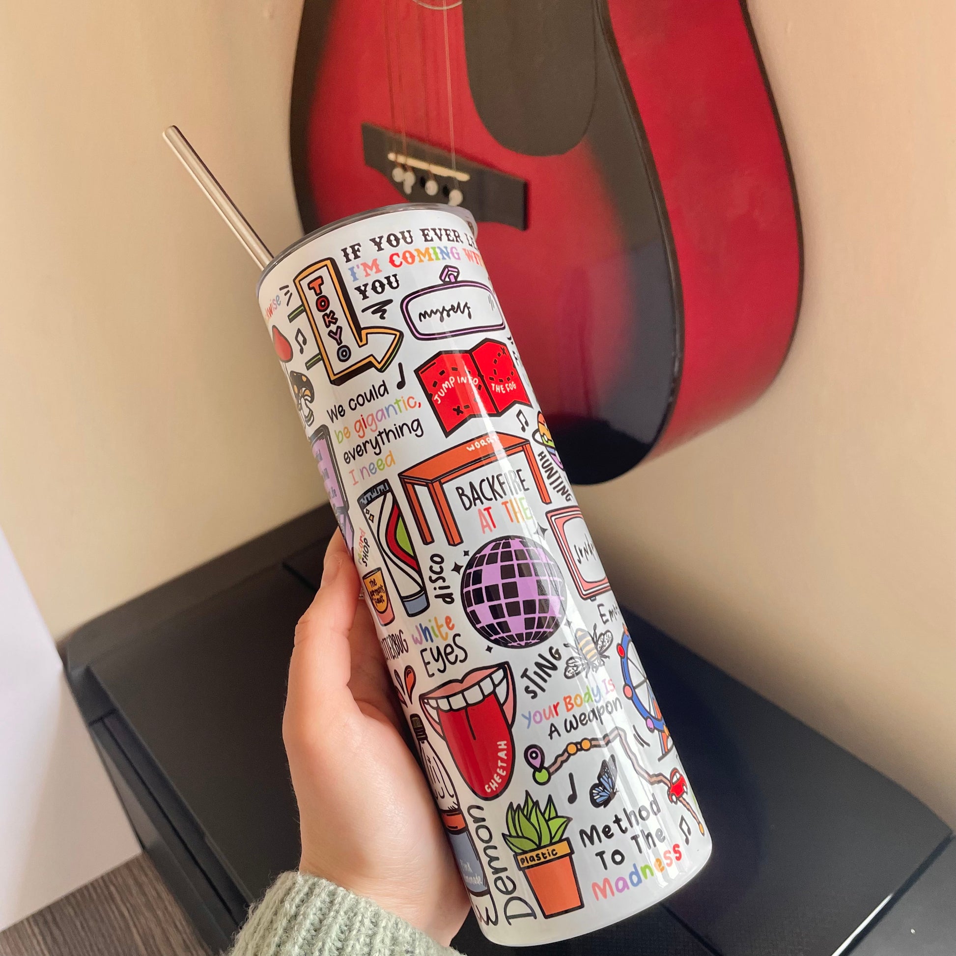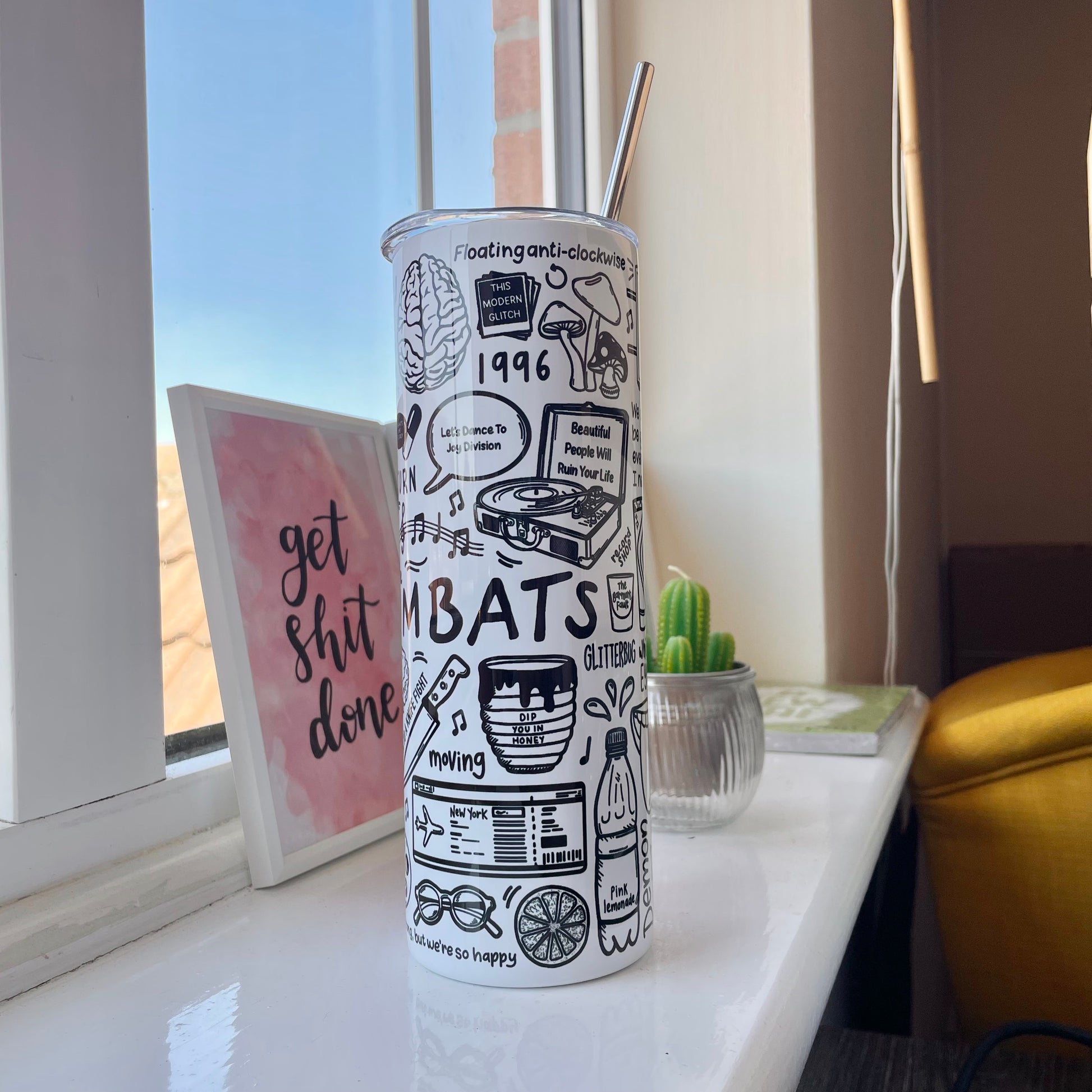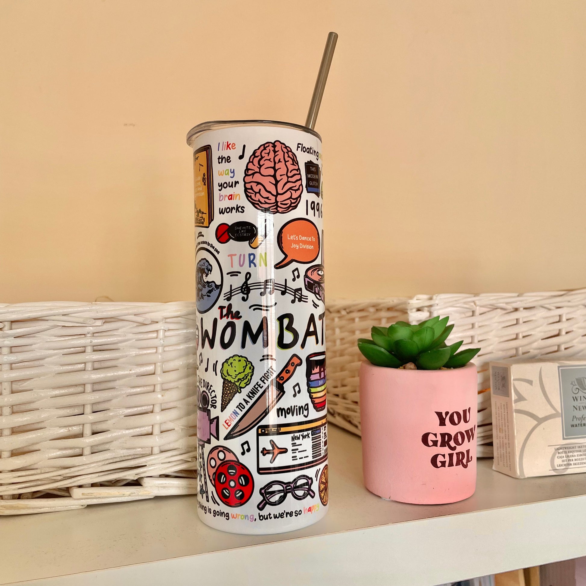 🥤Get lyrical with your beverages with our The Wombats travel drinks cup! This versatile cup keeps your drinks hot OR cold and your spirits high with fun lyrics and drawings printed all around the cup. Stay hydrated (and entertained) on the go with our tumblers🥰