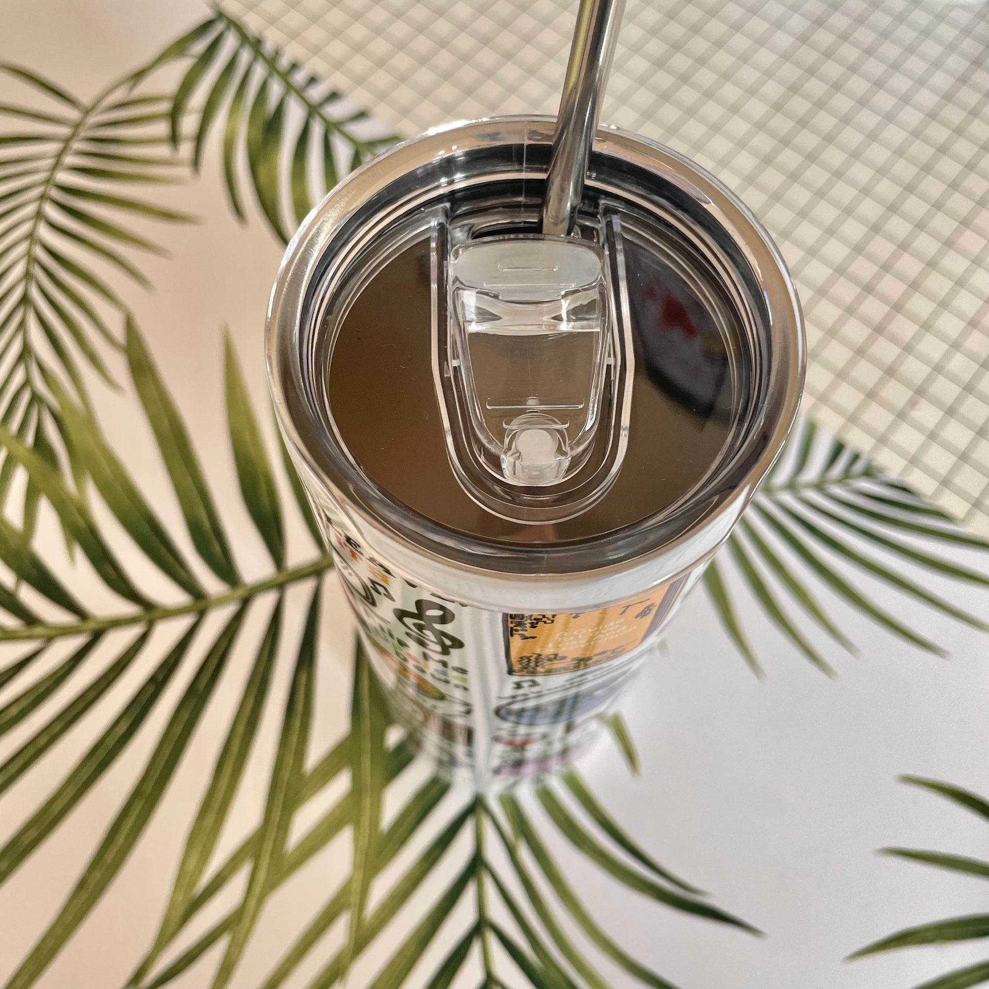 ☕️20oz double walled stainless steel cup with metal straw included. Ideal for upright use, we recommend our bottles instead if you require your cup to be leak-proof