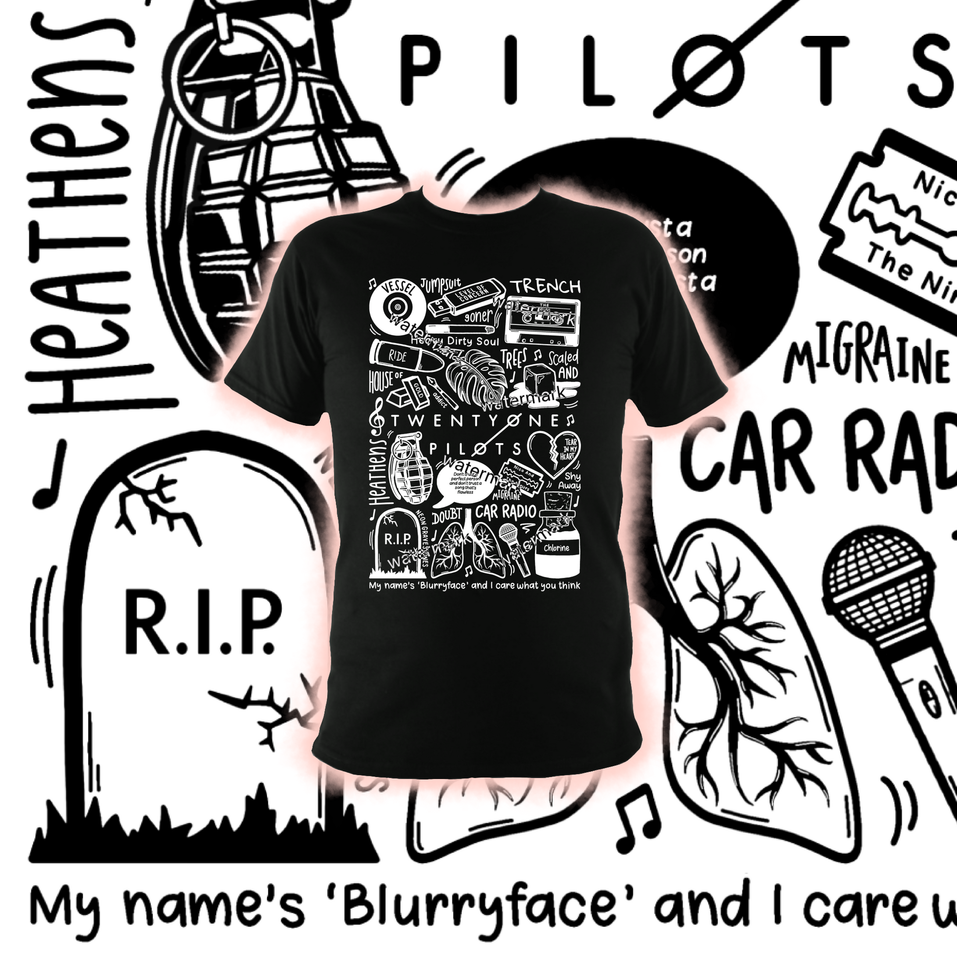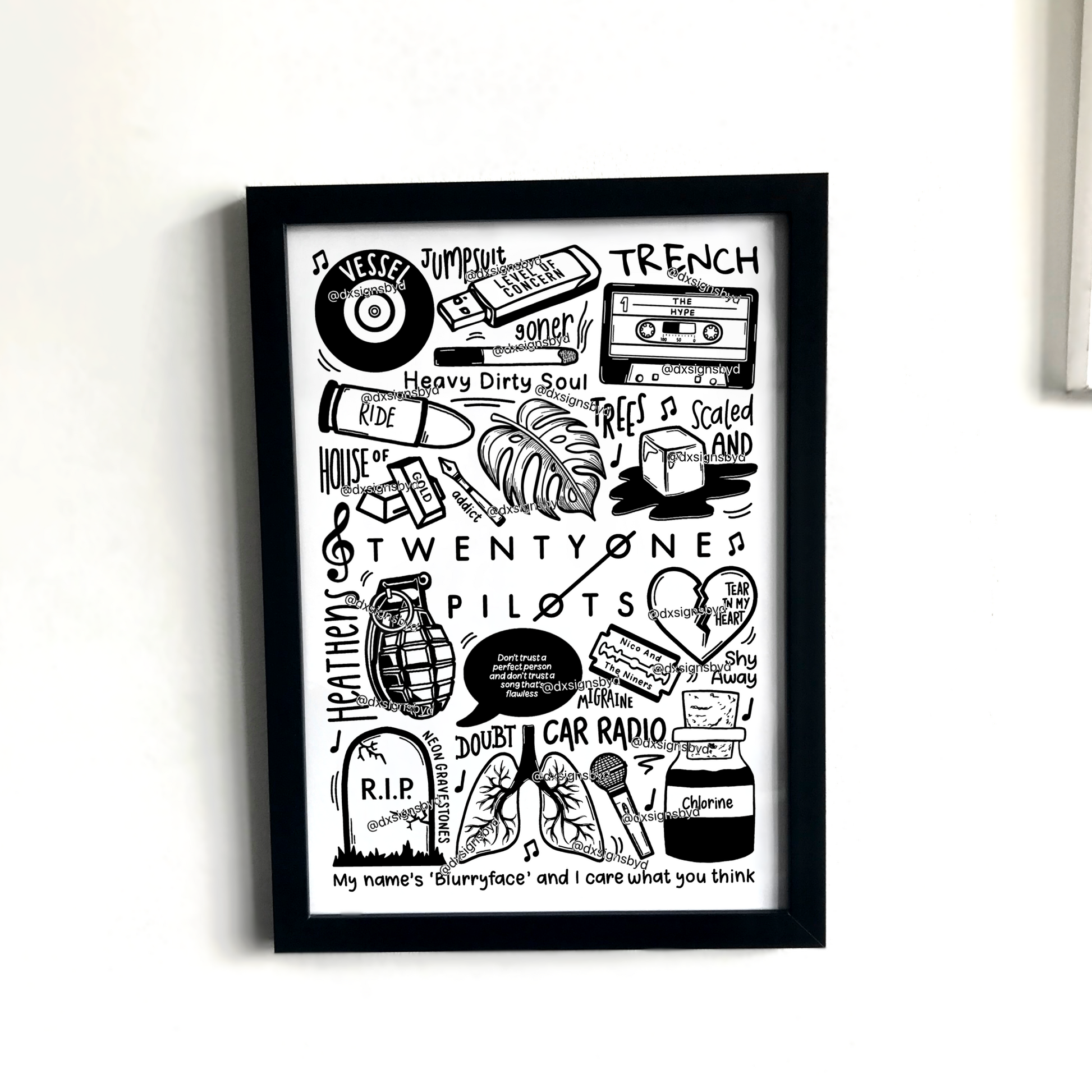🎶 Póster de Twenty One Pilots que incluye imágenes y letras de canciones de sus álbumes como Trench, Vessel, Scaled and Icy y Blurryface.