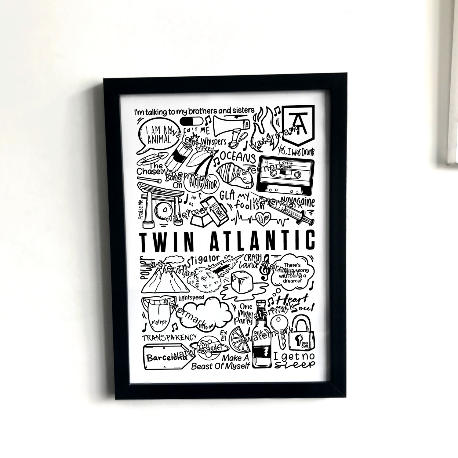 🎶 Impresión de póster de Twin Atlantic creada con un iPad y un Apple Pencil. Incluye imágenes y letras de canciones de sus álbumes.