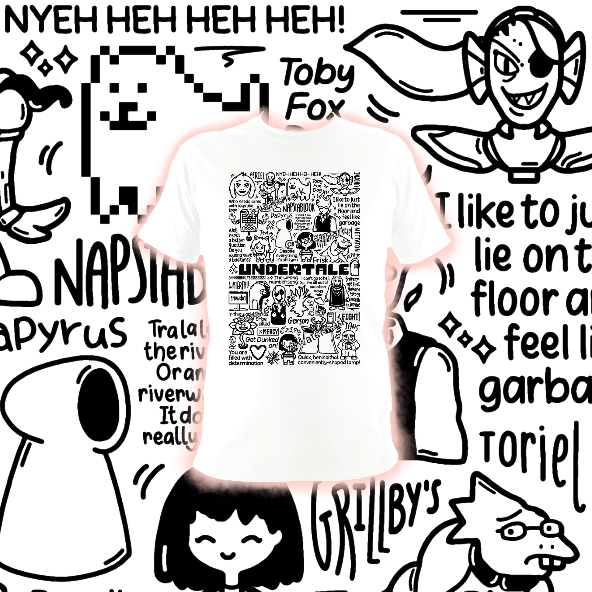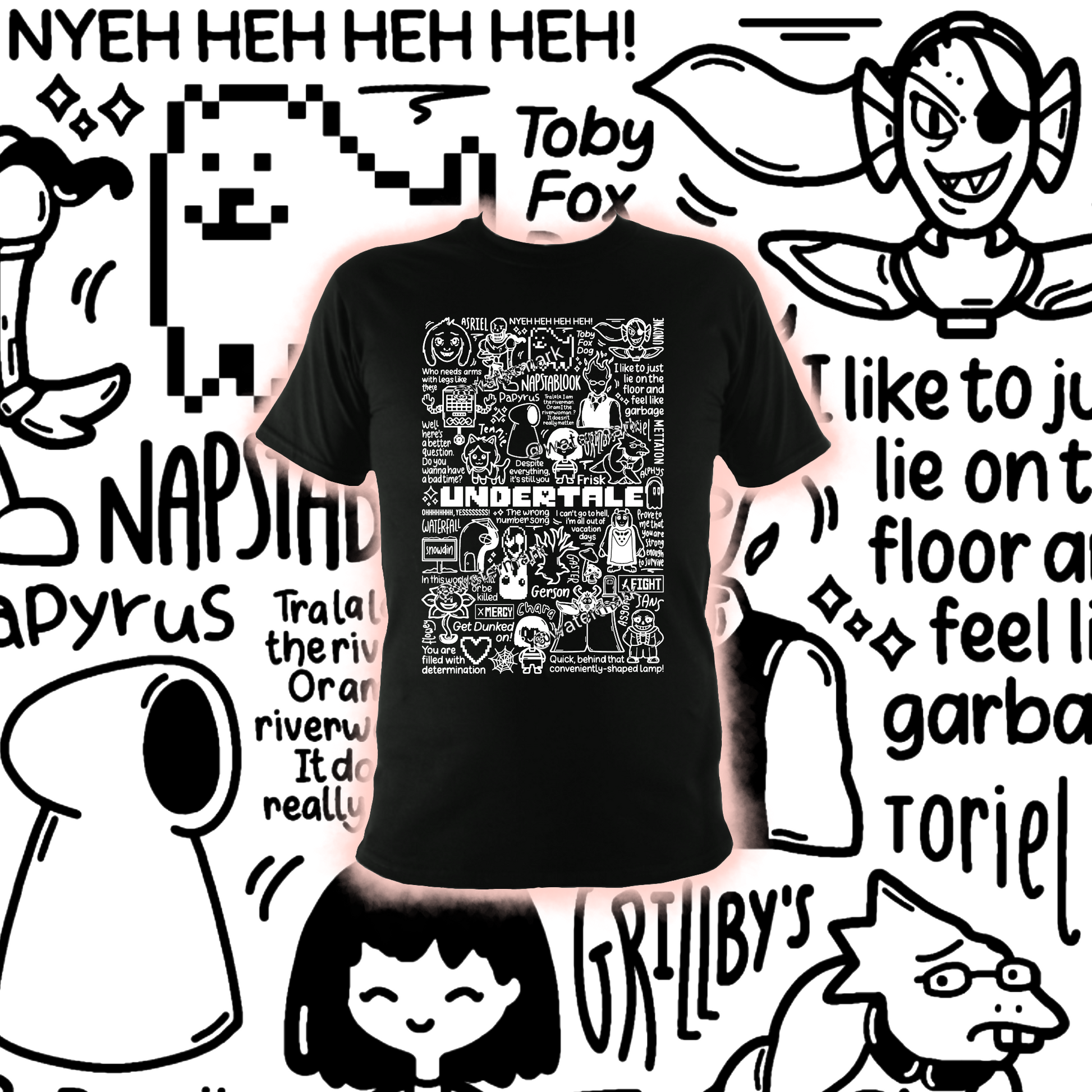 🎮Camiseta Undertale unisex de algodón impresa profesionalmente en blanco o negro. Incluyendo imágenes, qultra y personajes del juego como Chara, Sans, Napstablook, Asriel, Grillbys, Snowdin, Flowey y Gerson.