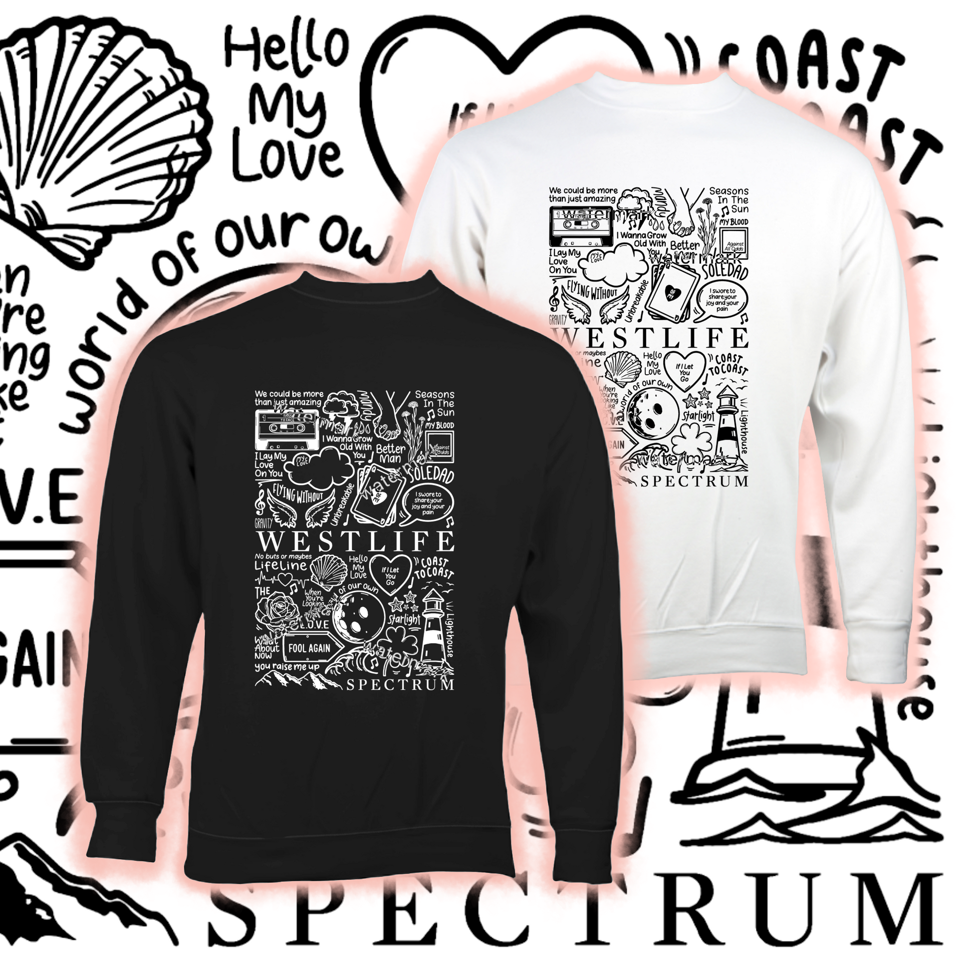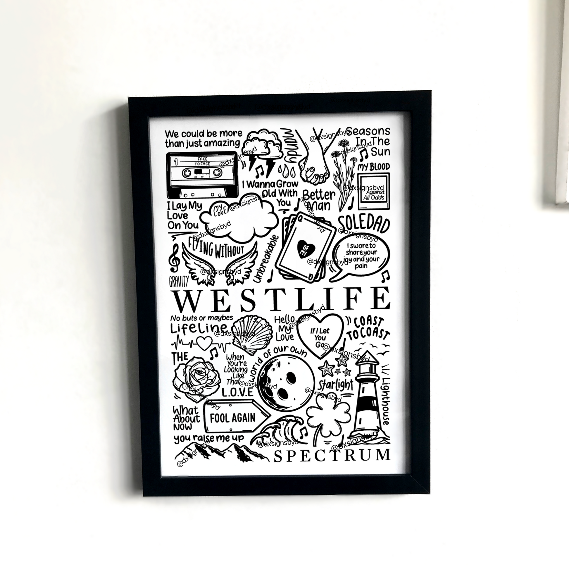 🎶 Póster de Westlife con imágenes y letras de canciones de sus álbumes como Wild Dreams, Coast To Coast, World Of Our Own, Westlife y Spectrum.