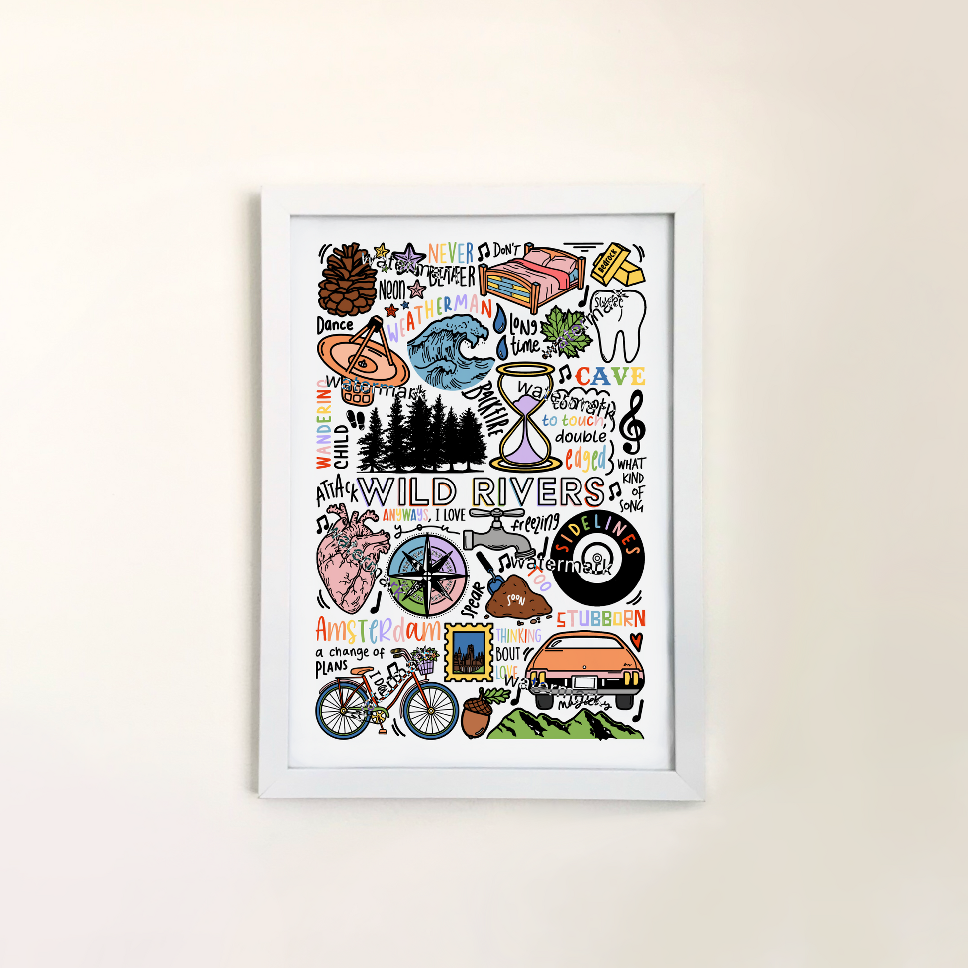🎶Wild Rivers wall art including images, lyrics, and song titles from their albums.