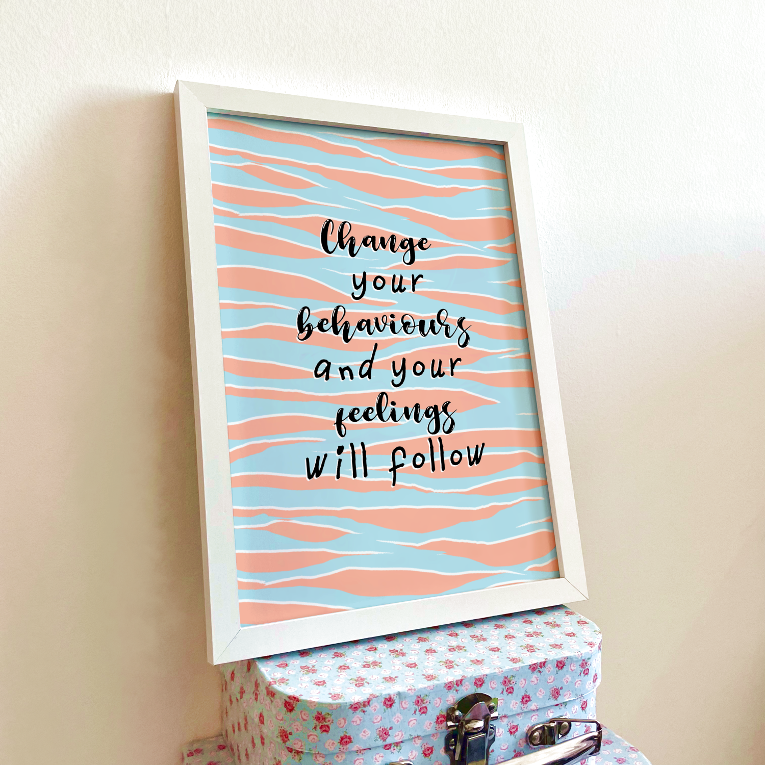 🩵Cartel positivo con la frase 'Cambia tus comportamientos y tus sentimientos te seguirán'.