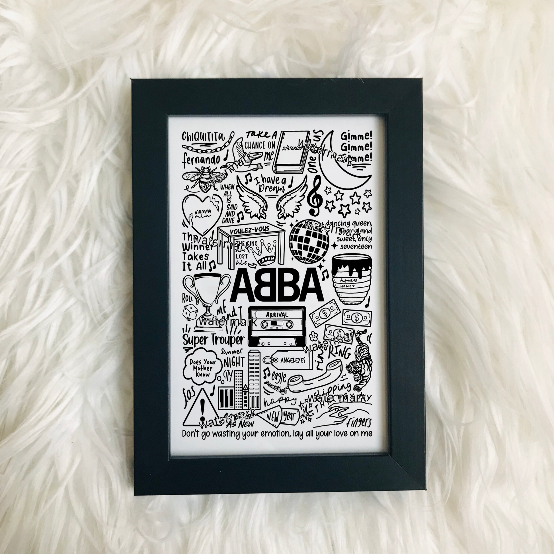 🎶ABBA wall art including images, lyrics, and song titles from their albums.