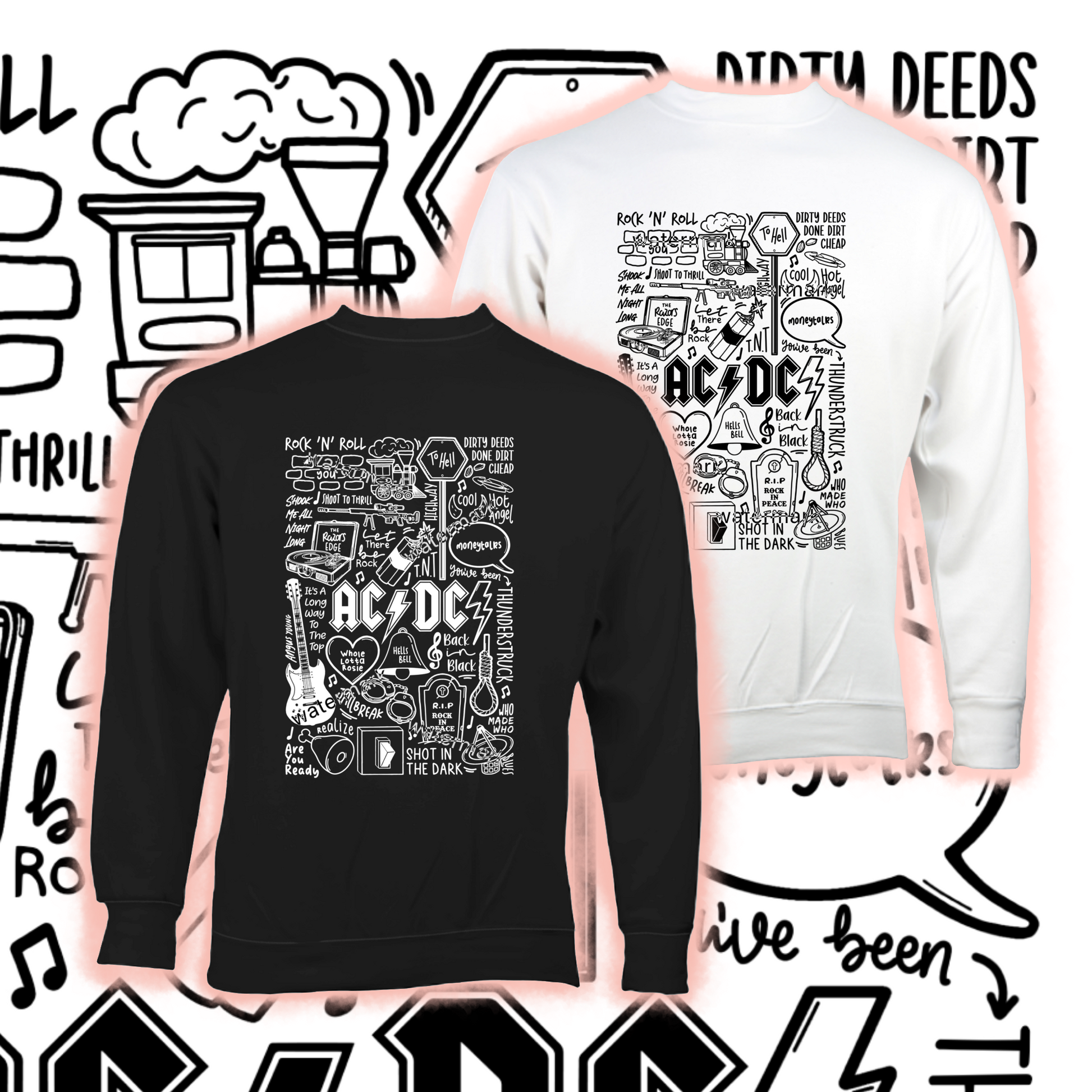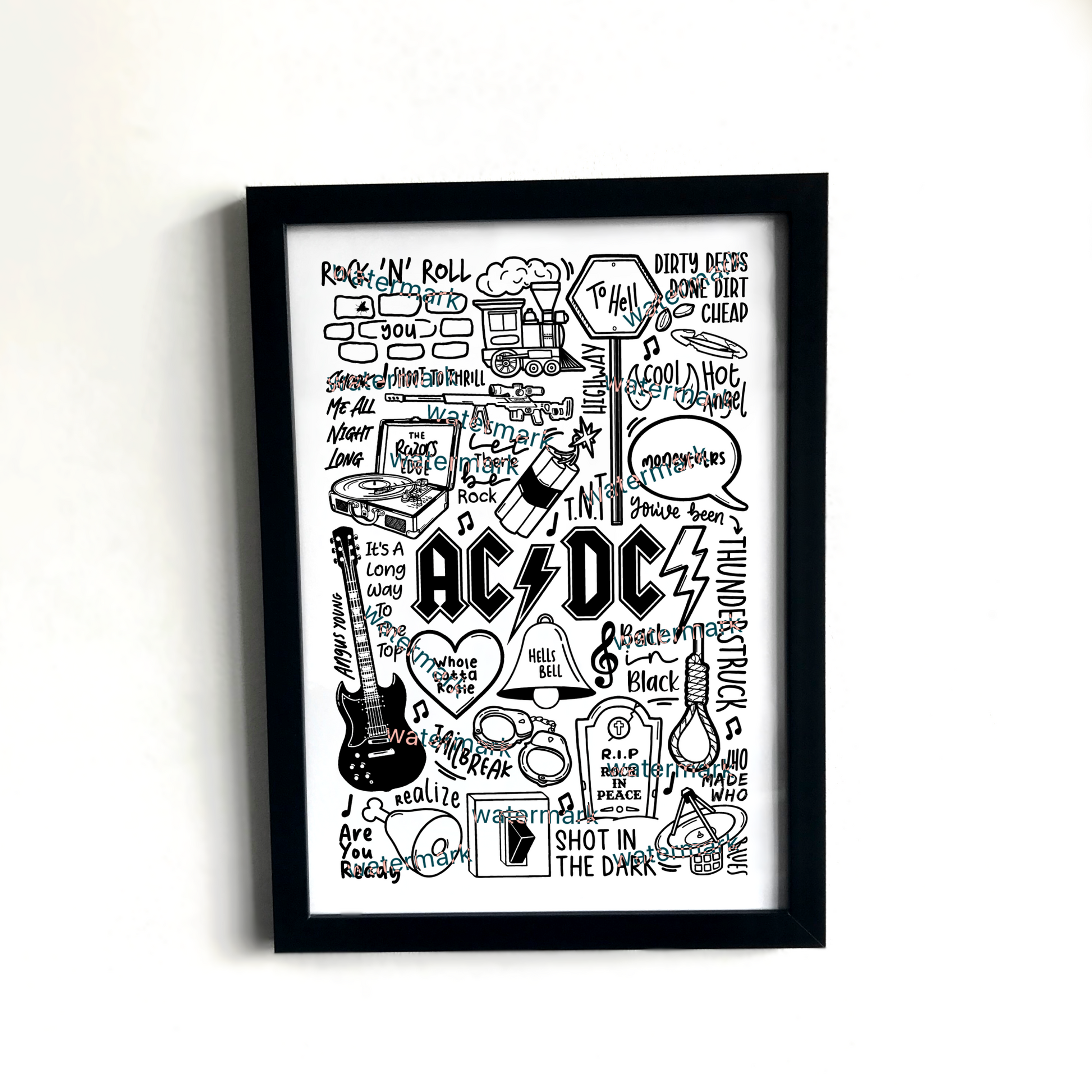 🎶 Art mural ACDC comprenant des images, des paroles et des titres de chansons de leurs albums.