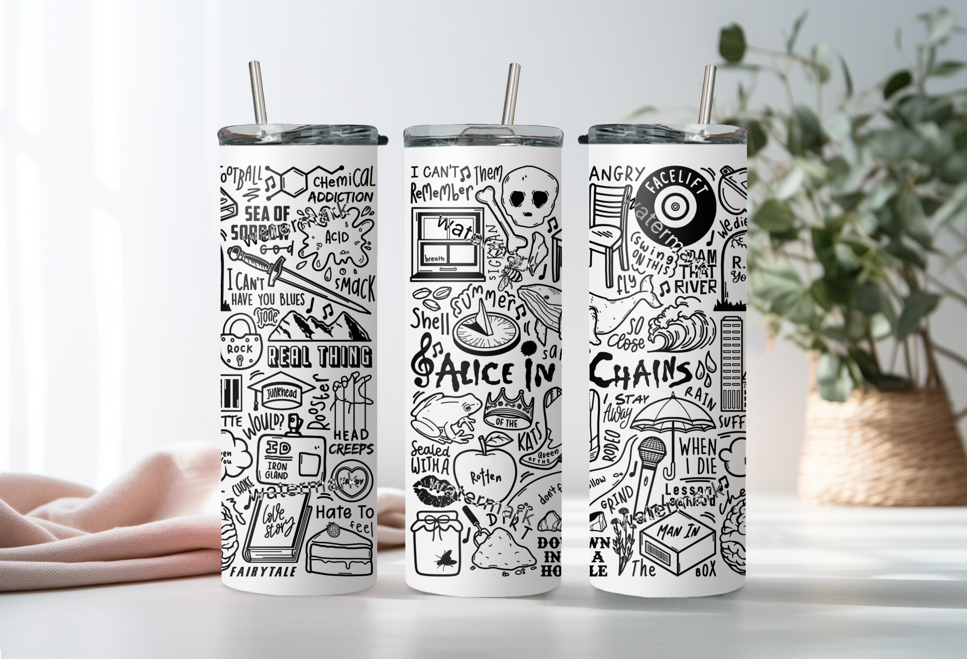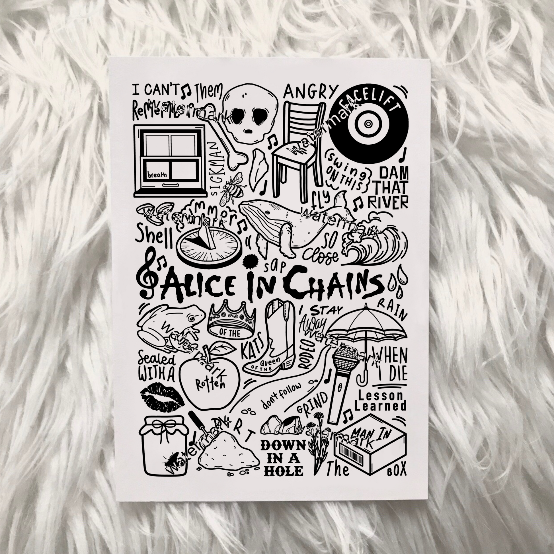 🎶Alice In Chains wall art including images, lyrics, and song titles from their albums.