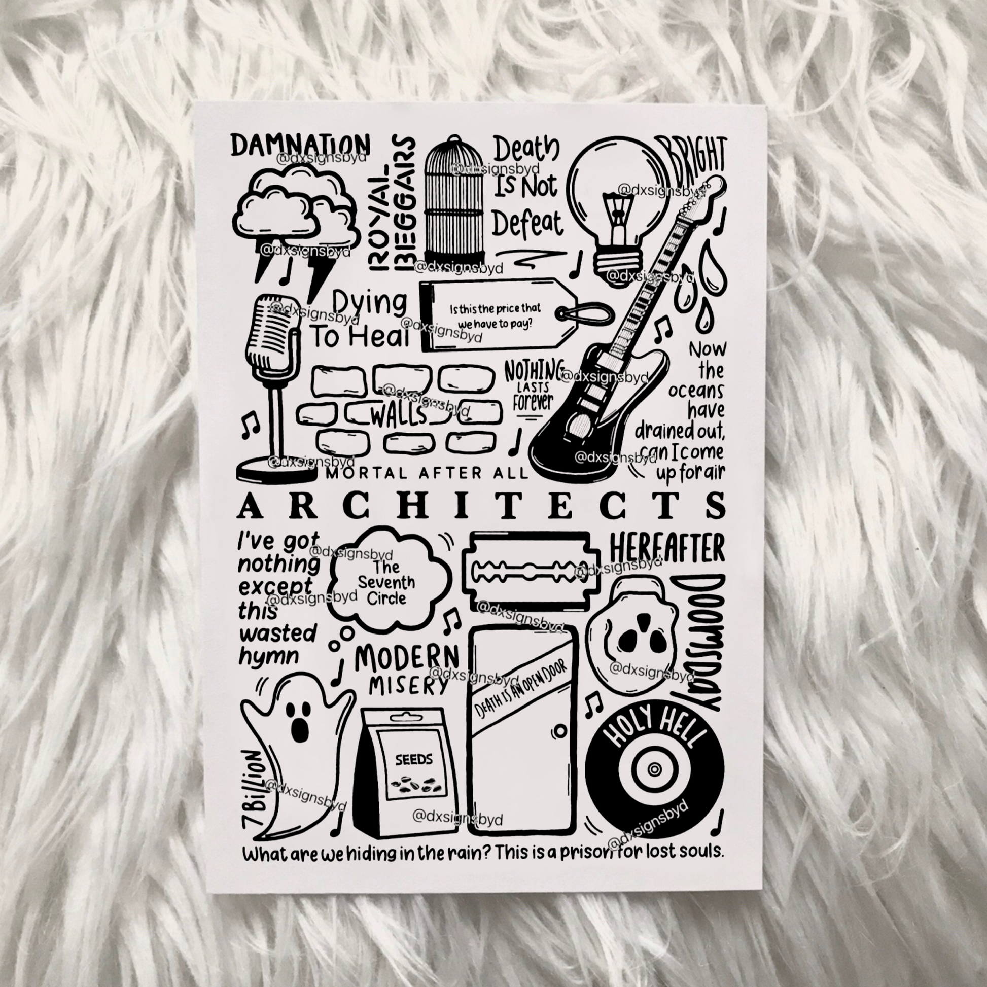 🎶Affiche d'architectes avec images et paroles de chansons de leur album Holy Hell.