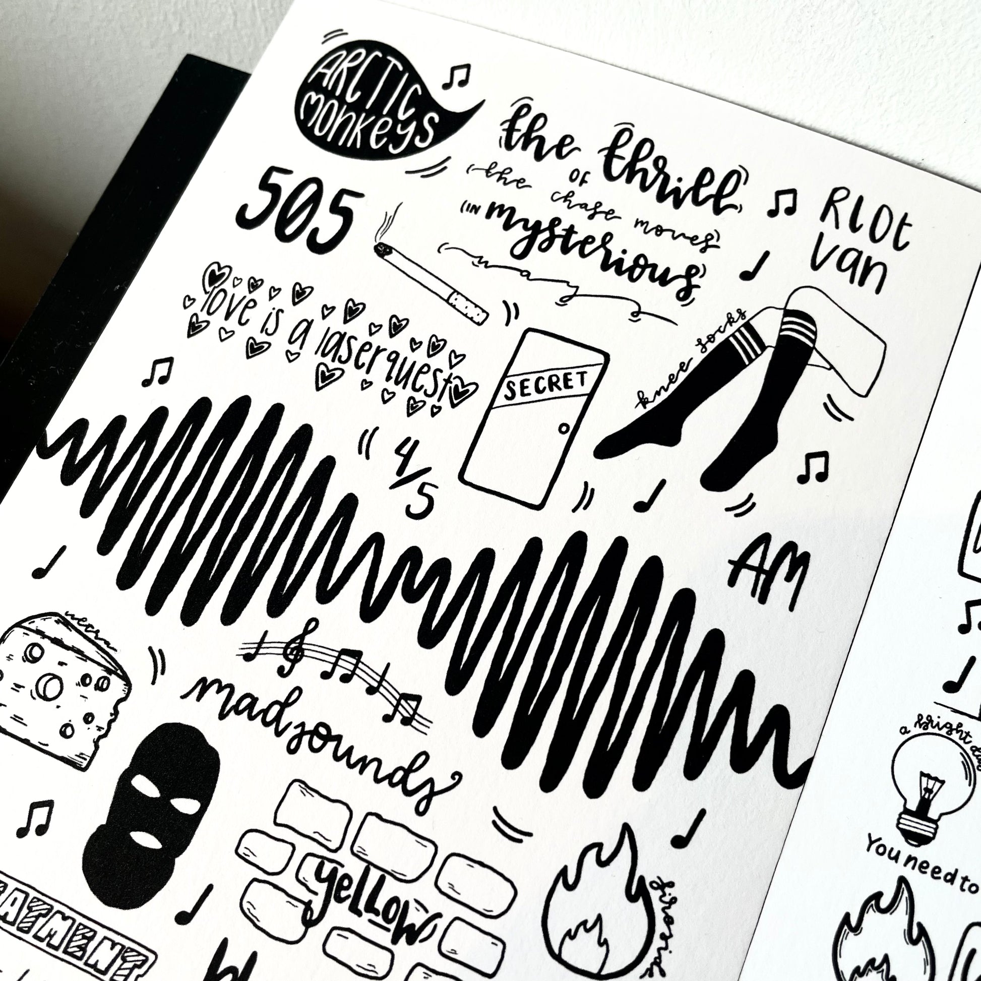🎶Affiche AM avec images et paroles de chansons de leurs albums Whether People Say I Am, That's Is What I'm Not, Humbug, Suck It And See, AM, Favourite Worst Nightmare et Tranquility Base Hotel & Casino.