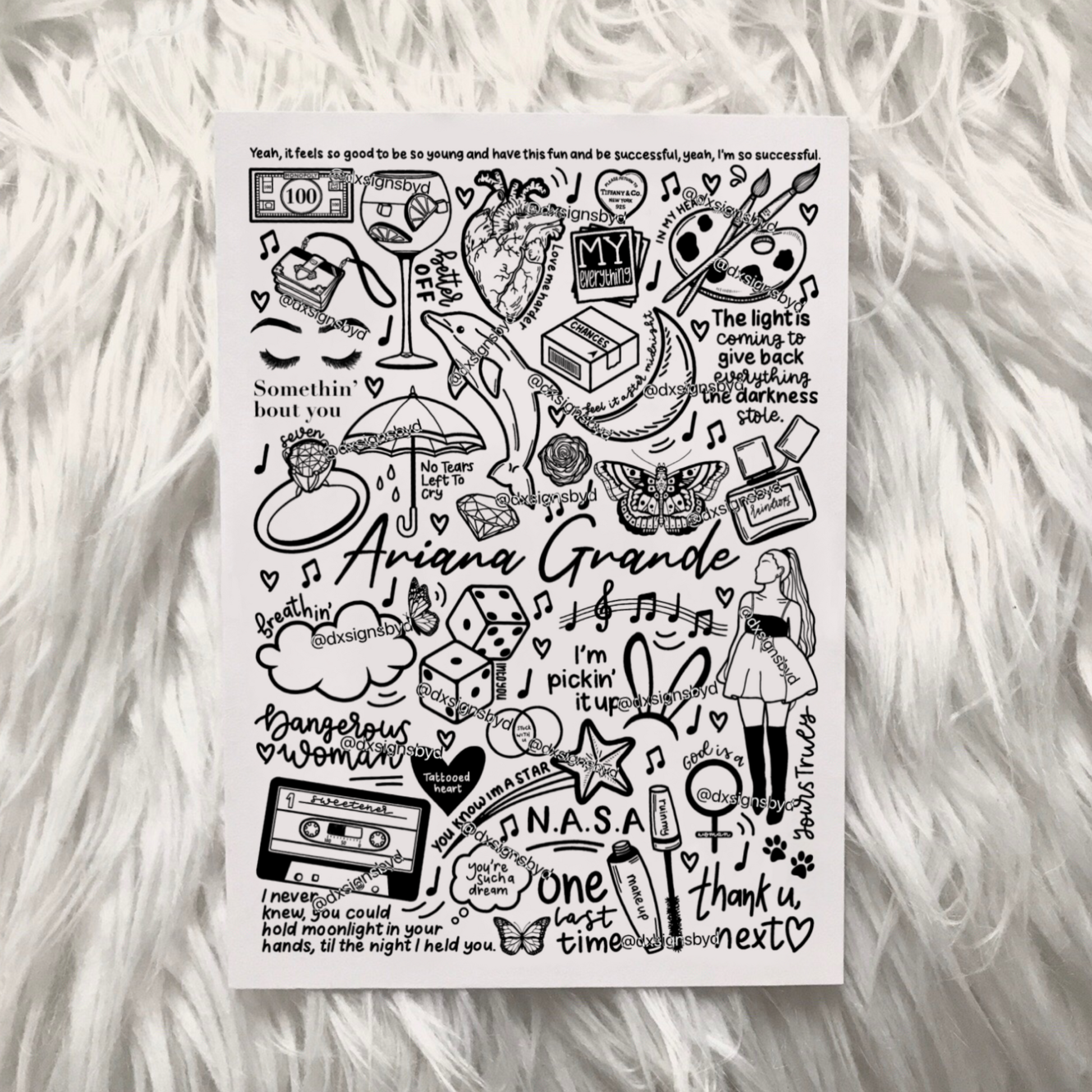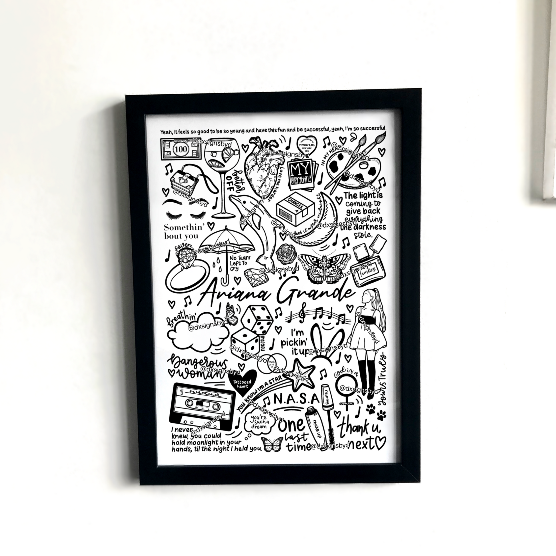 🎶Affiche imprimée d'Ariana Grande créée à l'aide d'un iPad et d'un Apple Pencil. Elle comprend des images et des paroles de chansons de ses albums tels que Thank u, Next, Sweetener, Dangerous Woman, My Everything et Yours Truly.