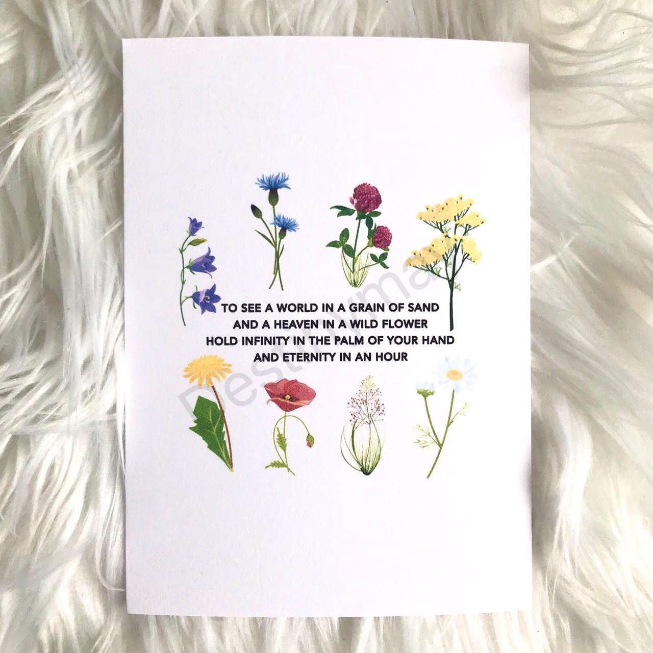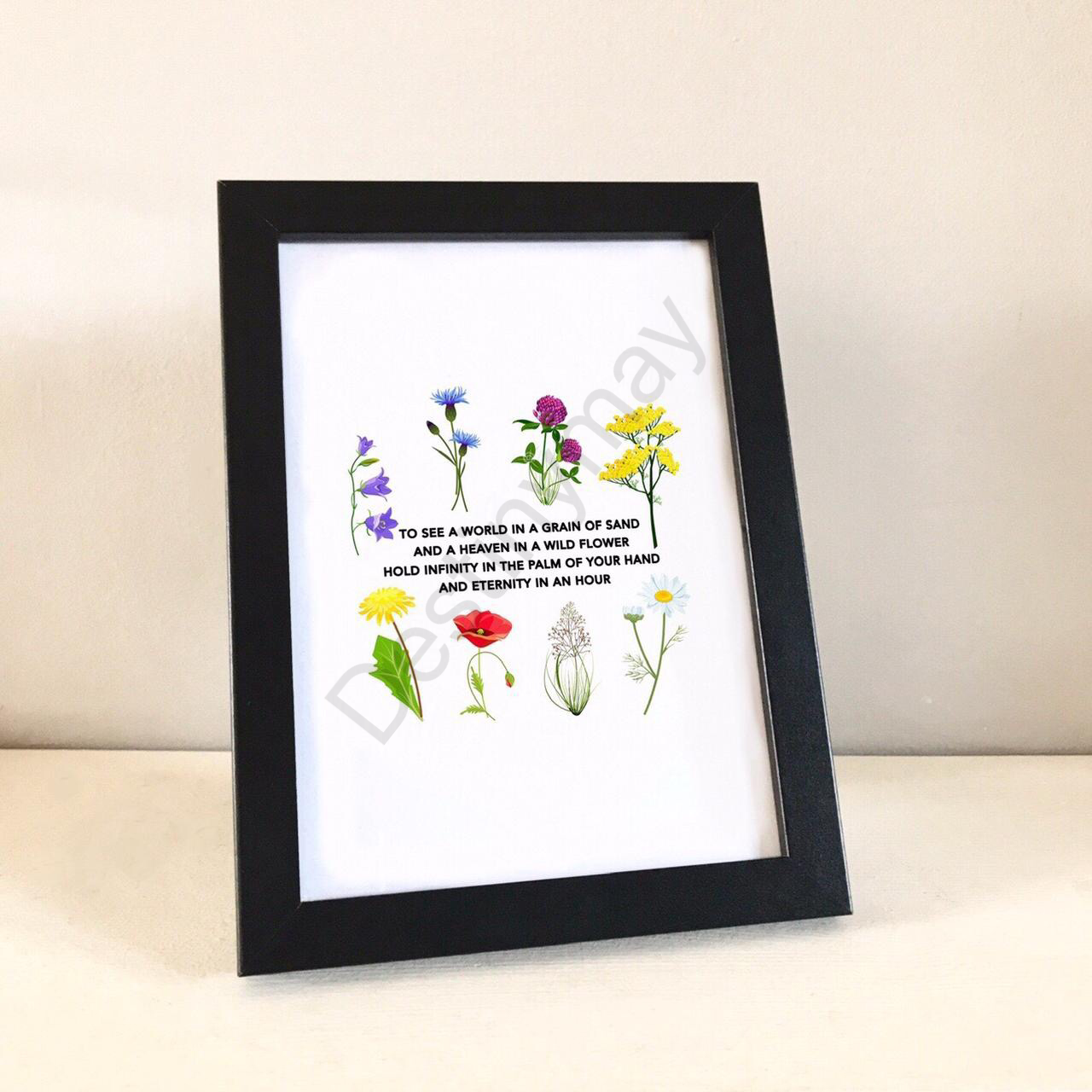 💛Auguries of Innocence Affiche de William Blake avec citation entourée d'une illustration d'une variété de types et de couleurs de fleurs.