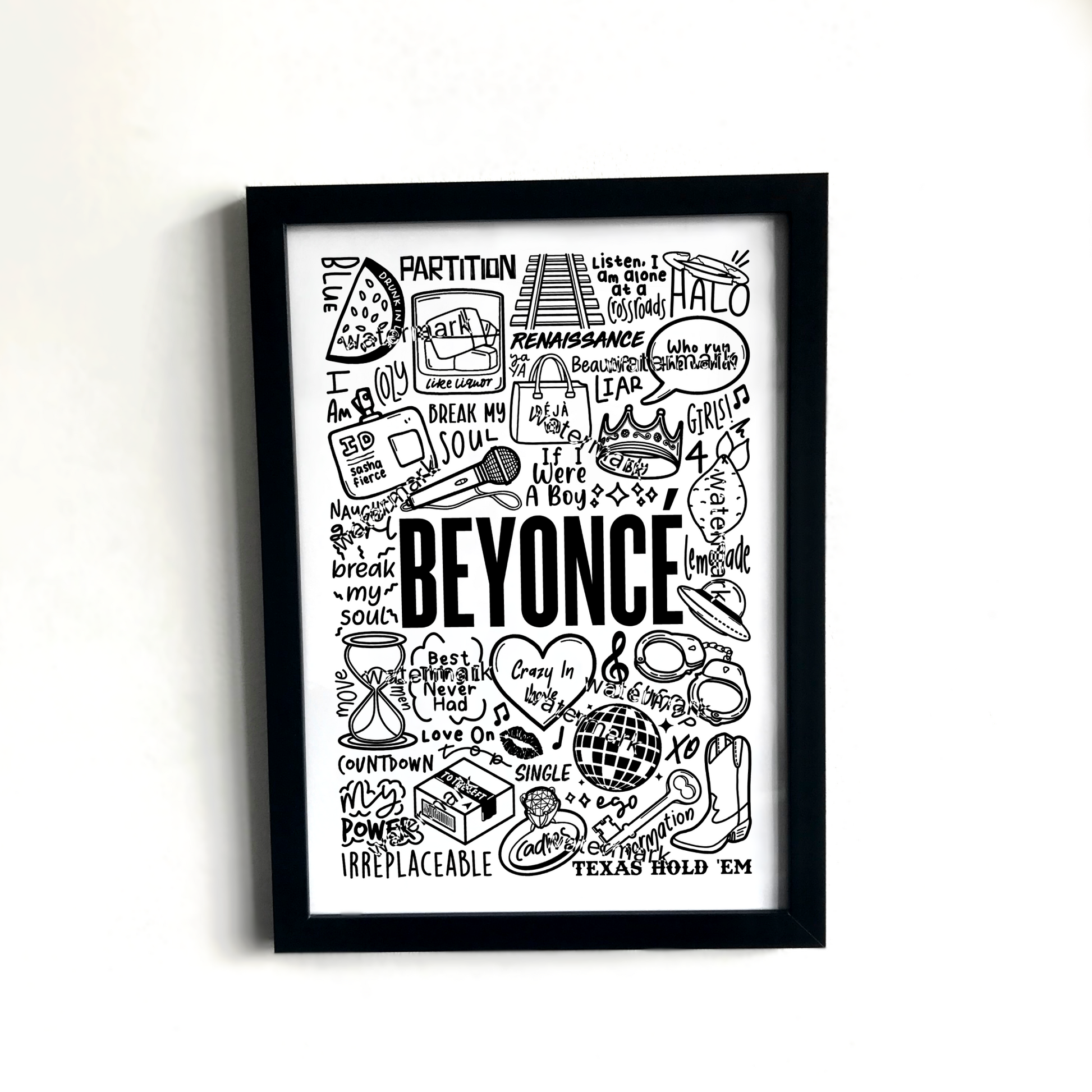 🎶Beyoncé wall art including images, lyrics, and song titles from her albums.