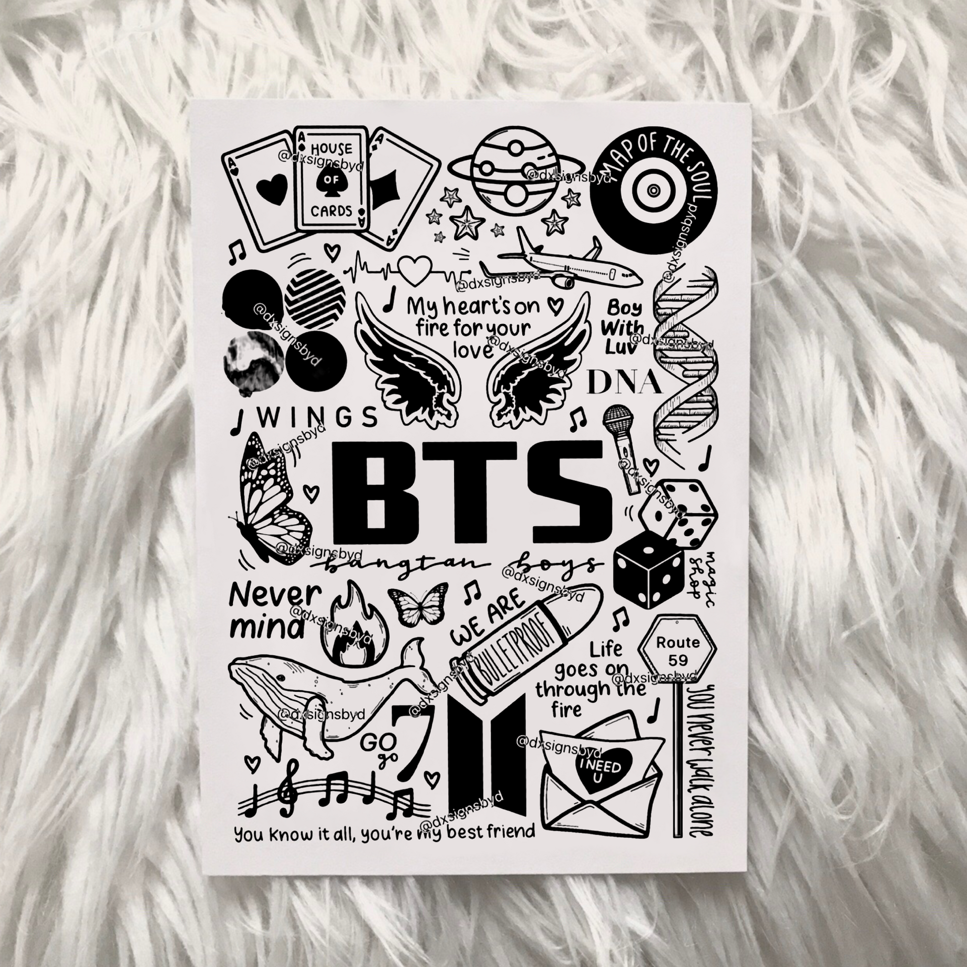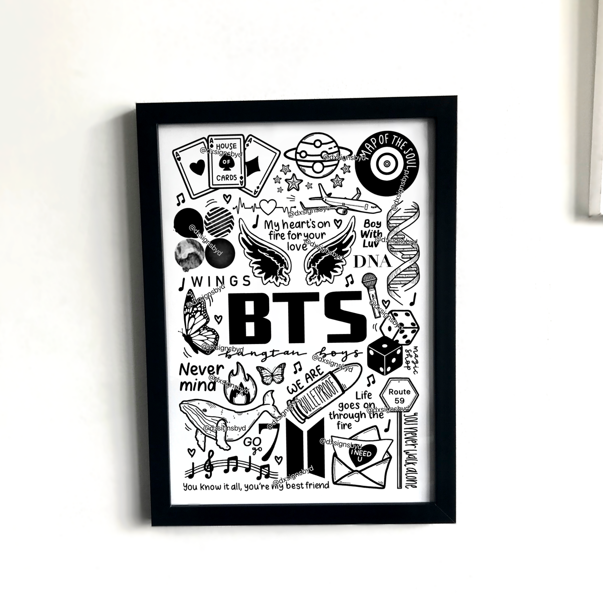 🎶Affiche imprimée des Bangtan Boys avec des images et des paroles de chansons de leurs albums tels que Map Of The Soul: 7, BE, Wings, Love Yourself: Tear, Skool Luv Affair, Dark & Wild, Face Yourself, Wake Up et You Never Walk Alone. Ainsi que des chansons telles que Dynamite, Butter, Boys With Luv, Life Goes On, Fire, IDOL et Euphoria.