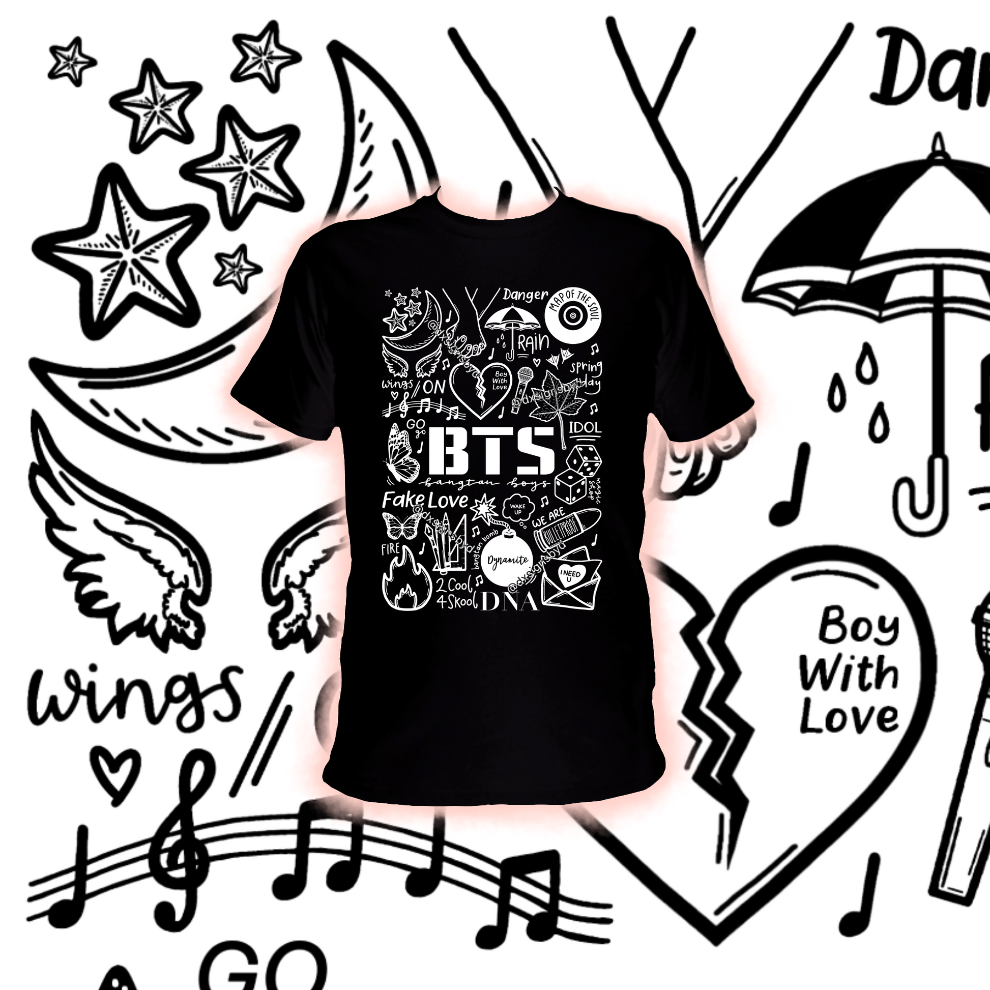 T-shirt BTS unisexe en coton imprimé professionnellement en noir ou blanc.