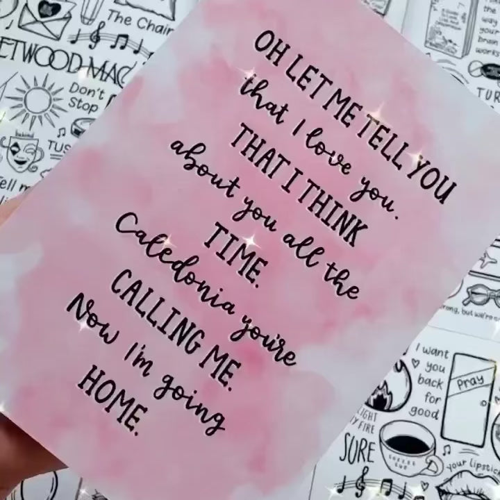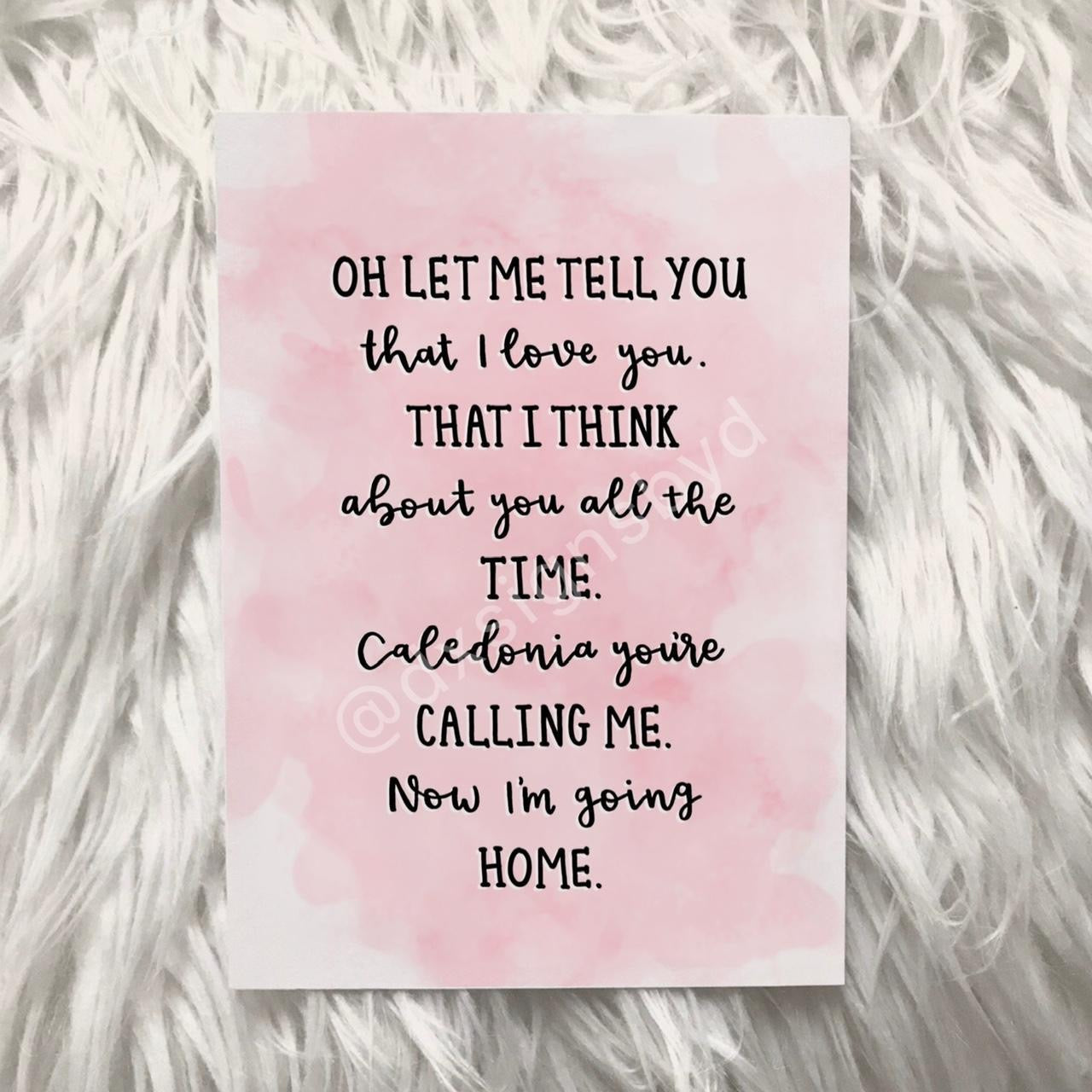 💗Affiche des paroles de Dougie MacLean Caledonia qui comprend les paroles sur un fond aquarelle rose.